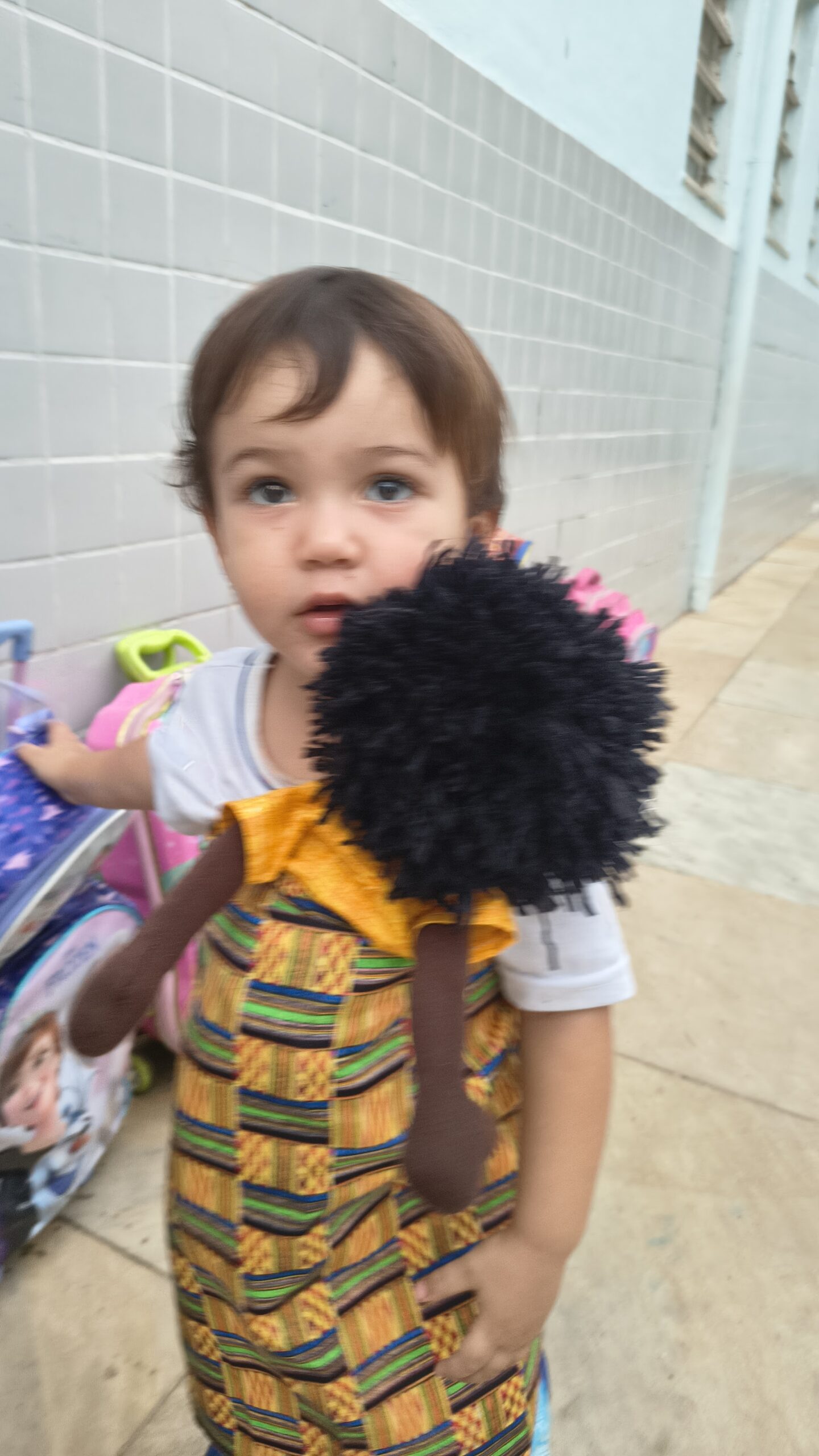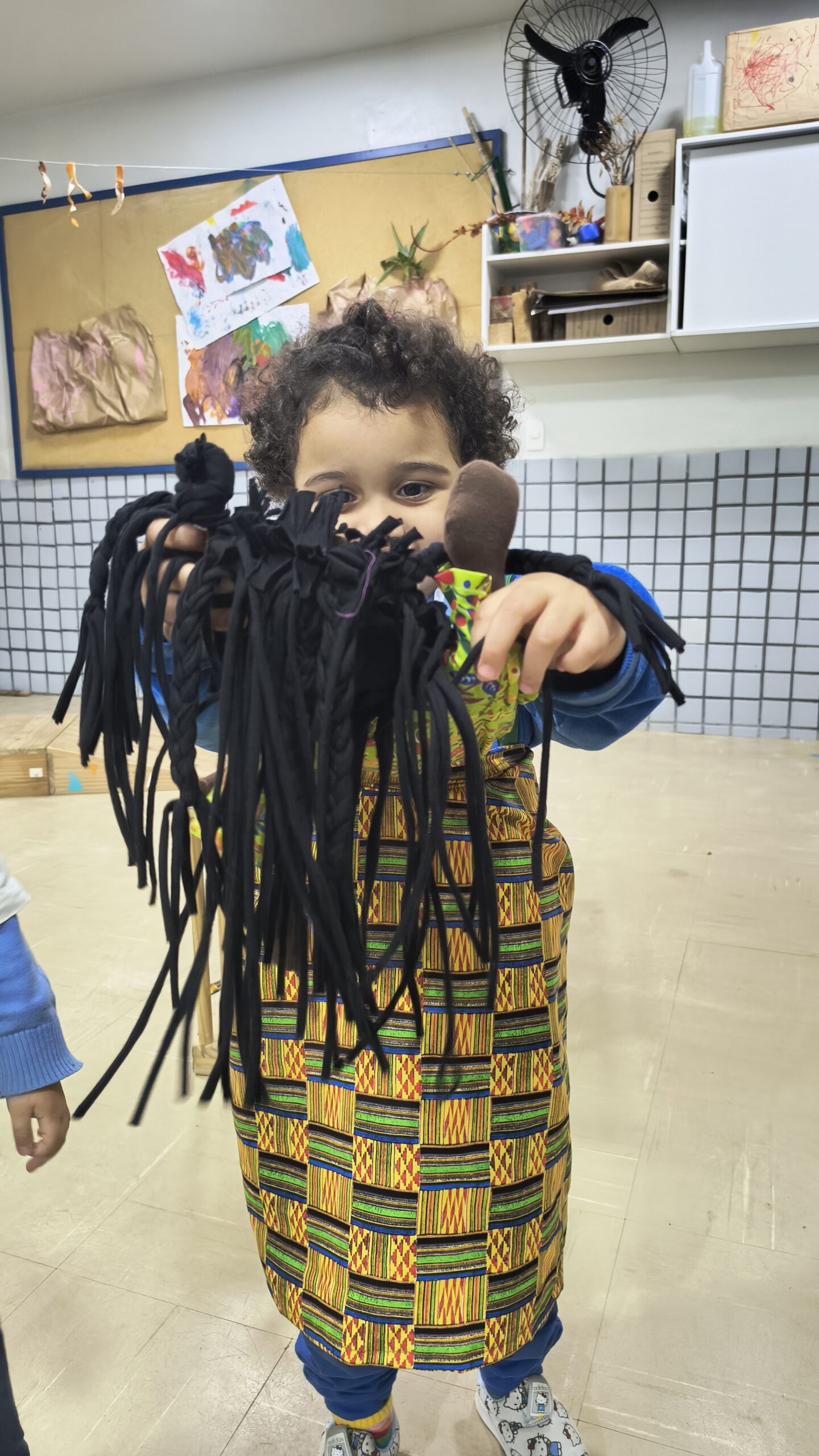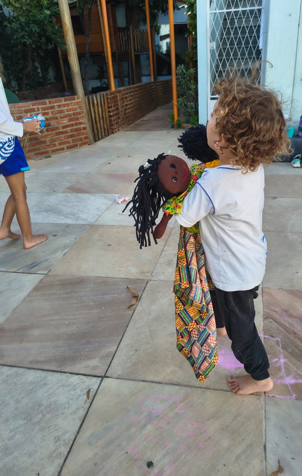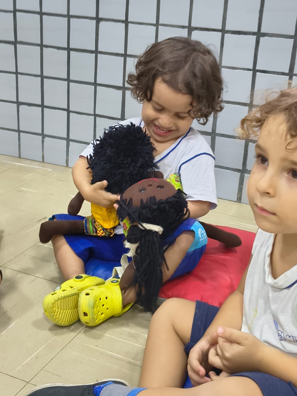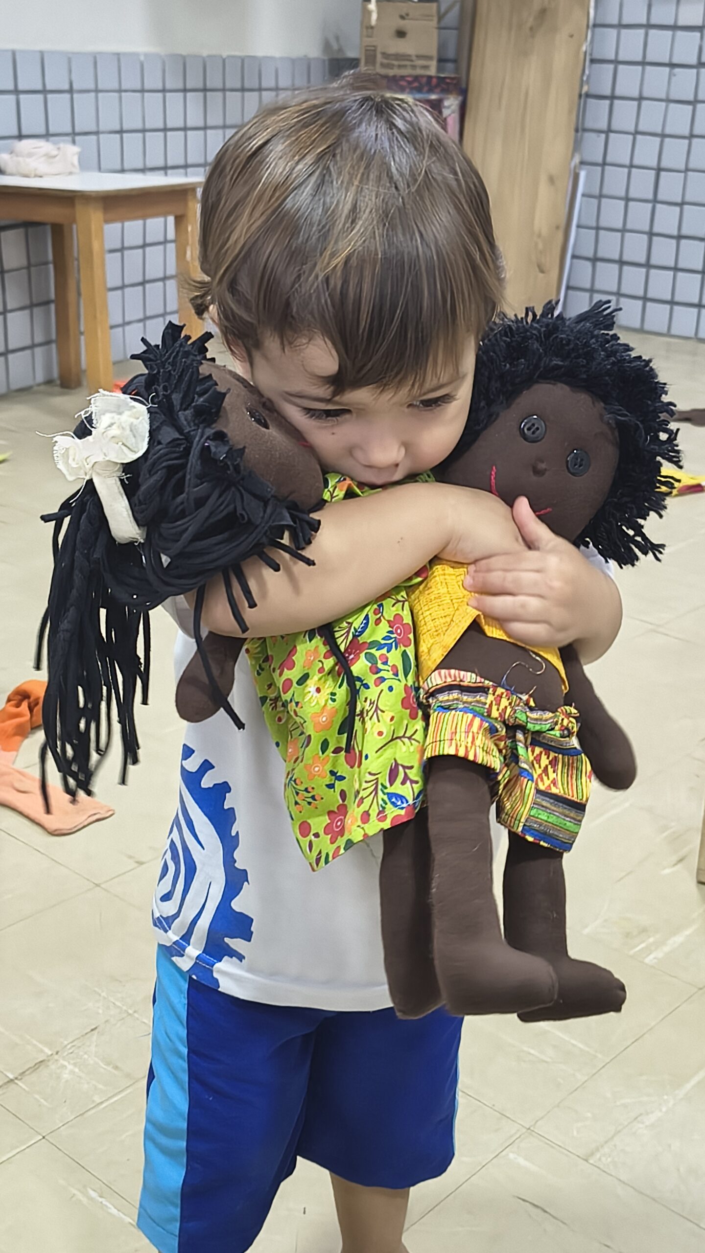 O livro Nós de Axé, da autora Janaína de Figueiredo, com belíssimas ilustrações de Paulica Santos, entre tantos outros títulos, enriqueceram o trabalho antirracista realizado com as turmas Suruí-Paiter manhã e tarde em 2025. Para encantar e envolver as famílias, construímos um boneco negro e uma boneca negra para as crianças levarem para casa. Fizemos sorteios semanais para organizar essas visitas. Enviamos com a boneca e o boneco um saco com um tecido africano e retalhos para a família confeccionar, junto com seu/sua filho/a um “dengo” para retornar para escola e partilharmos em roda. Os bonecos passaram pela casa de todas as crianças da turma.