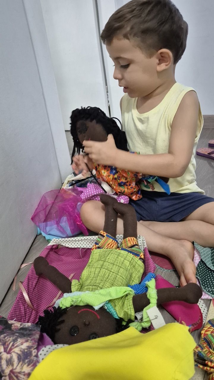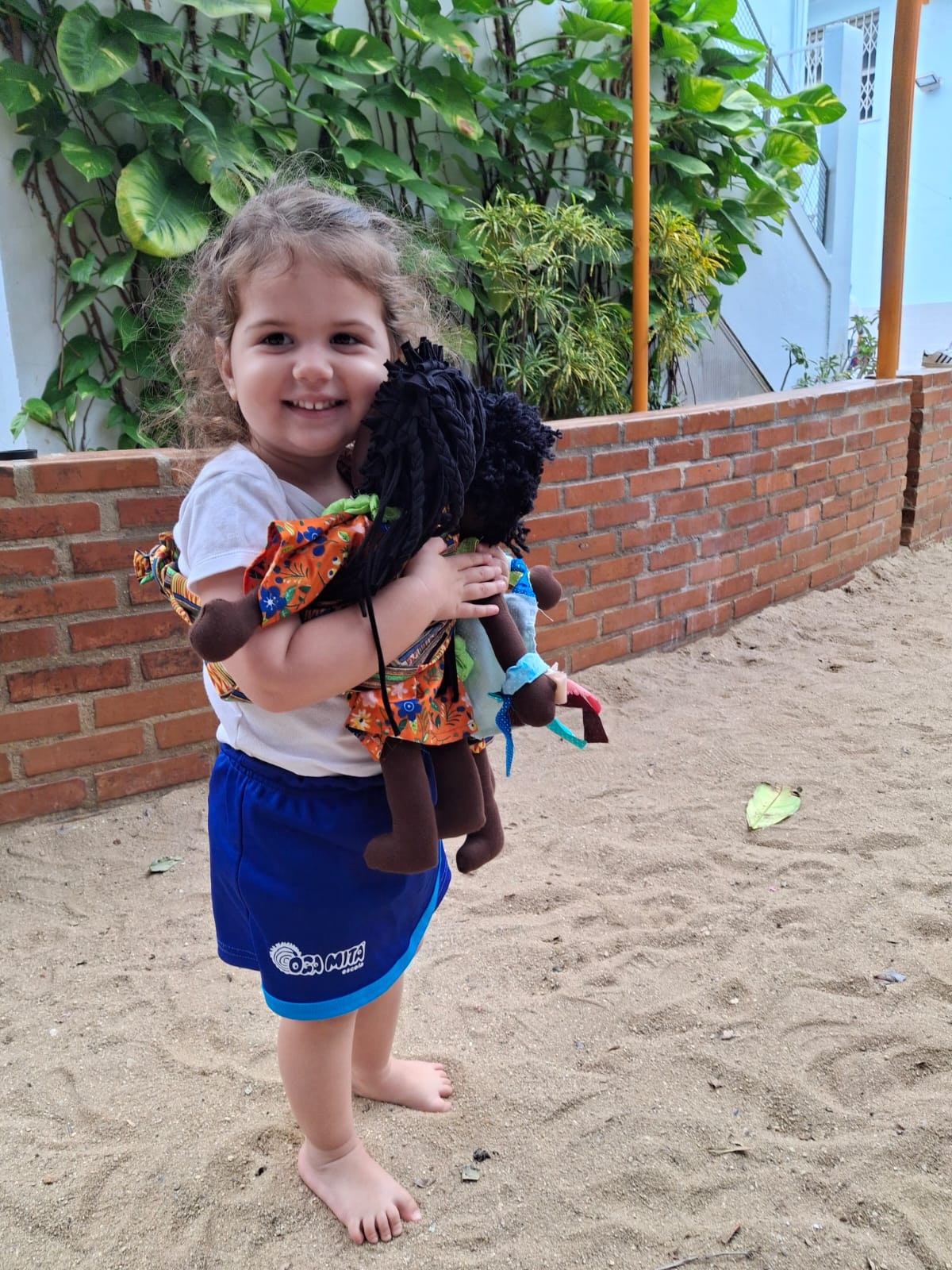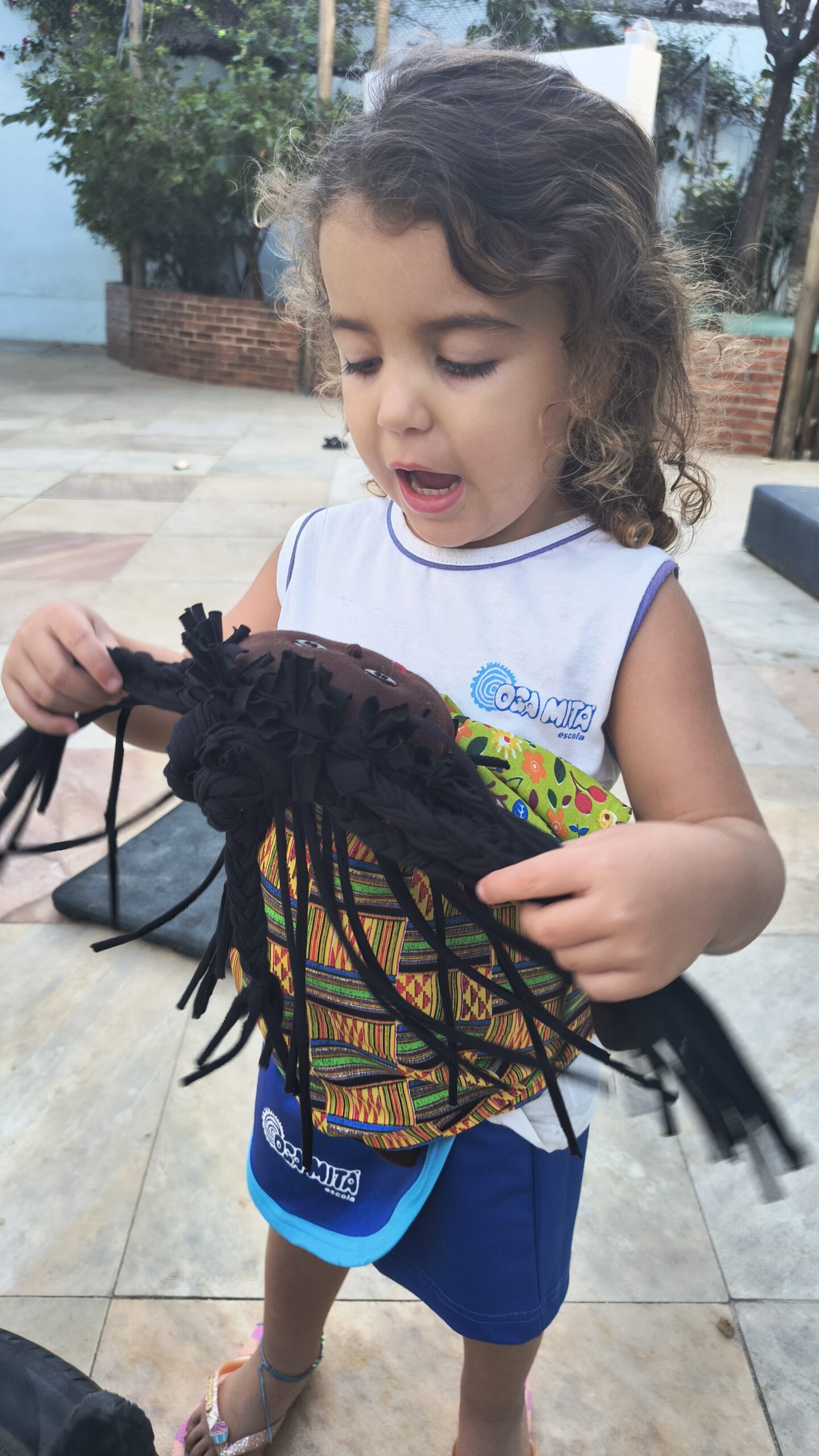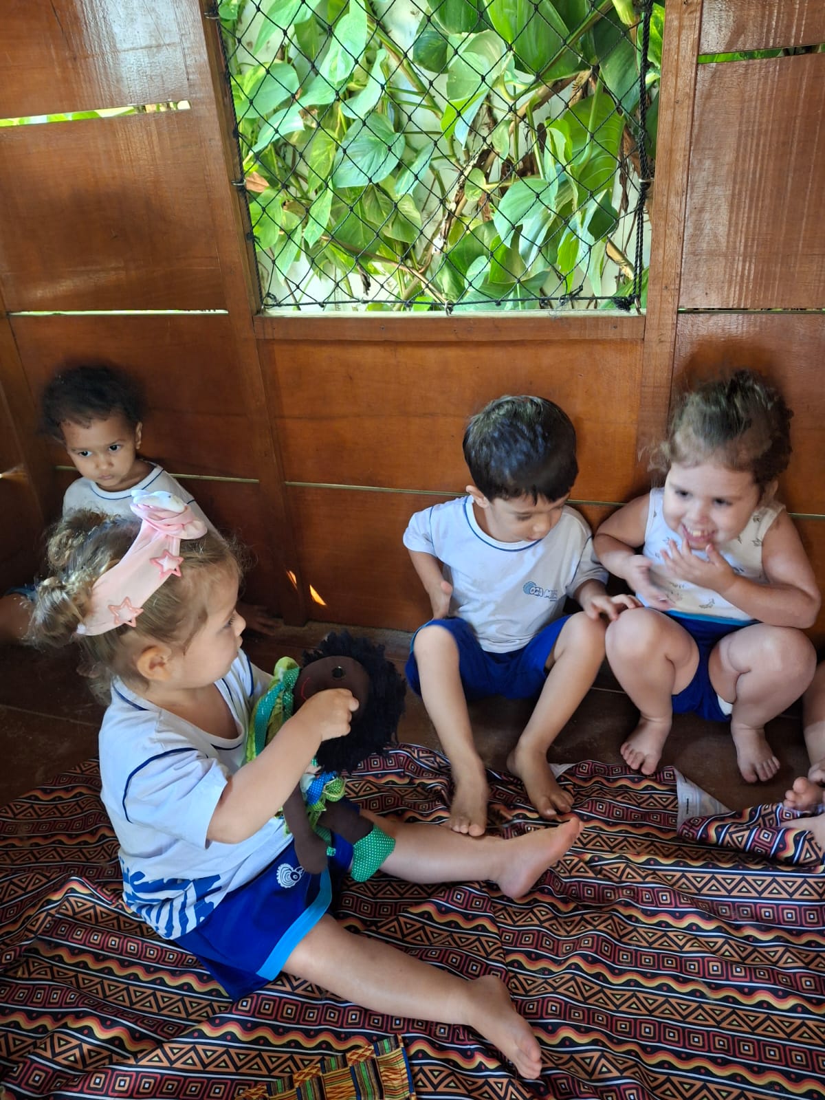 O livro Nós de Axé, da autora Janaína de Figueiredo, com belíssimas ilustrações de Paulica Santos, entre tantos outros títulos, enriqueceram o trabalho antirracista realizado com as turmas Suruí-Paiter manhã e tarde em 2025. Para encantar e envolver as famílias, construímos um boneco negro e uma boneca negra para as crianças levarem para casa. Fizemos sorteios semanais para organizar essas visitas. Enviamos com a boneca e o boneco um saco com um tecido africano e retalhos para a família confeccionar, junto com seu/sua filho/a um “dengo” para retornar para escola e partilharmos em roda. Os bonecos passaram pela casa de todas as crianças da turma.