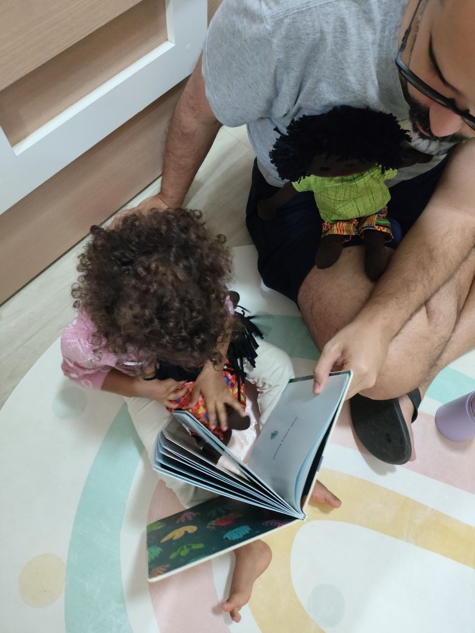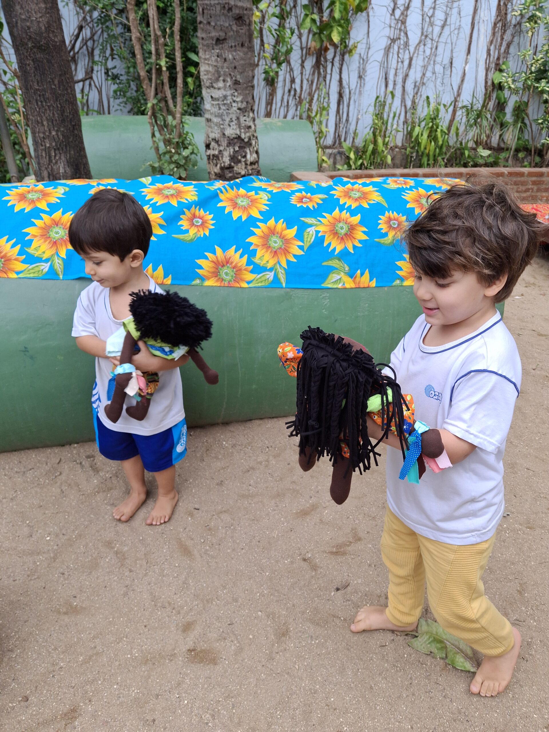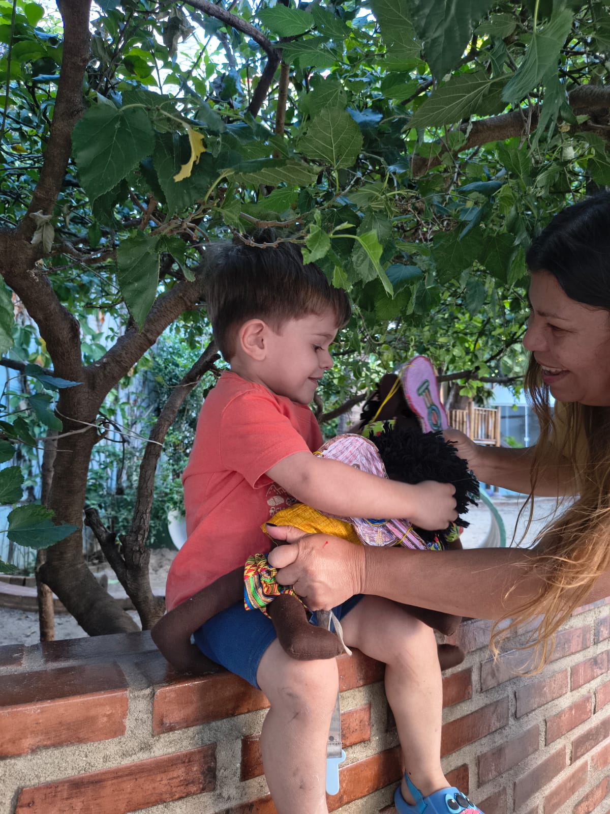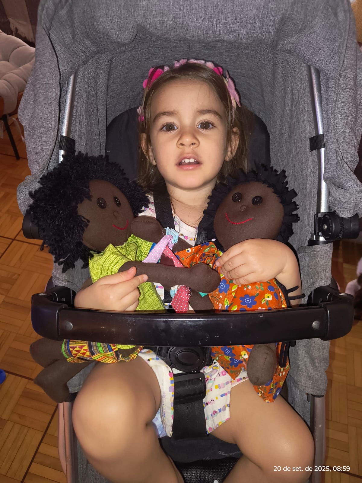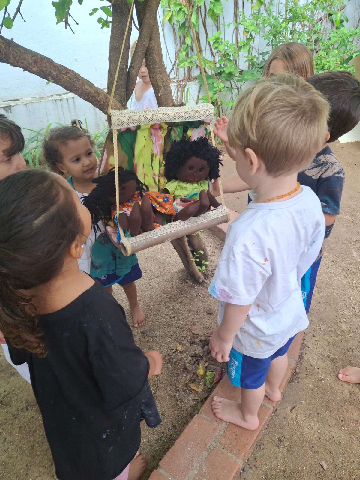 O livro Nós de Axé, da autora Janaína de Figueiredo, com belíssimas ilustrações de Paulica Santos, entre tantos outros títulos, enriqueceram o trabalho antirracista realizado com as turmas Suruí-Paiter manhã e tarde em 2025. Para encantar e envolver as famílias, construímos um boneco negro e uma boneca negra para as crianças levarem para casa. Fizemos sorteios semanais para organizar essas visitas. Enviamos com a boneca e o boneco um saco com um tecido africano e retalhos para a família confeccionar, junto com seu/sua filho/a um “dengo” para retornar para escola e partilharmos em roda. Os bonecos passaram pela casa de todas as crianças da turma.