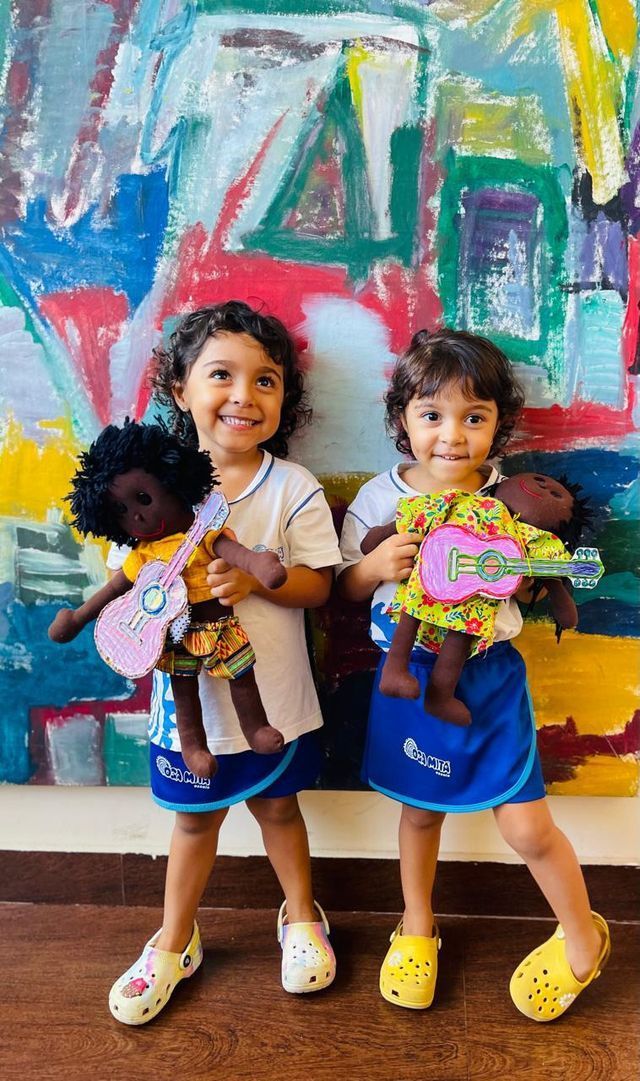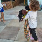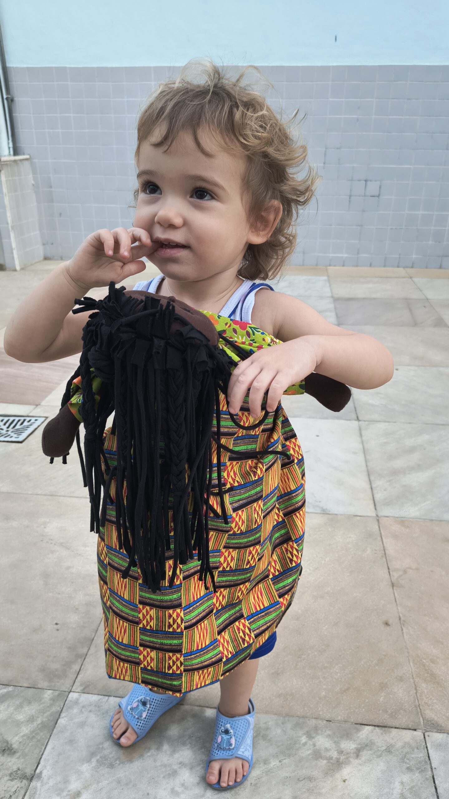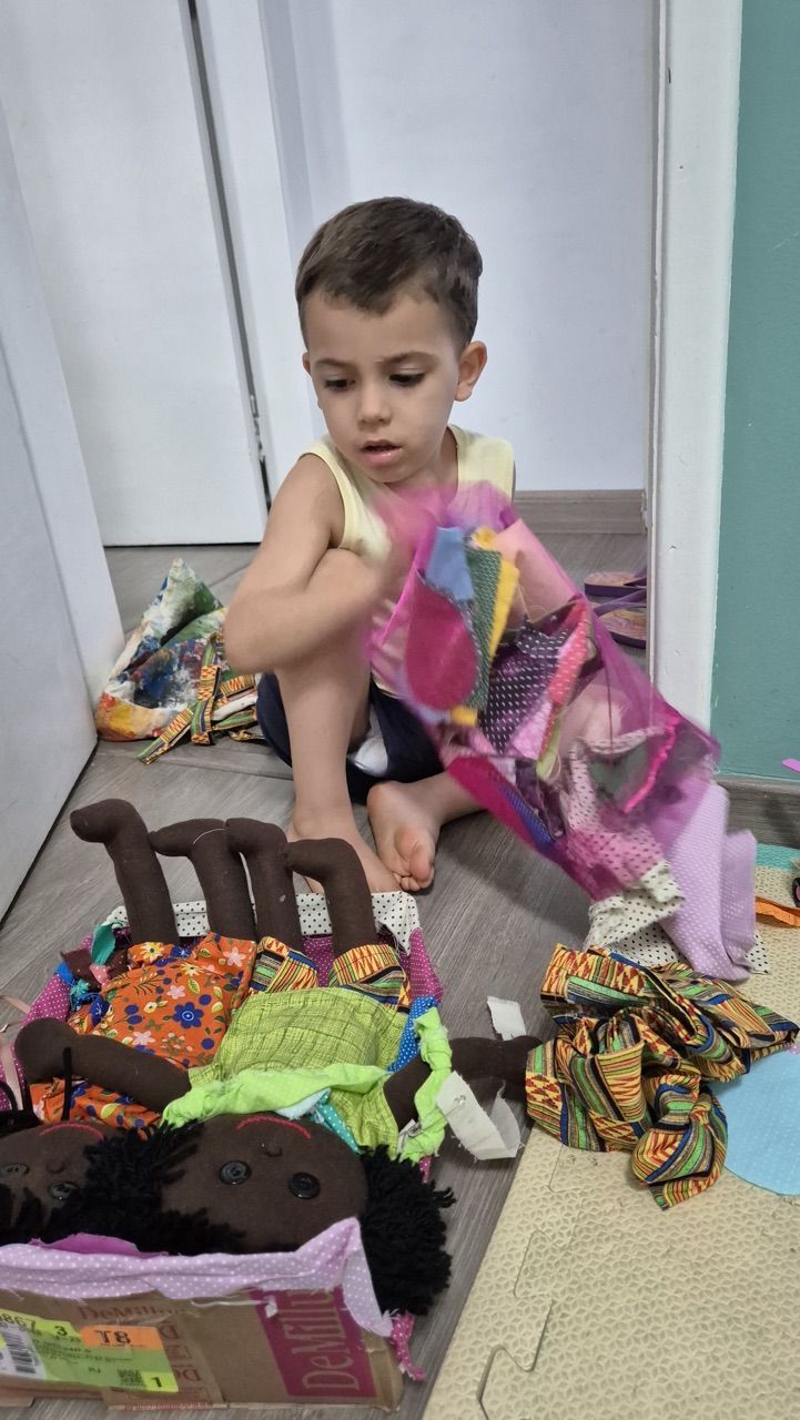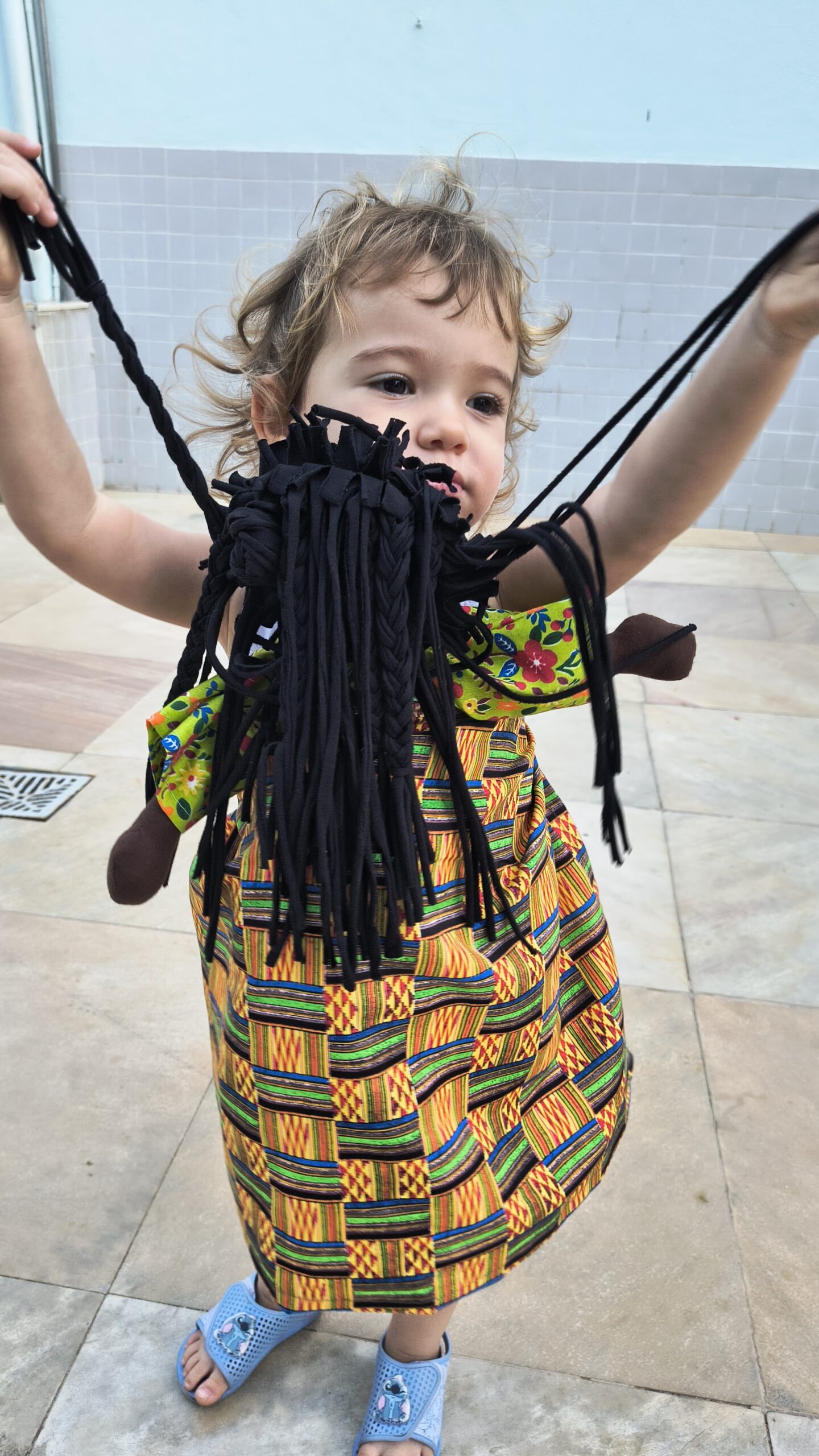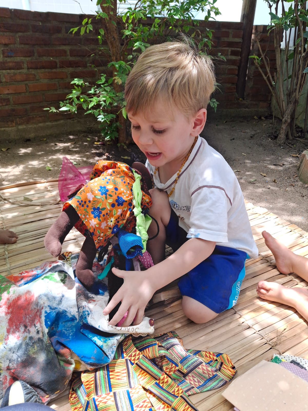 O livro Nós de Axé, da autora Janaína de Figueiredo, com belíssimas ilustrações de Paulica Santos, entre tantos outros títulos, enriqueceram o trabalho antirracista realizado com as turmas Suruí-Paiter manhã e tarde em 2025. Para encantar e envolver as famílias, construímos um boneco negro e uma boneca negra para as crianças levarem para casa. Fizemos sorteios semanais para organizar essas visitas. Enviamos com a boneca e o boneco um saco com um tecido africano e retalhos para a família confeccionar, junto com seu/sua filho/a um “dengo” para retornar para escola e partilharmos em roda. Os bonecos passaram pela casa de todas as crianças da turma.