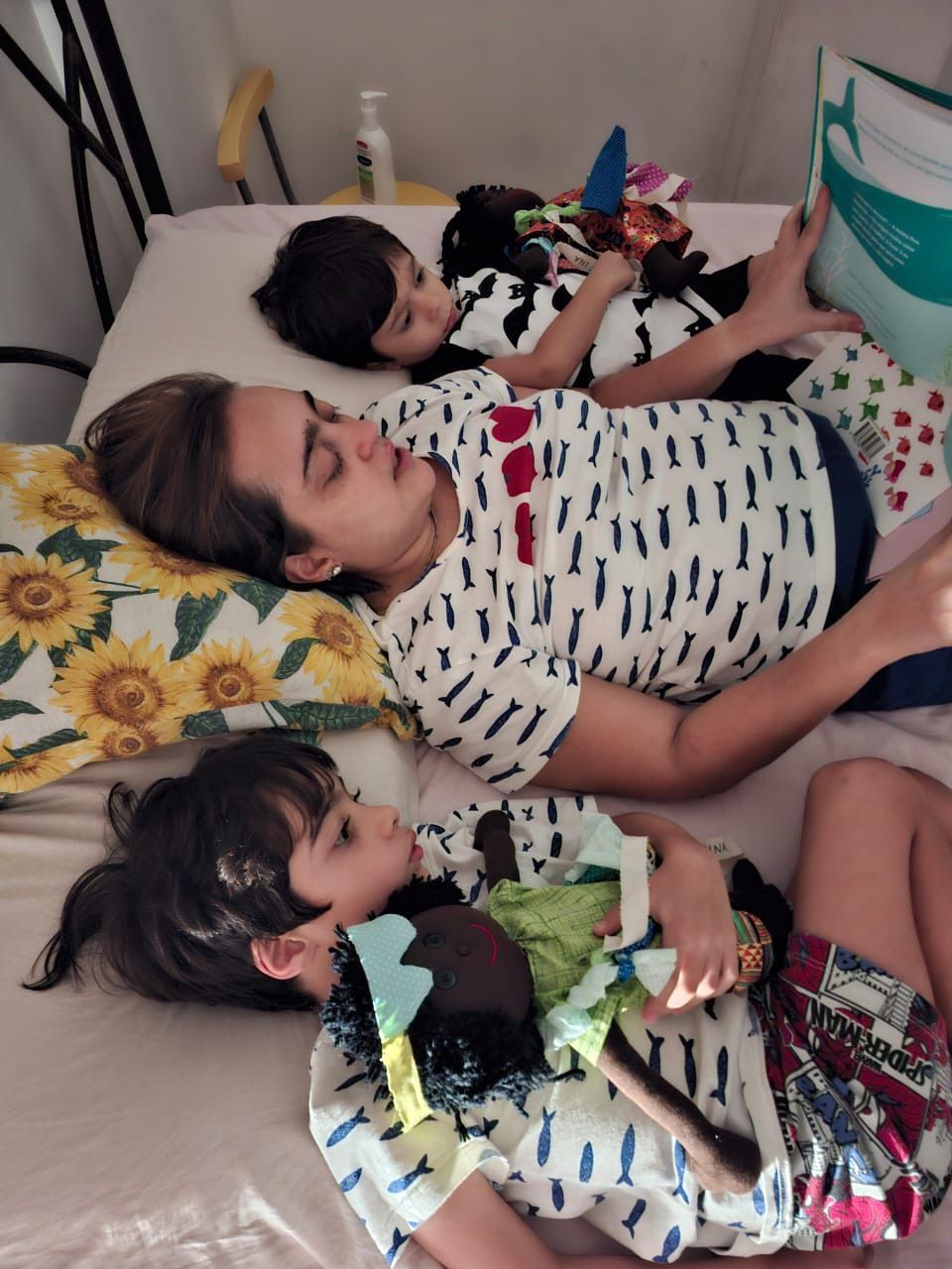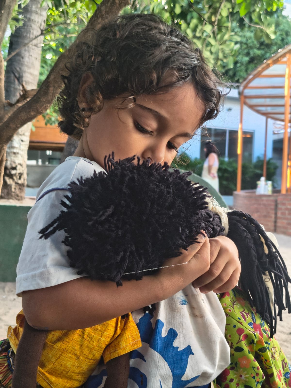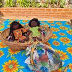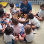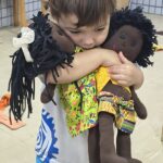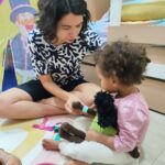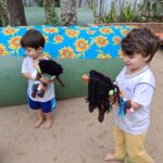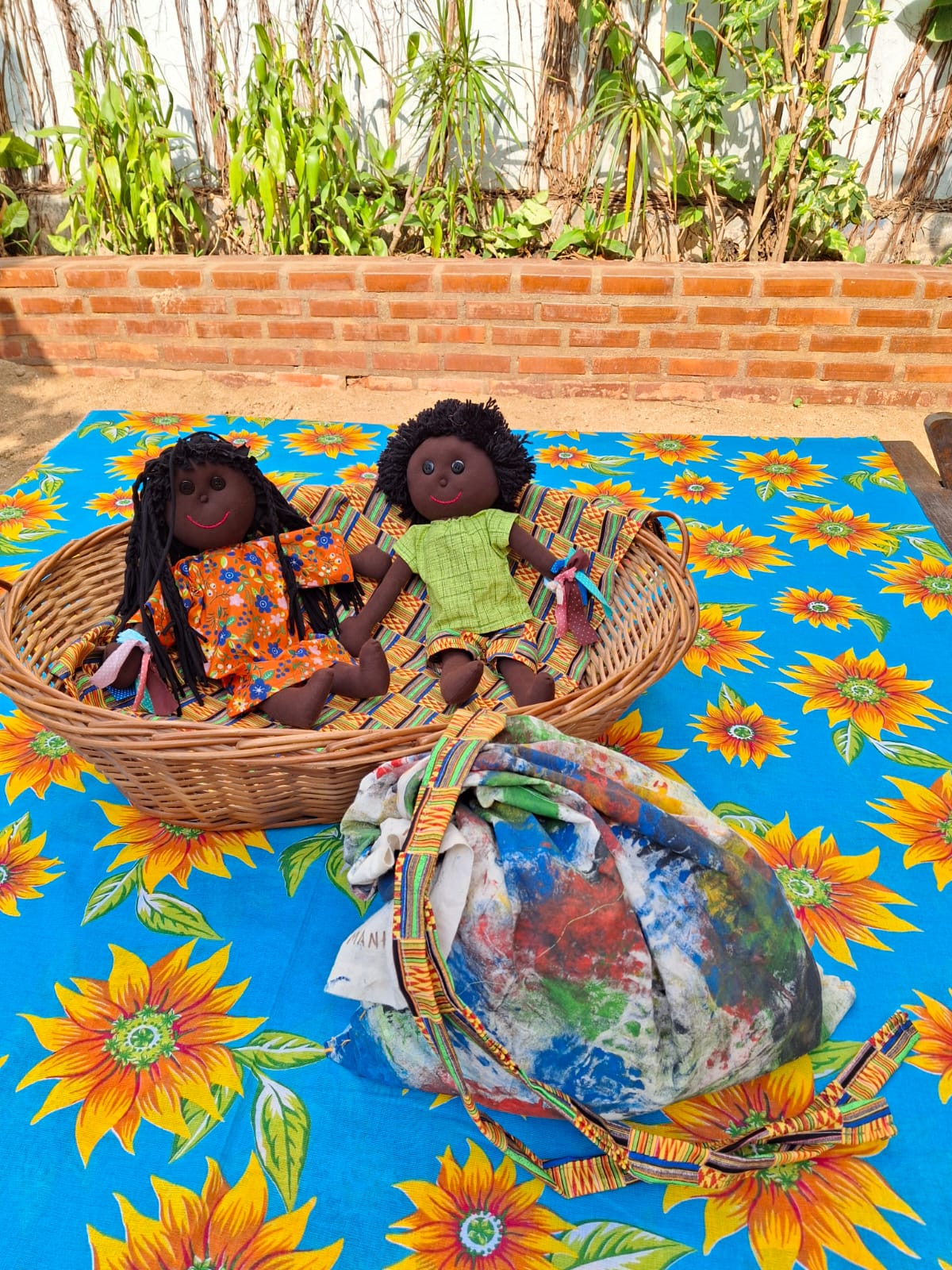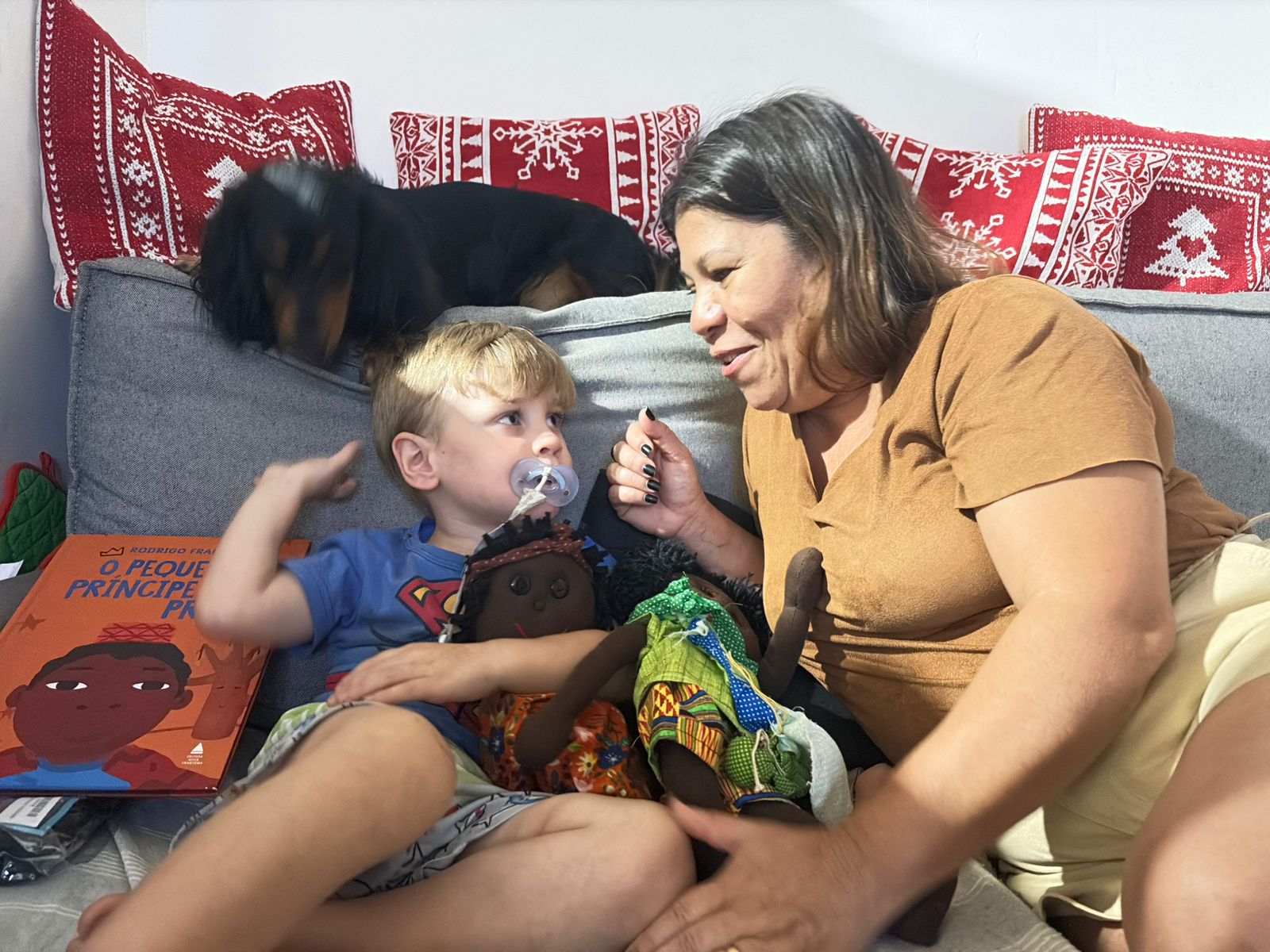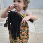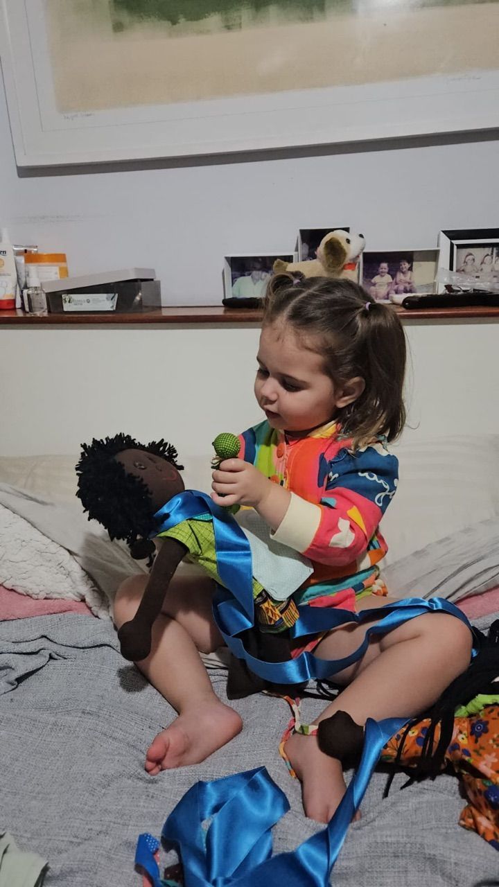 O livro Nós de Axé, da autora Janaína de Figueiredo, com belíssimas ilustrações de Paulica Santos, entre tantos outros títulos, enriqueceram o trabalho antirracista realizado com as turmas Suruí-Paiter manhã e tarde em 2025. Para encantar e envolver as famílias, construímos um boneco negro e uma boneca negra para as crianças levarem para casa. Fizemos sorteios semanais para organizar essas visitas. Enviamos com a boneca e o boneco um saco com um tecido africano e retalhos para a família confeccionar, junto com seu/sua filho/a um “dengo” para retornar para escola e partilharmos em roda. Os bonecos passaram pela casa de todas as crianças da turma.