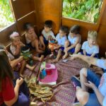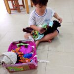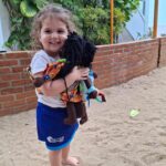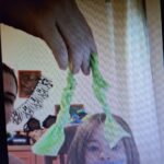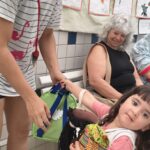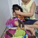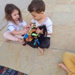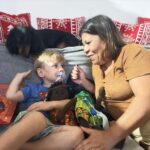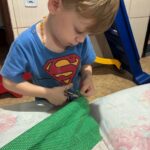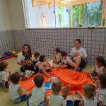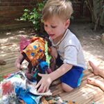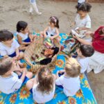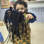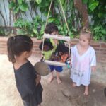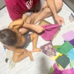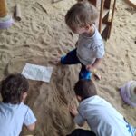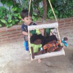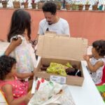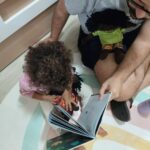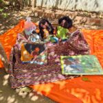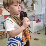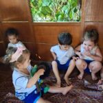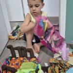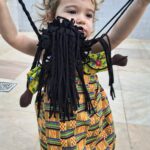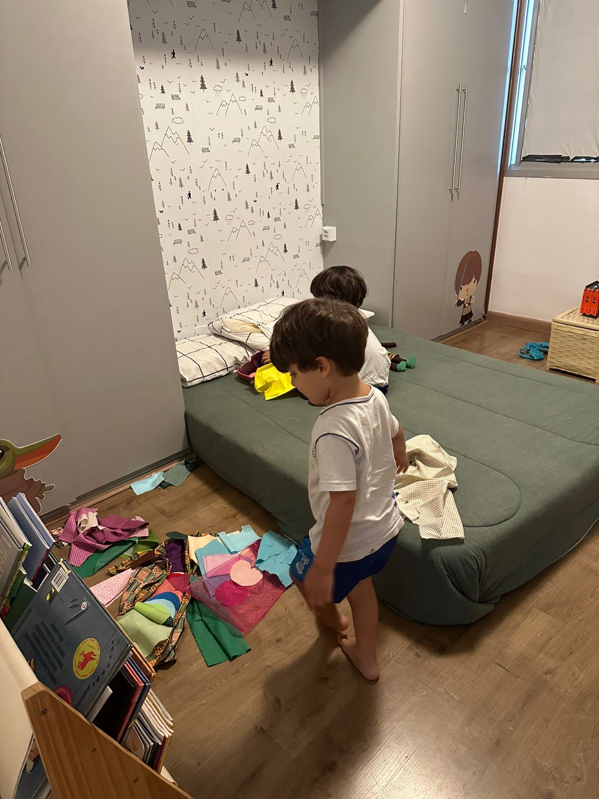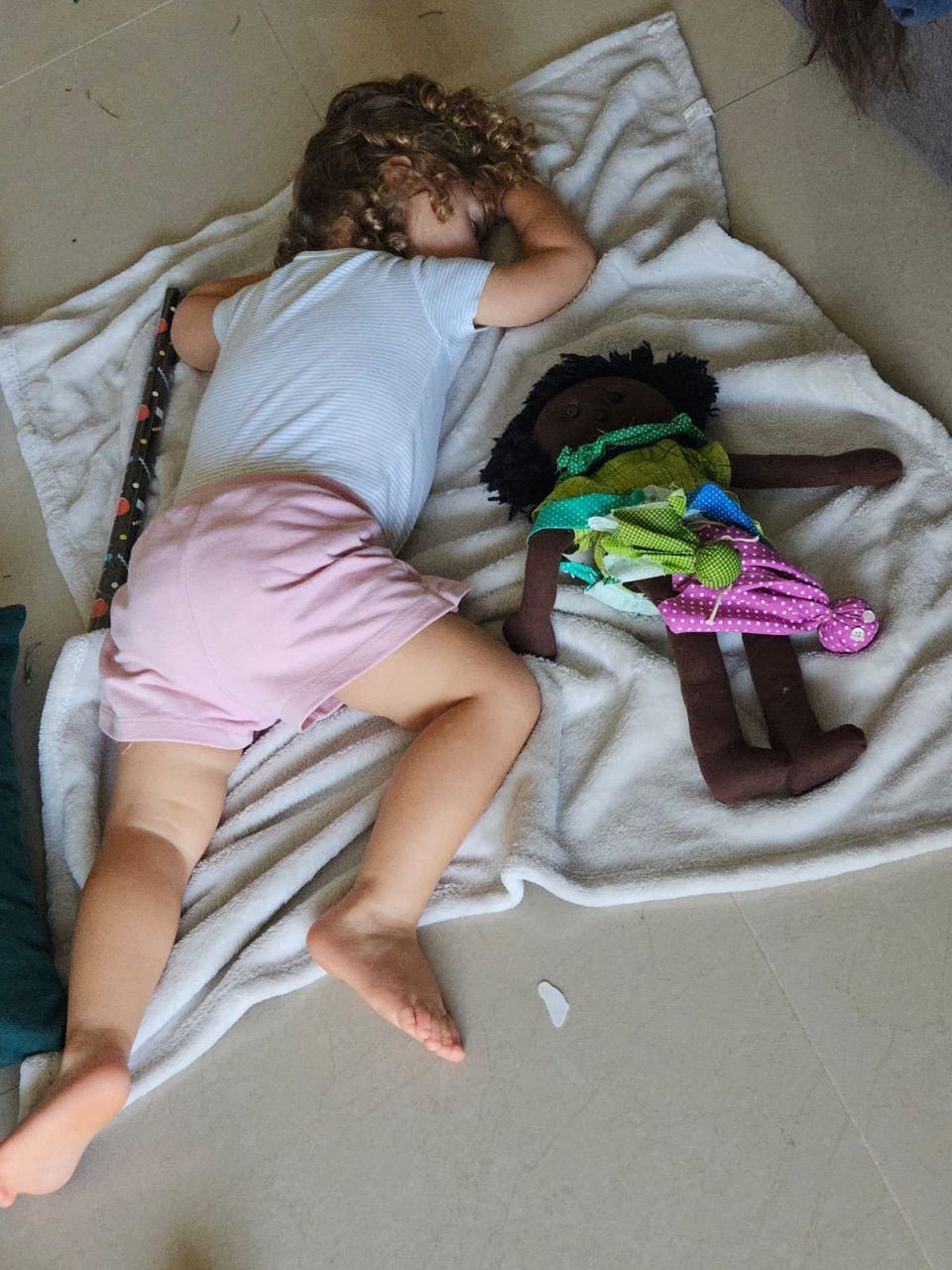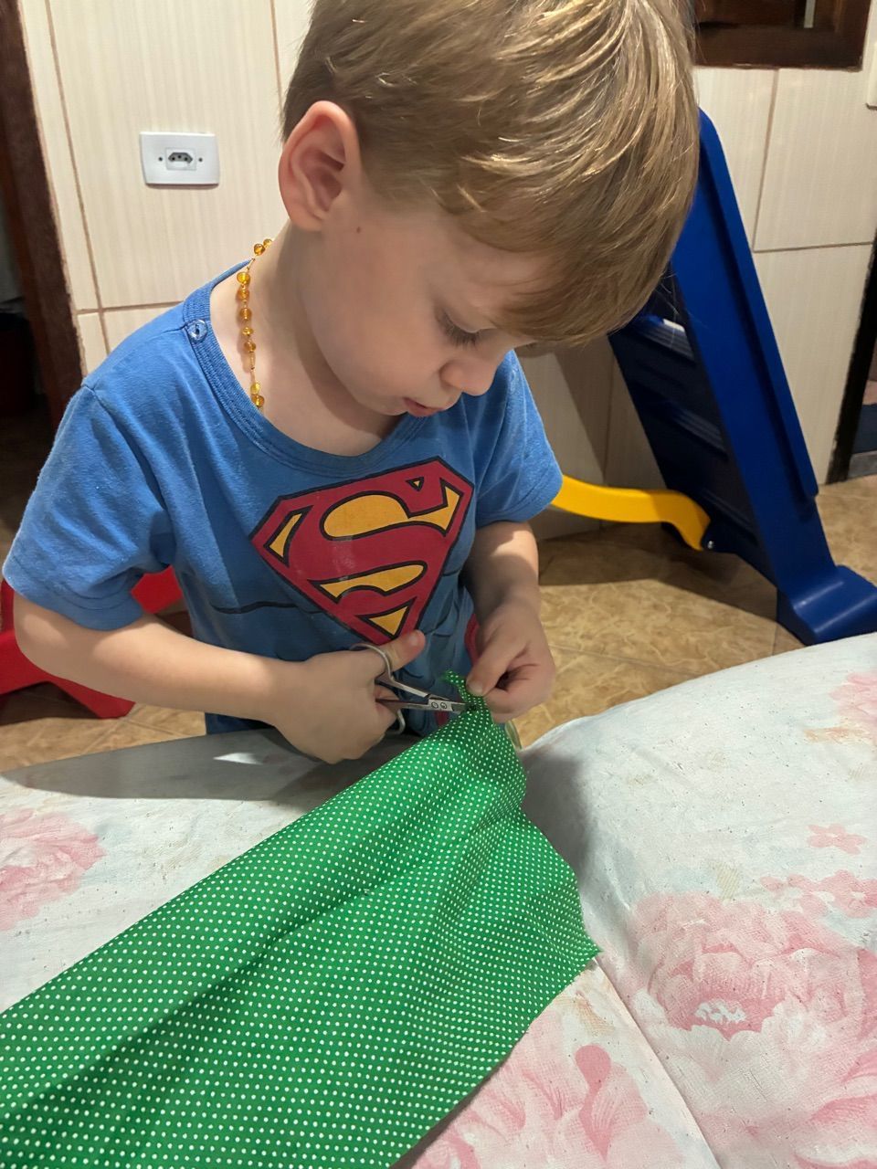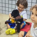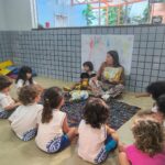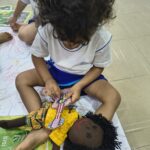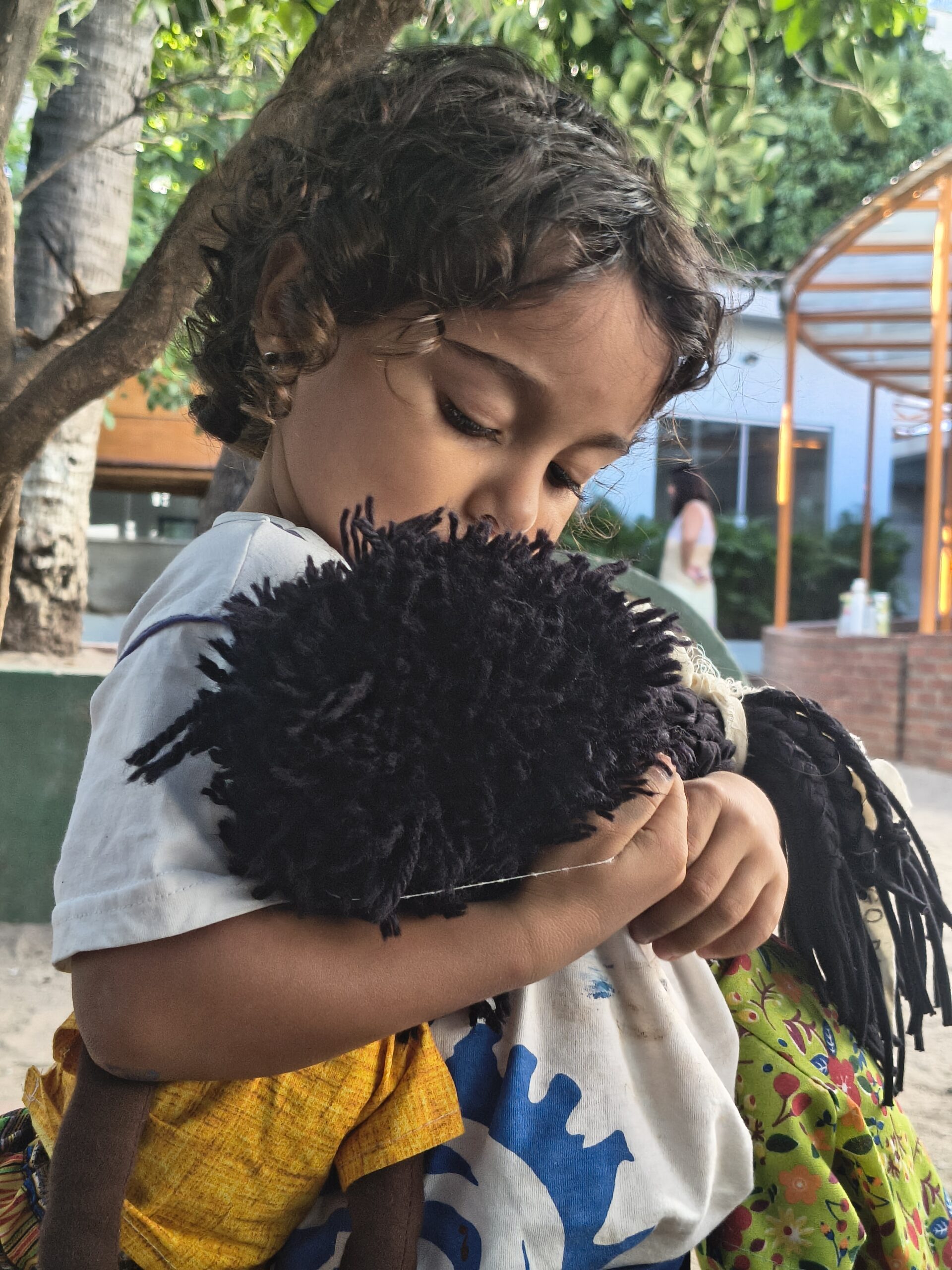 O livro Nós de Axé, da autora Janaína de Figueiredo, com belíssimas ilustrações de Paulica Santos, entre tantos outros títulos, enriqueceram o trabalho antirracista realizado com as turmas Suruí-Paiter manhã e tarde em 2025. Para encantar e envolver as famílias, construímos um boneco negro e uma boneca negra para as crianças levarem para casa. Fizemos sorteios semanais para organizar essas visitas. Enviamos com a boneca e o boneco um saco com um tecido africano e retalhos para a família confeccionar, junto com seu/sua filho/a um “dengo” para retornar para escola e partilharmos em roda. Os bonecos passaram pela casa de todas as crianças da turma.