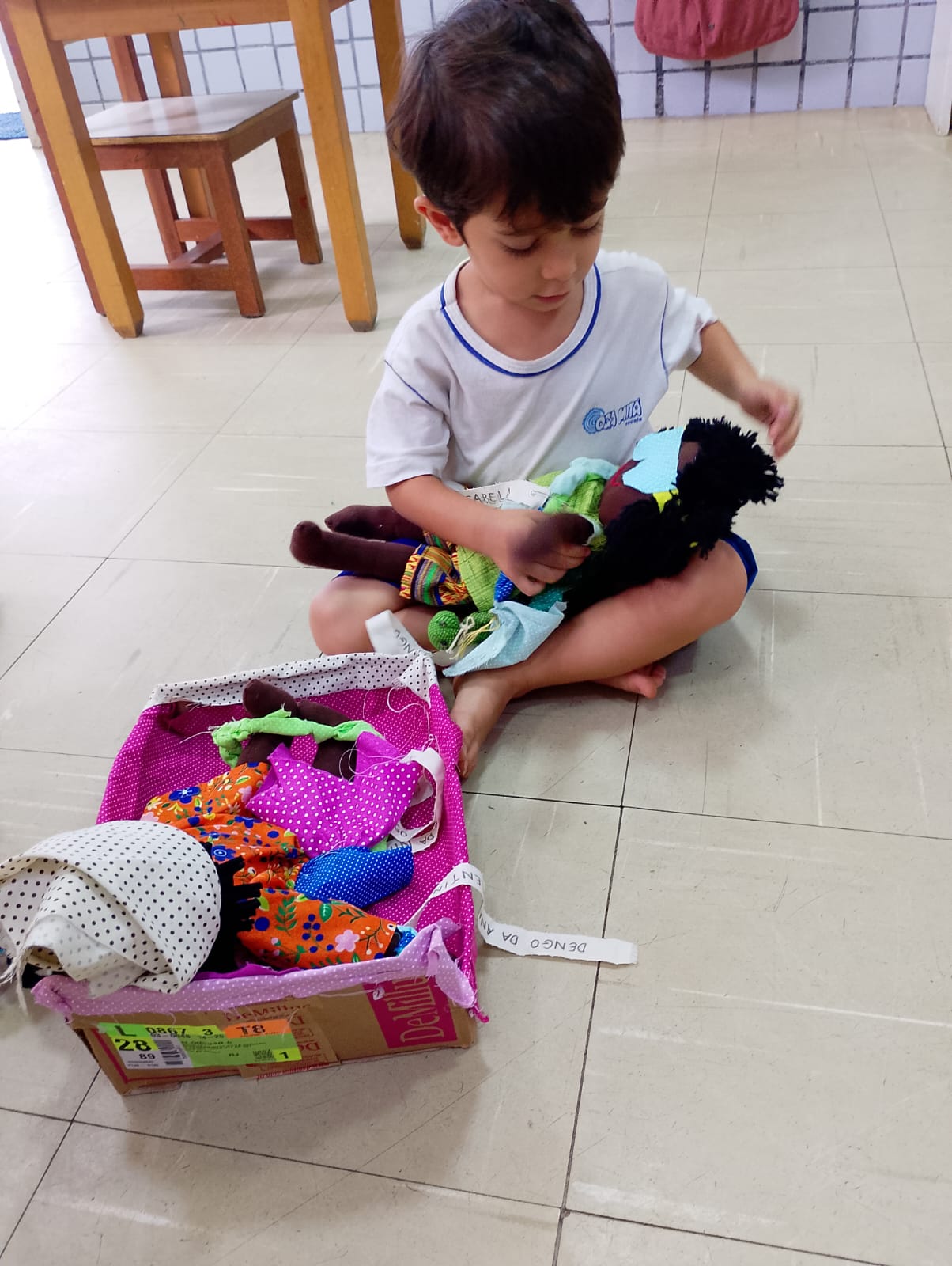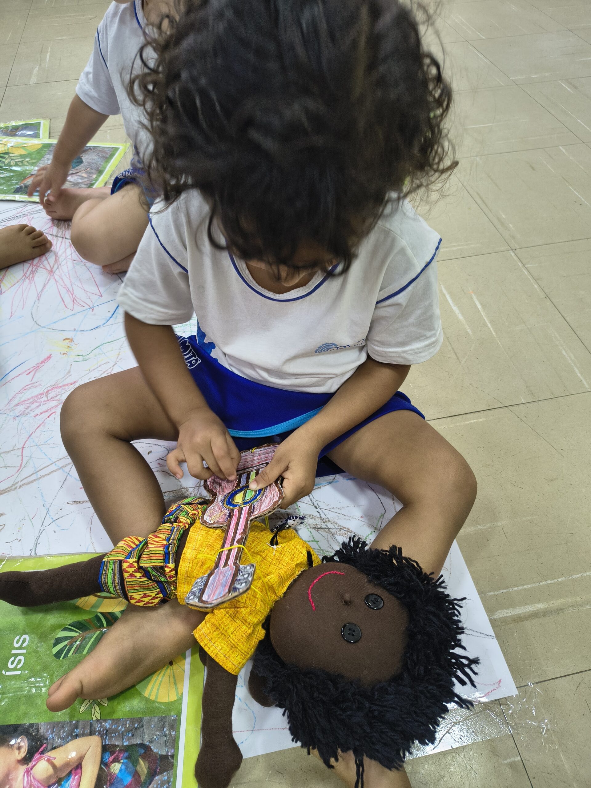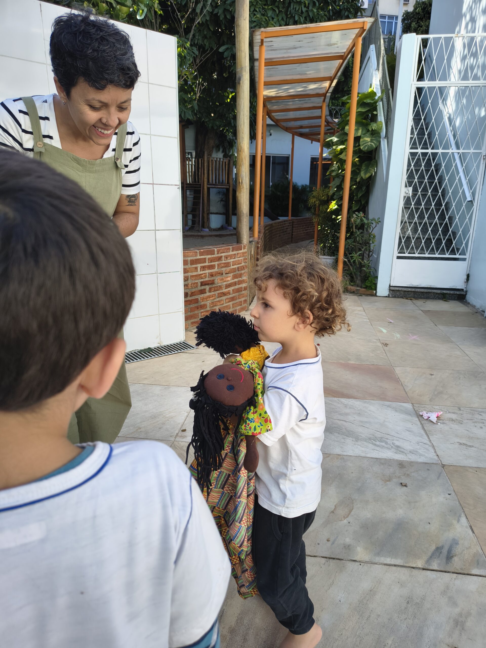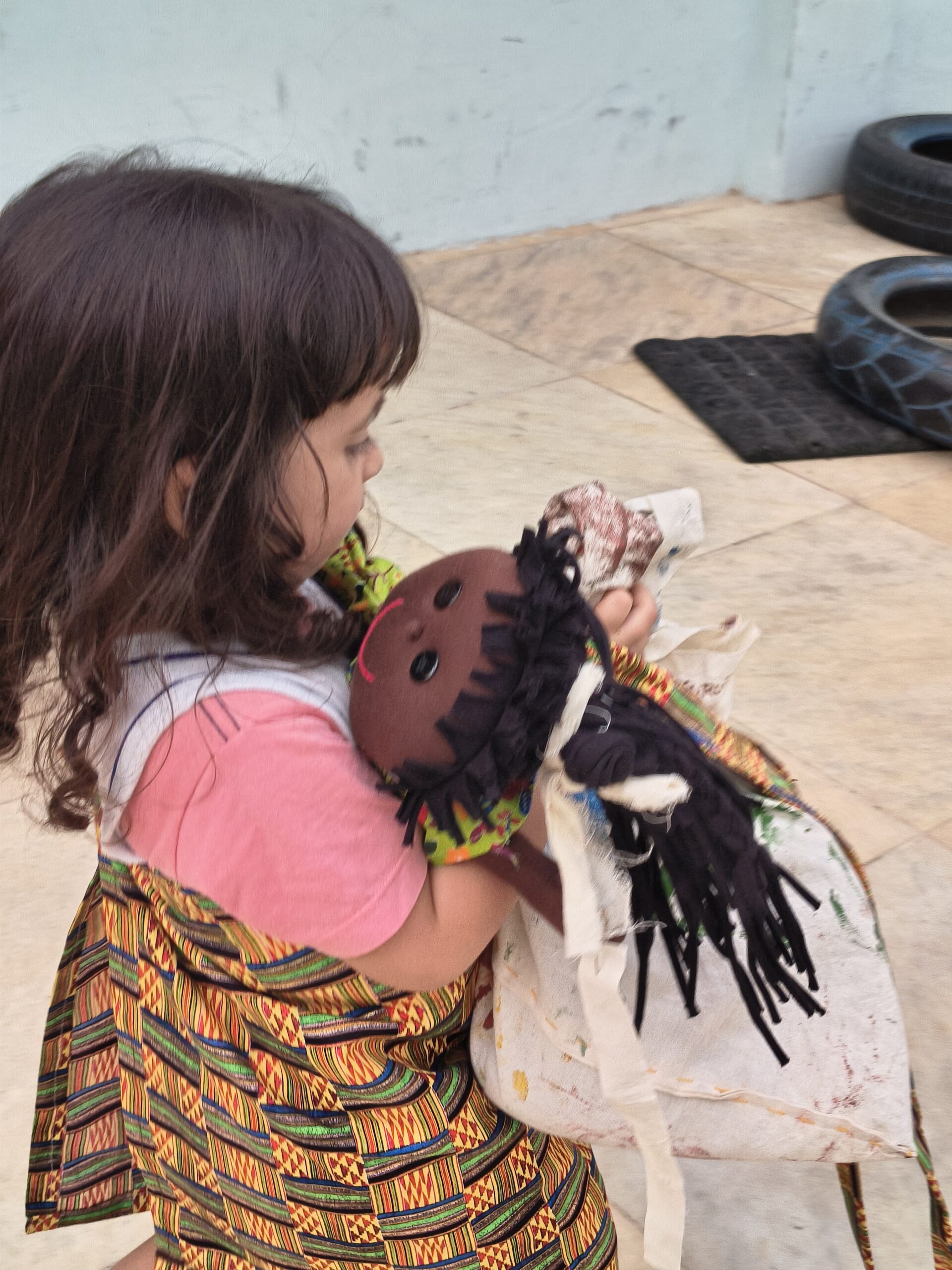 A brincadeira com bonecos e bonecas pretas, envolvidos/as por lenços, tecidos, cestos e o próprio colo, desenvolve na criança a afetividade e desperta o aprender pelo encantamento. Desde bem pequenas, elas começam a perceber a si mesmas e ao outro e, nesse processo, com suas singularidades, aprendem a viver em meio à diversidade.