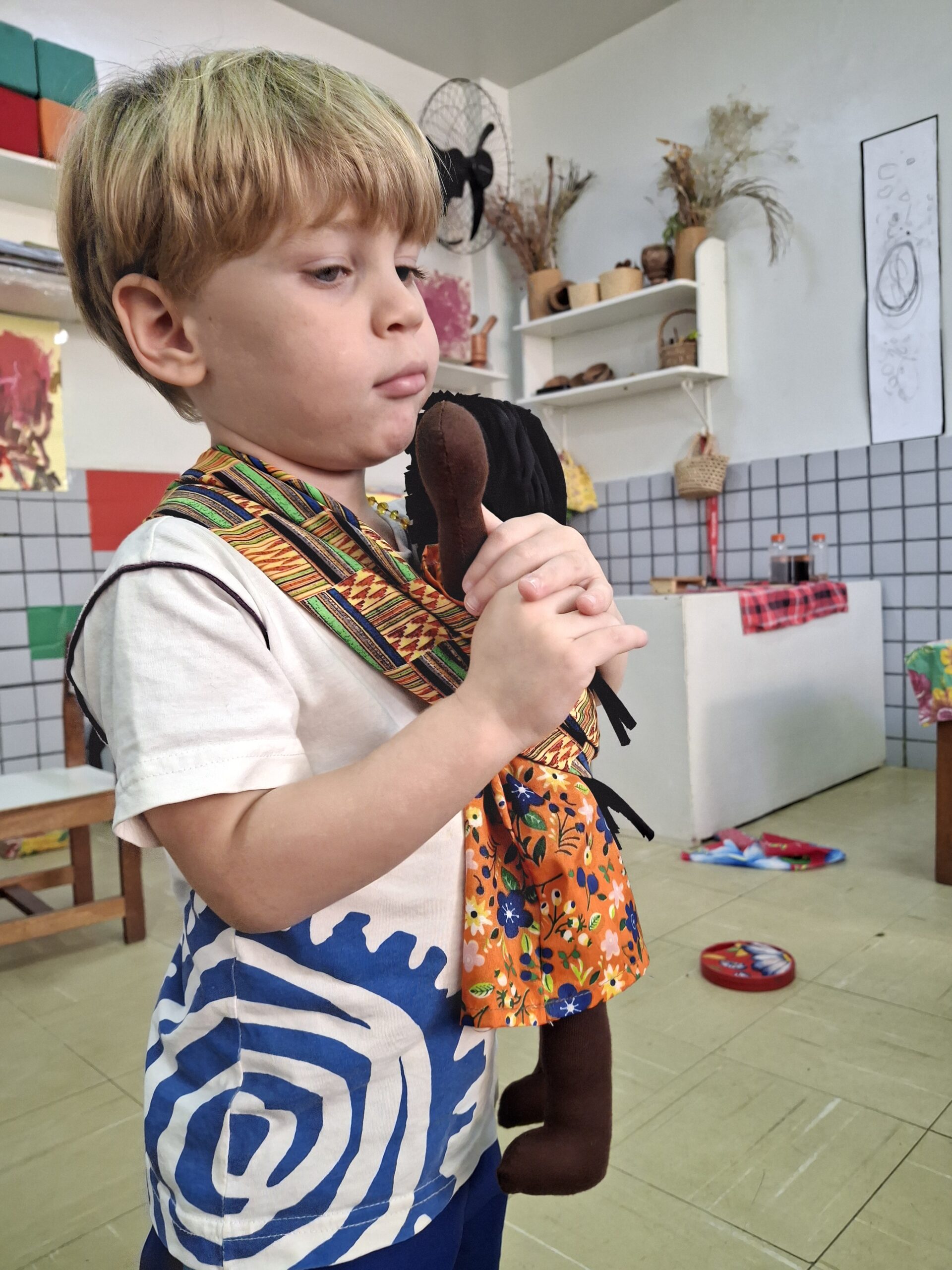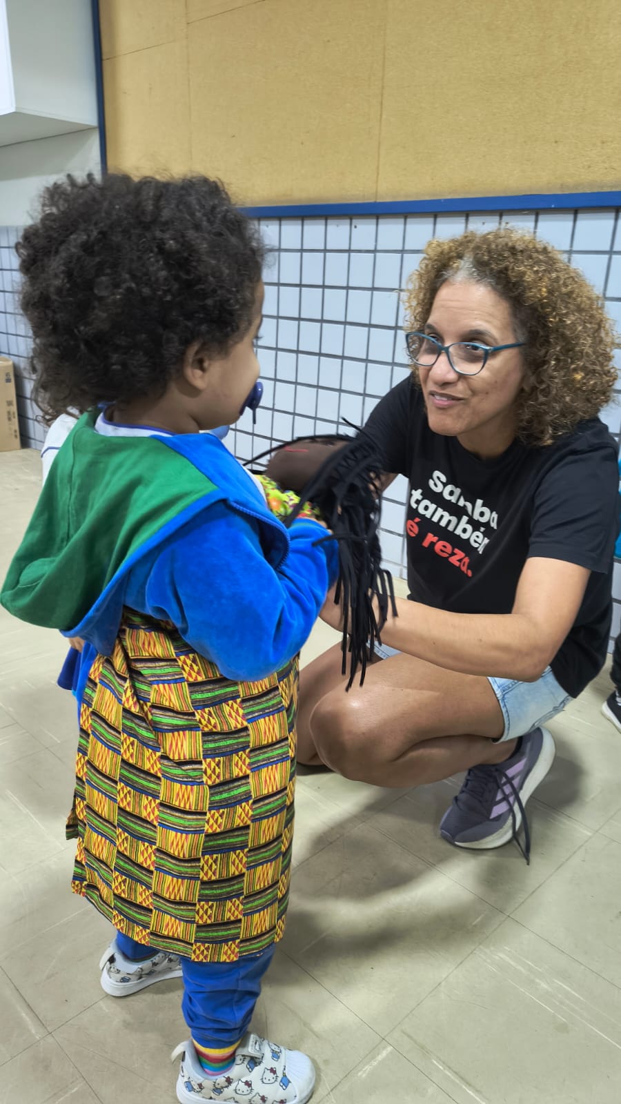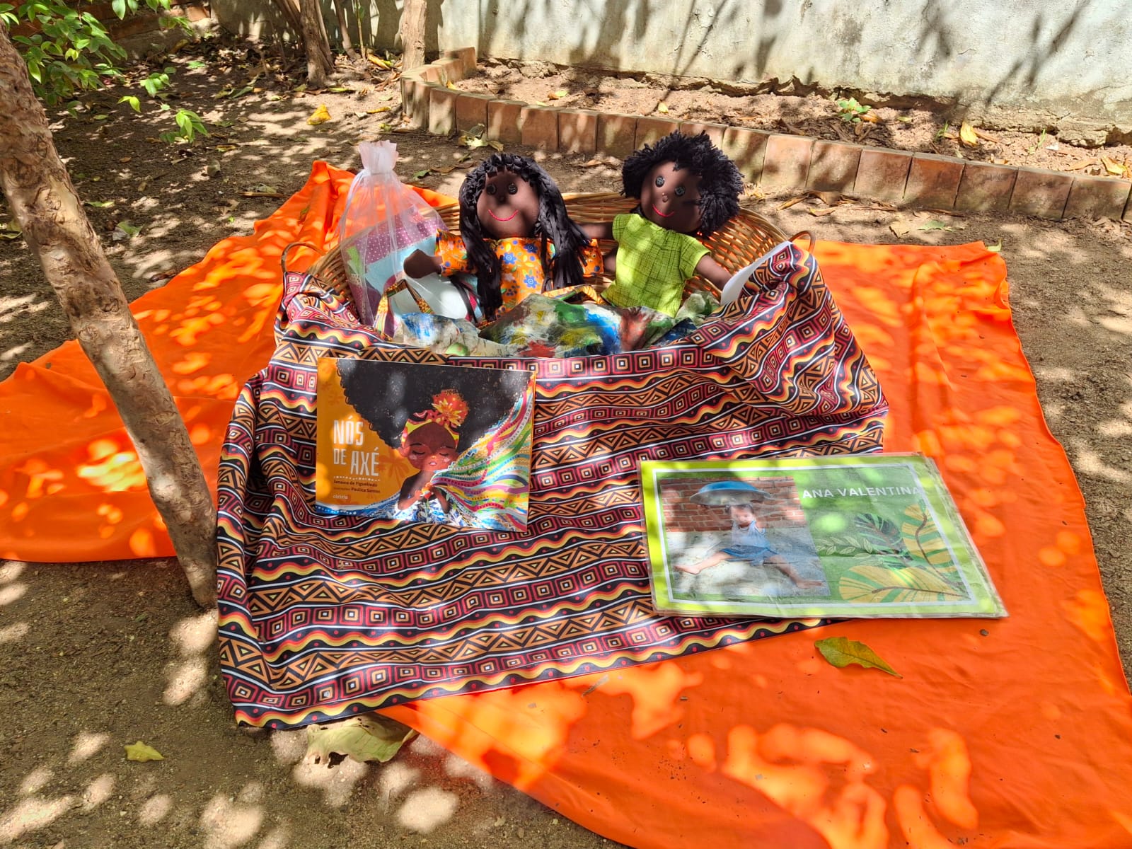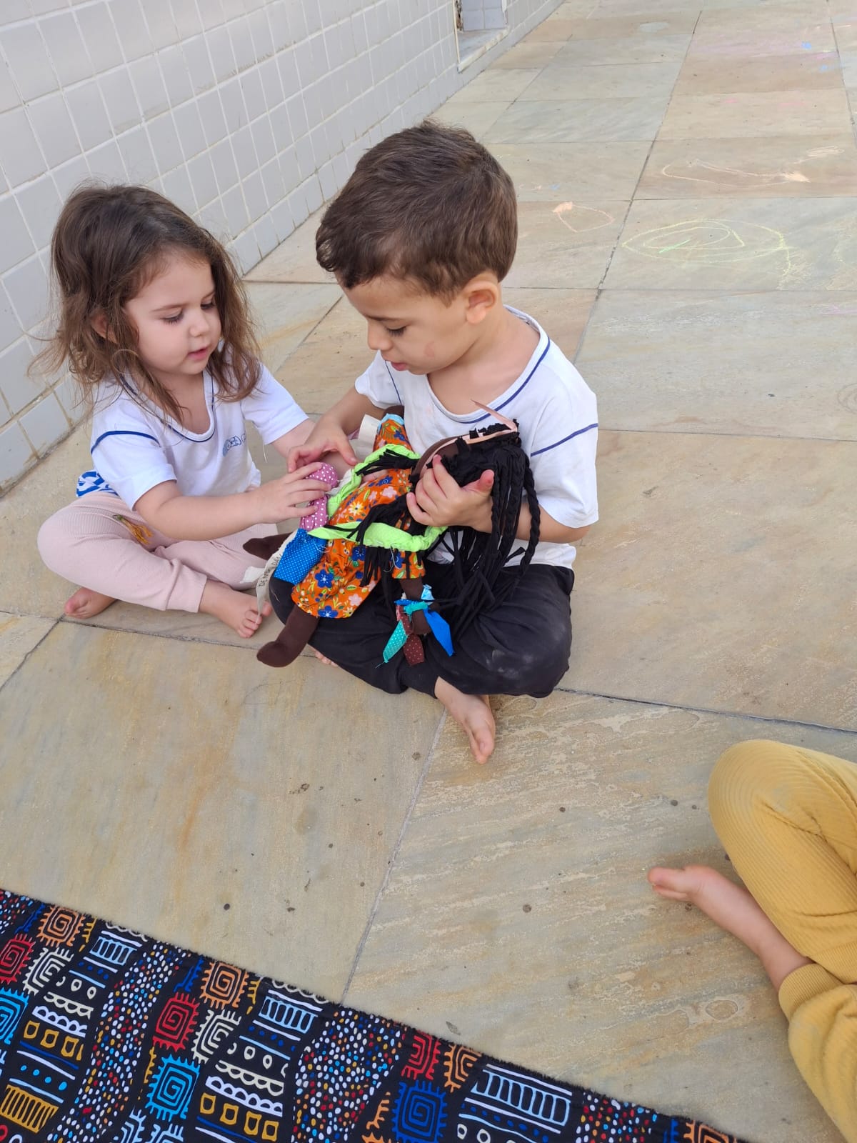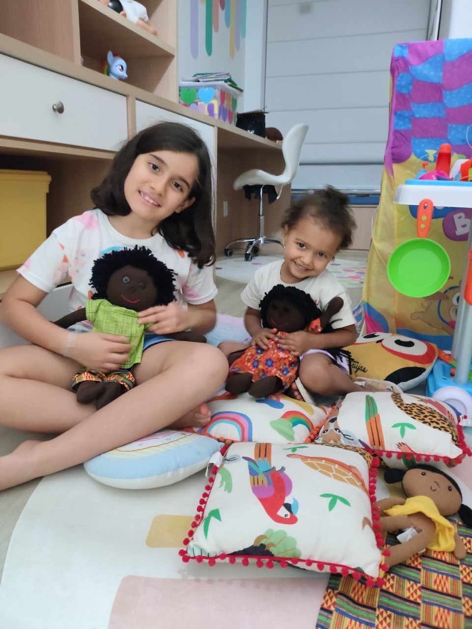A brincadeira com bonecos e bonecas pretas, envolvidos/as por lenços, tecidos, cestos e o próprio colo, desenvolve na criança a afetividade e desperta o aprender pelo encantamento. Desde bem pequenas, elas começam a perceber a si mesmas e ao outro e, nesse processo, com suas singularidades, aprendem a viver em meio à diversidade.