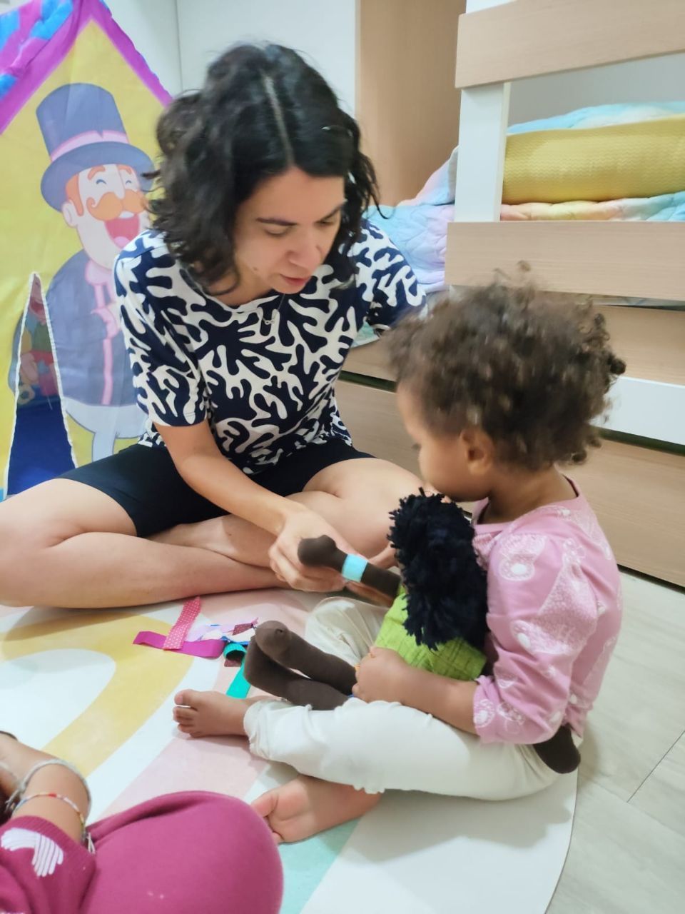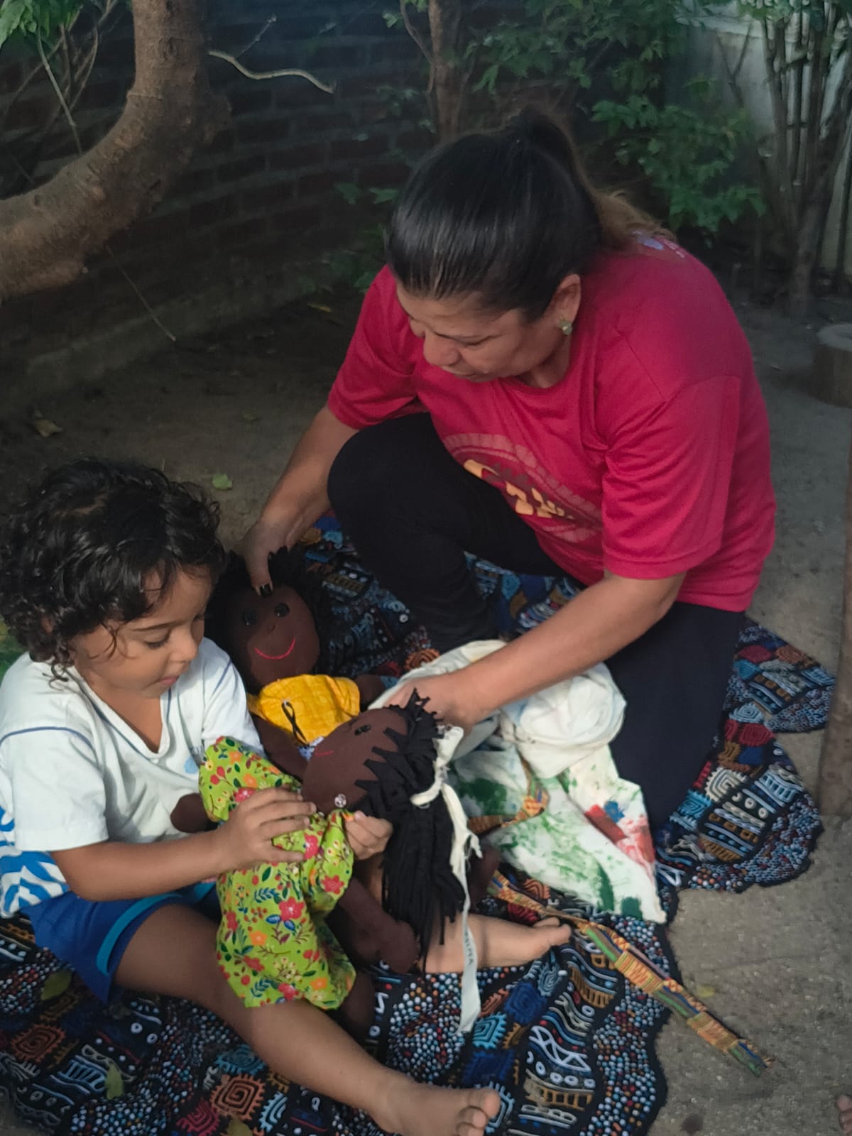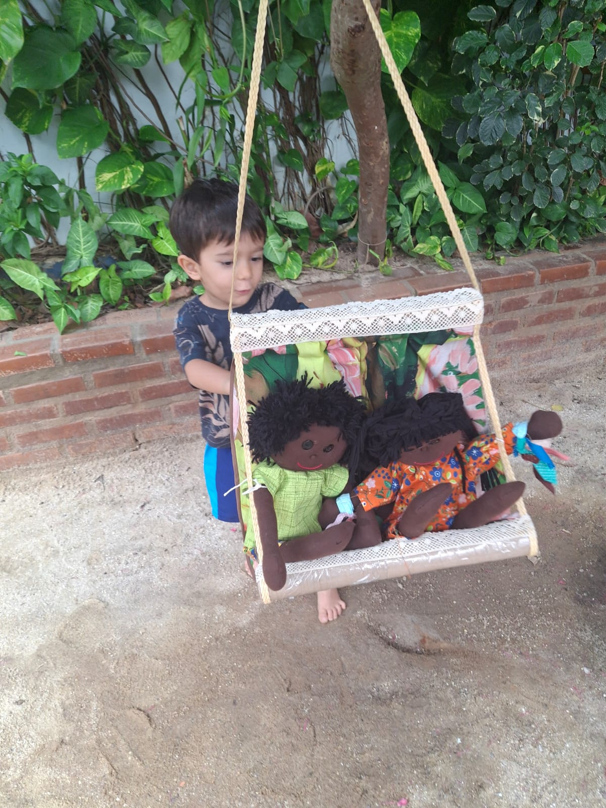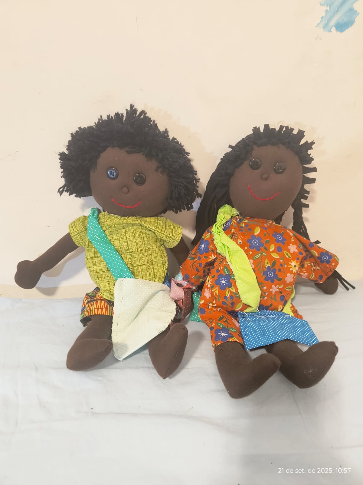 A brincadeira com bonecos e bonecas pretas, envolvidos/as por lenços, tecidos, cestos e o próprio colo, desenvolve na criança a afetividade e desperta o aprender pelo encantamento. Desde bem pequenas, elas começam a perceber a si mesmas e ao outro e, nesse processo, com suas singularidades, aprendem a viver em meio à diversidade.