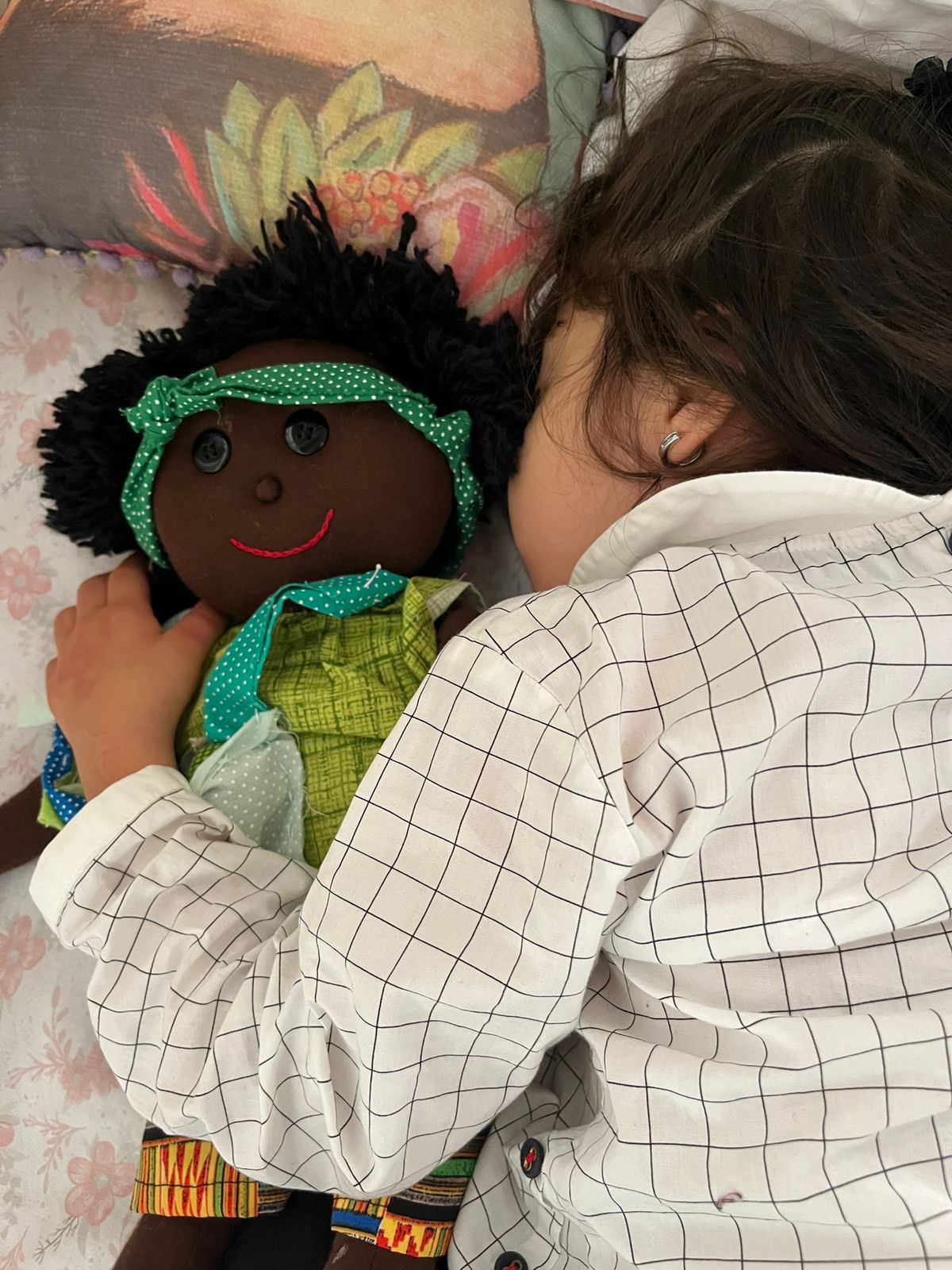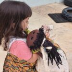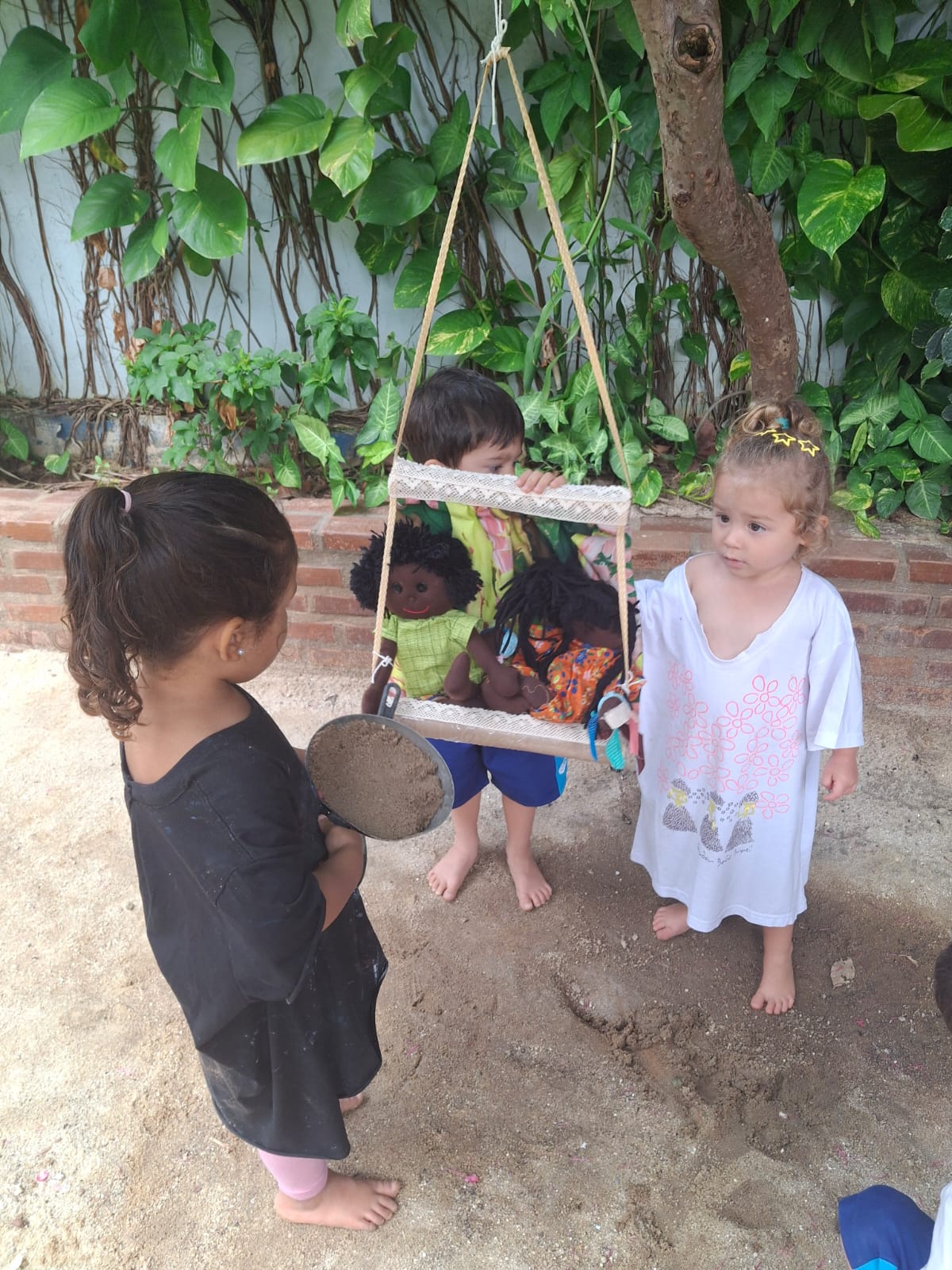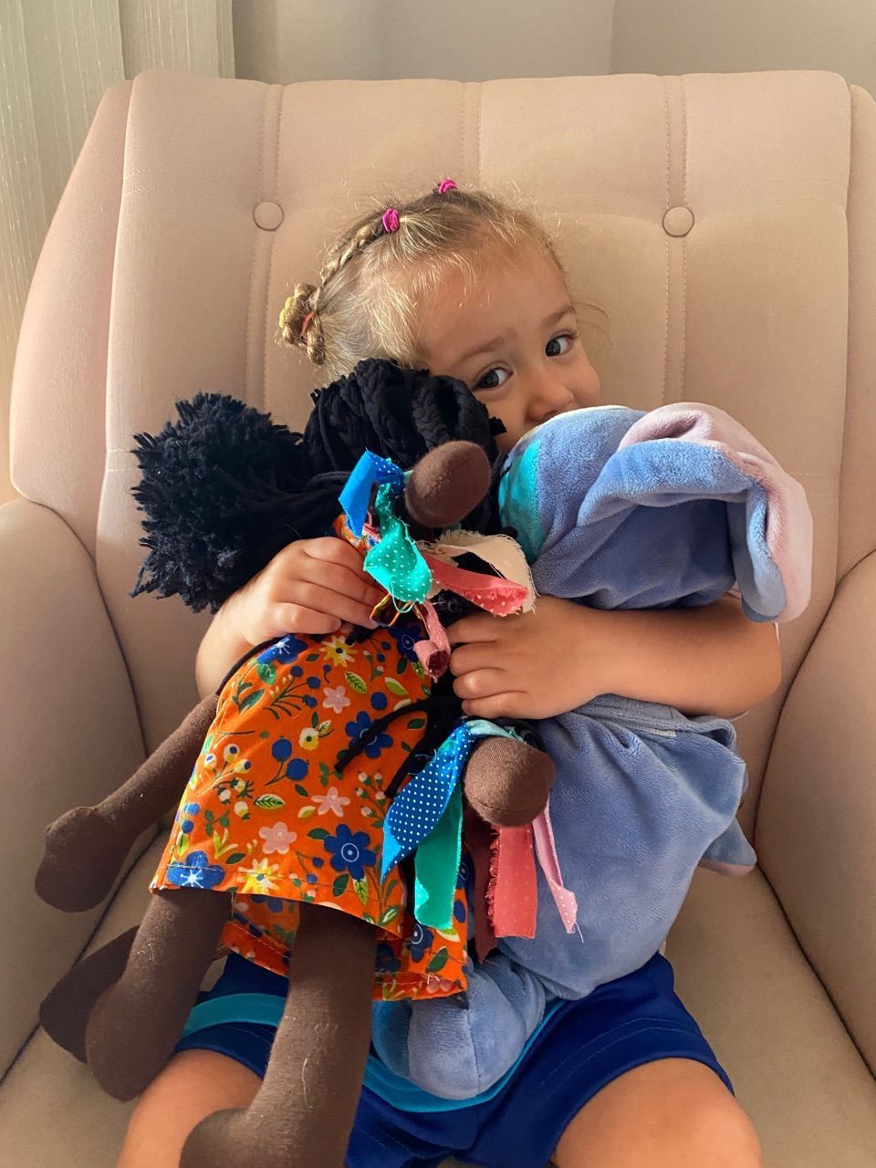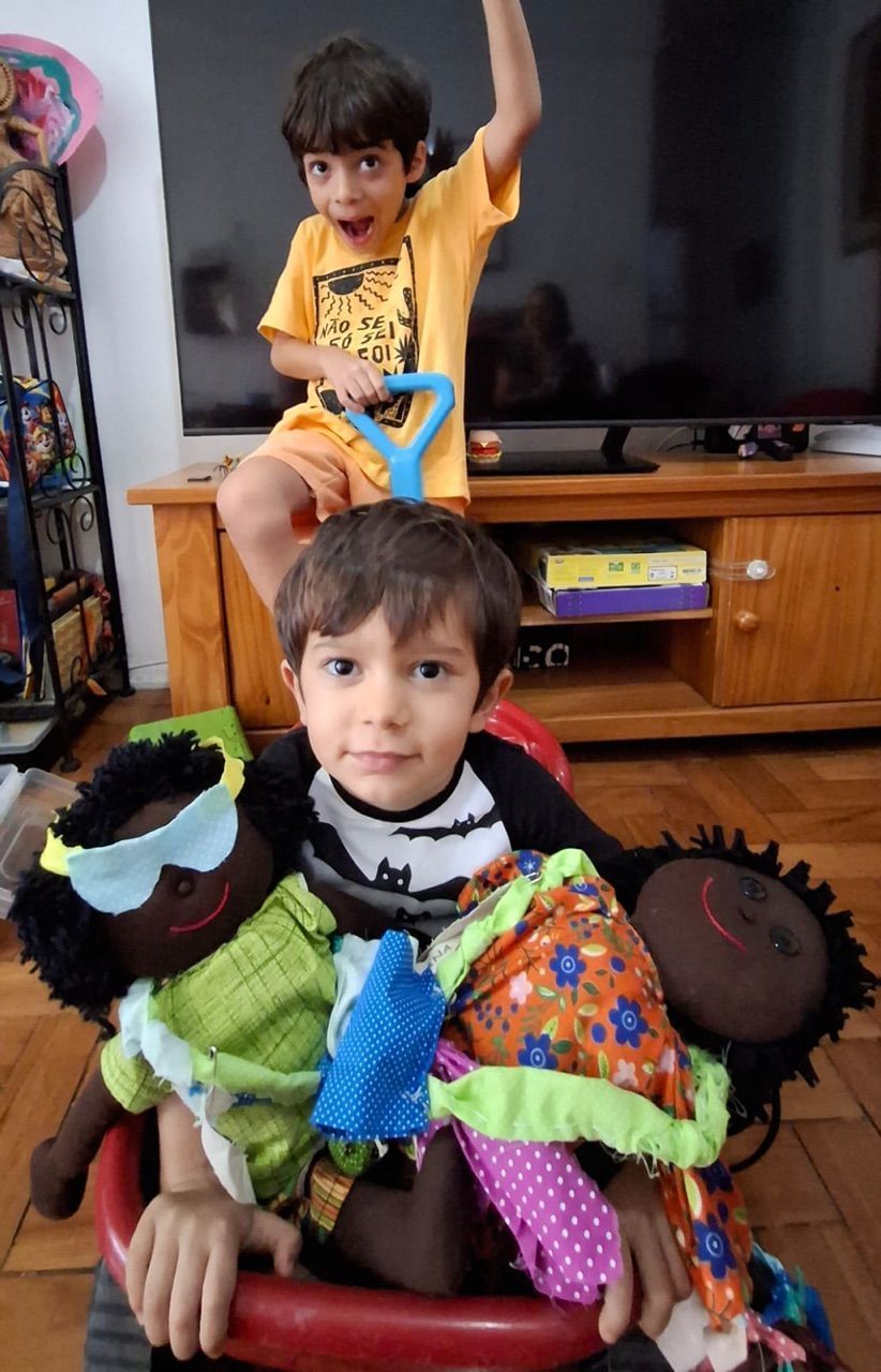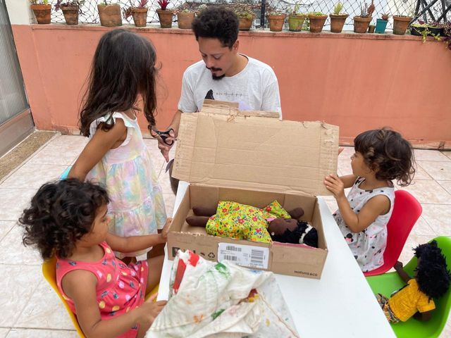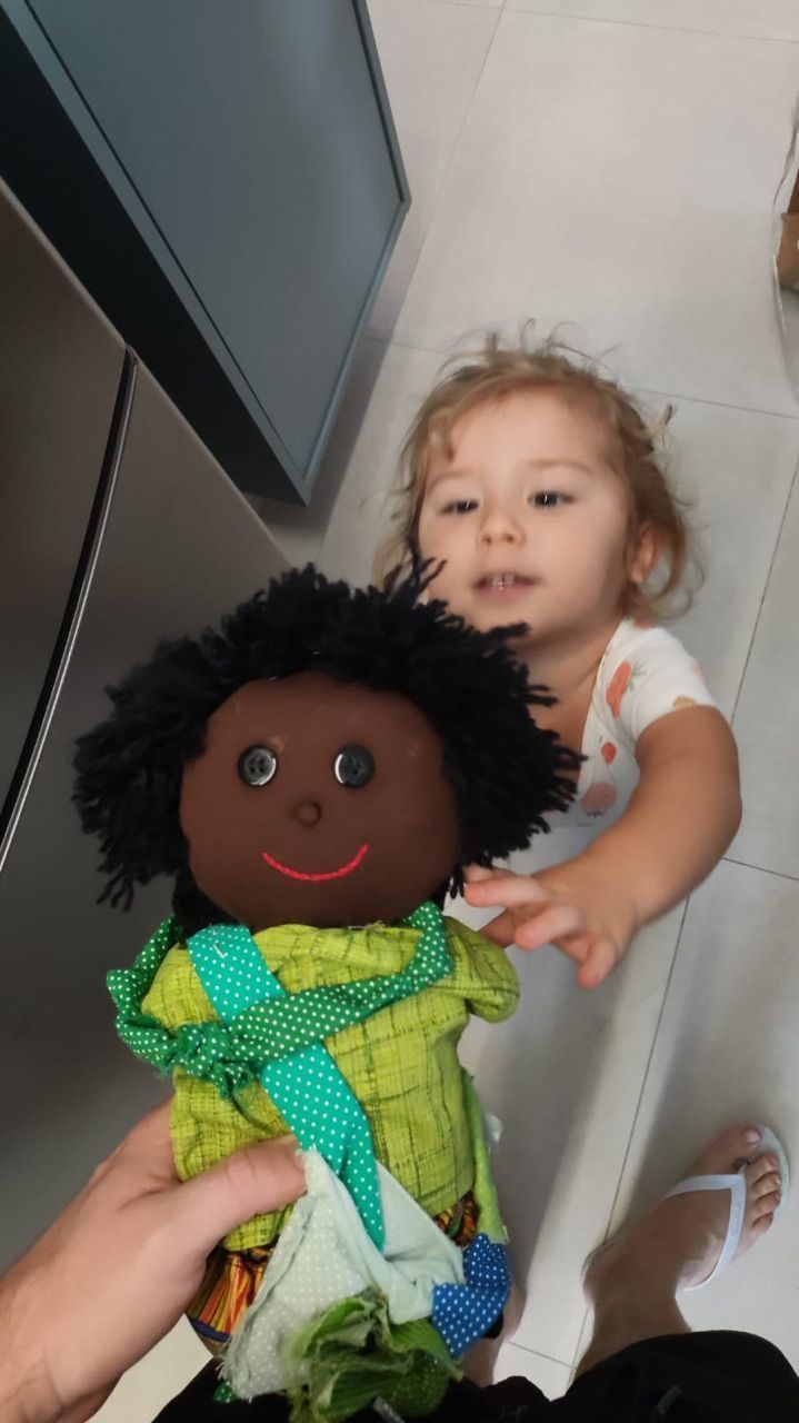 A brincadeira com bonecos e bonecas pretas, envolvidos/as por lenços, tecidos, cestos e o próprio colo, desenvolve na criança a afetividade e desperta o aprender pelo encantamento. Desde bem pequenas, elas começam a perceber a si mesmas e ao outro e, nesse processo, com suas singularidades, aprendem a viver em meio à diversidade.