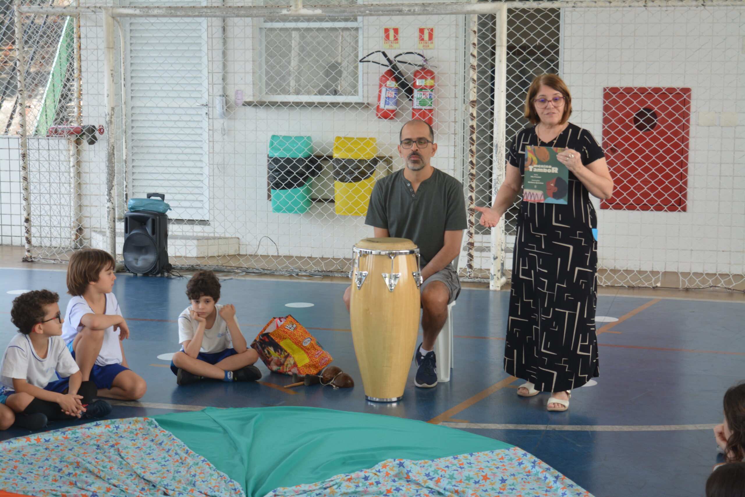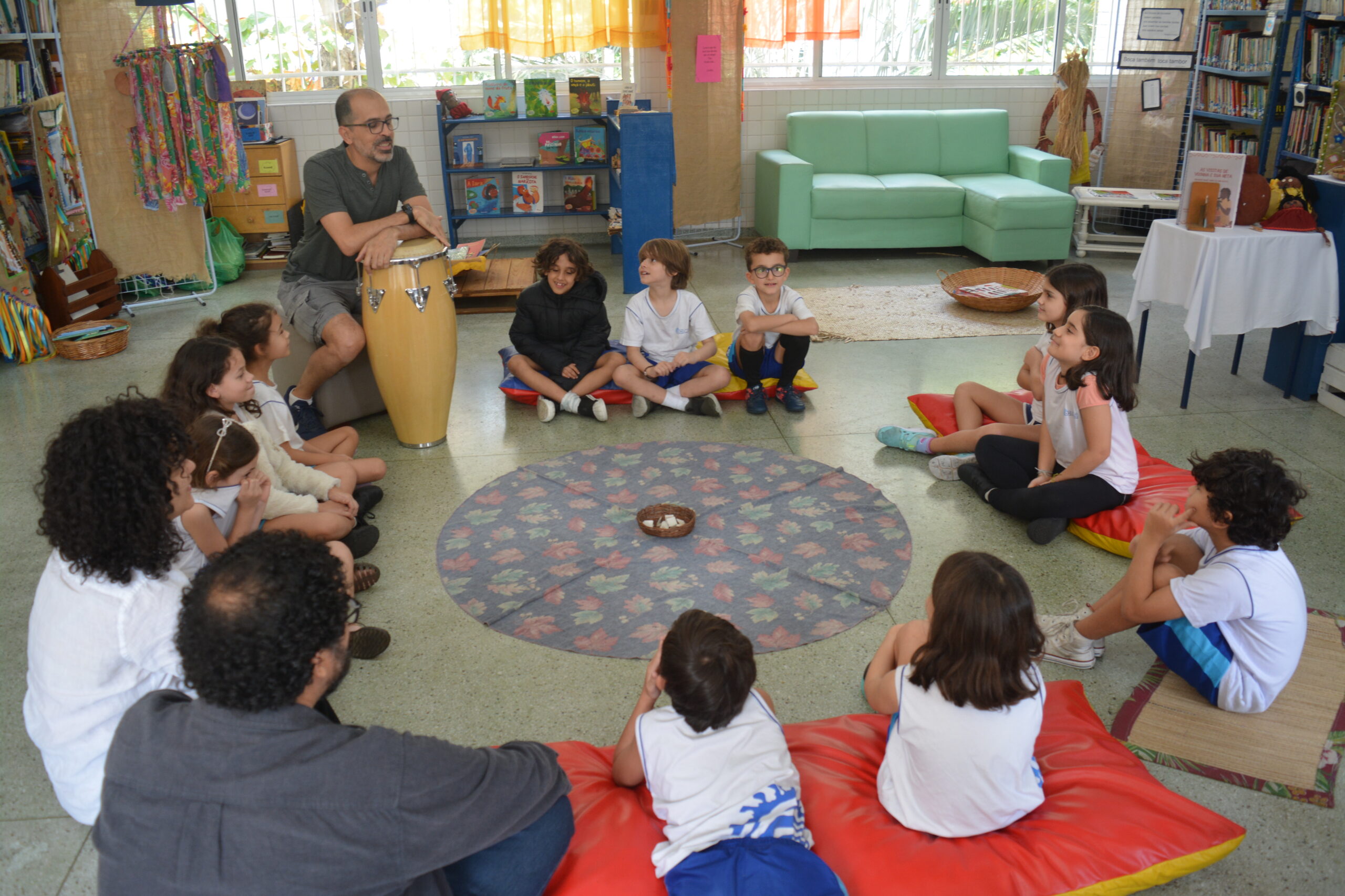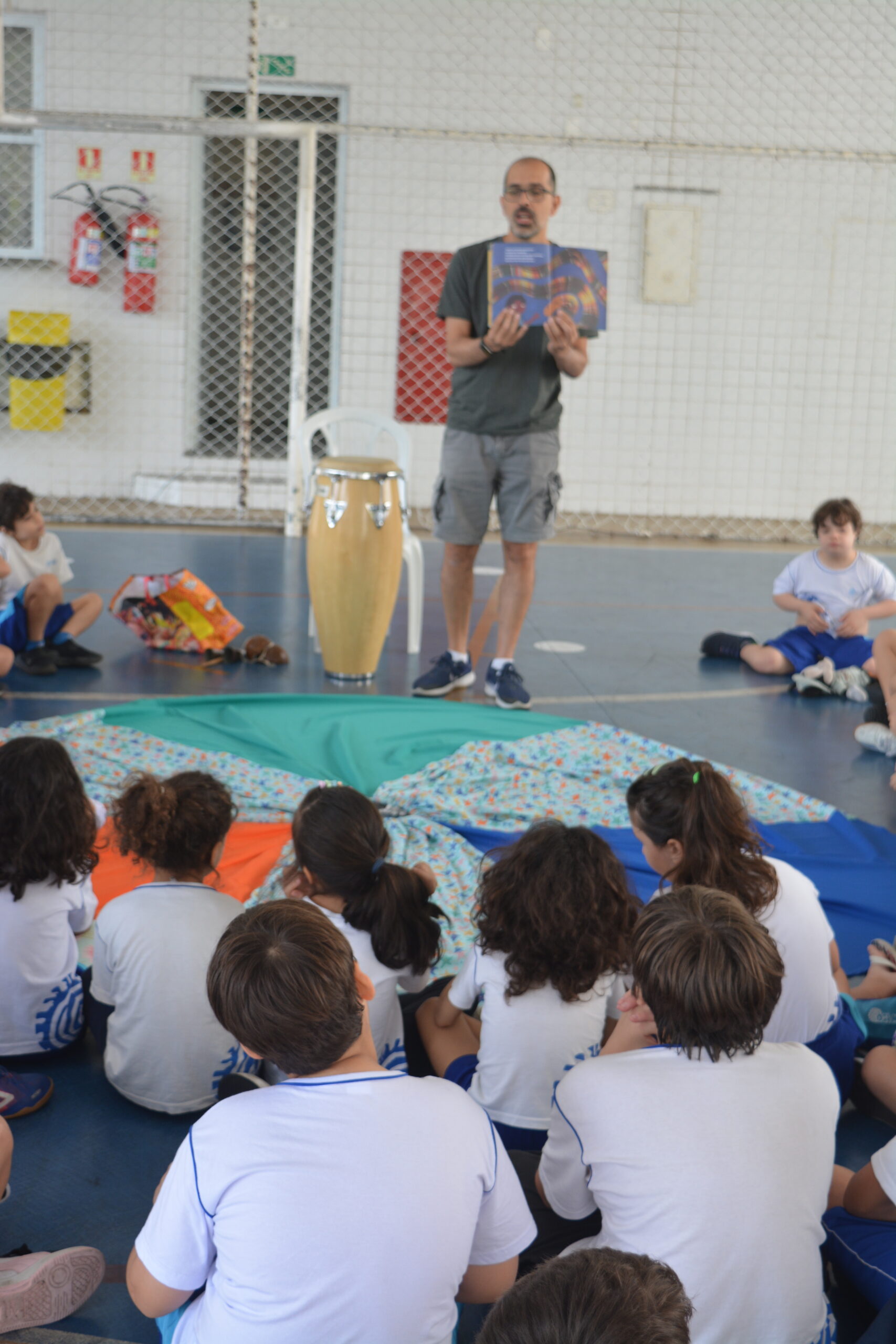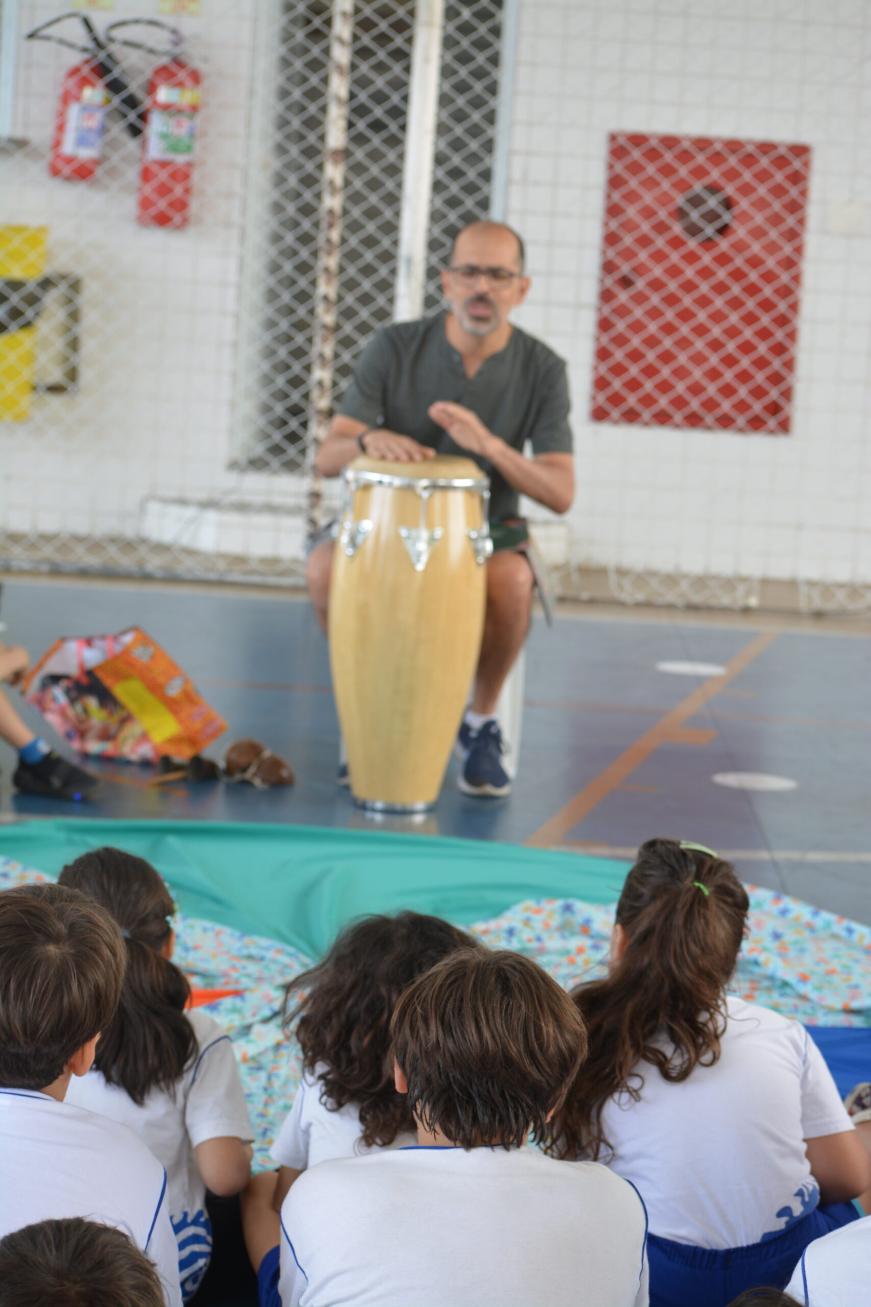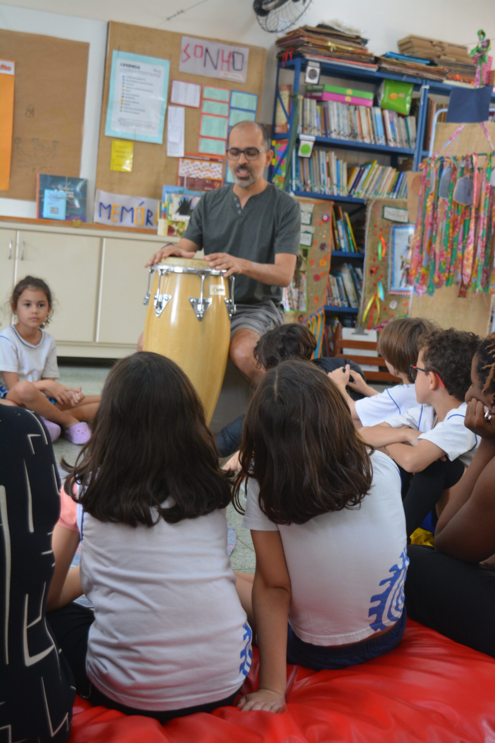 O primeiro momento foi um bate-papo onde as crianças, curiosas, fizeram perguntas para conhecê-lo melhor. Depois, Edu trouxe muita música ao som do atabaque. No segundo momento, convidamos as outras turmas do 1º ao 5º ano do Ensino Fundamental para se unir a nós e Edu fez a contação da história.