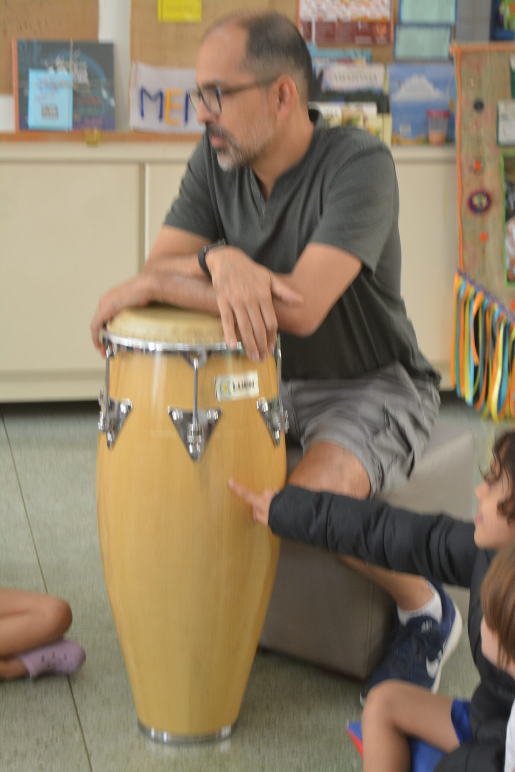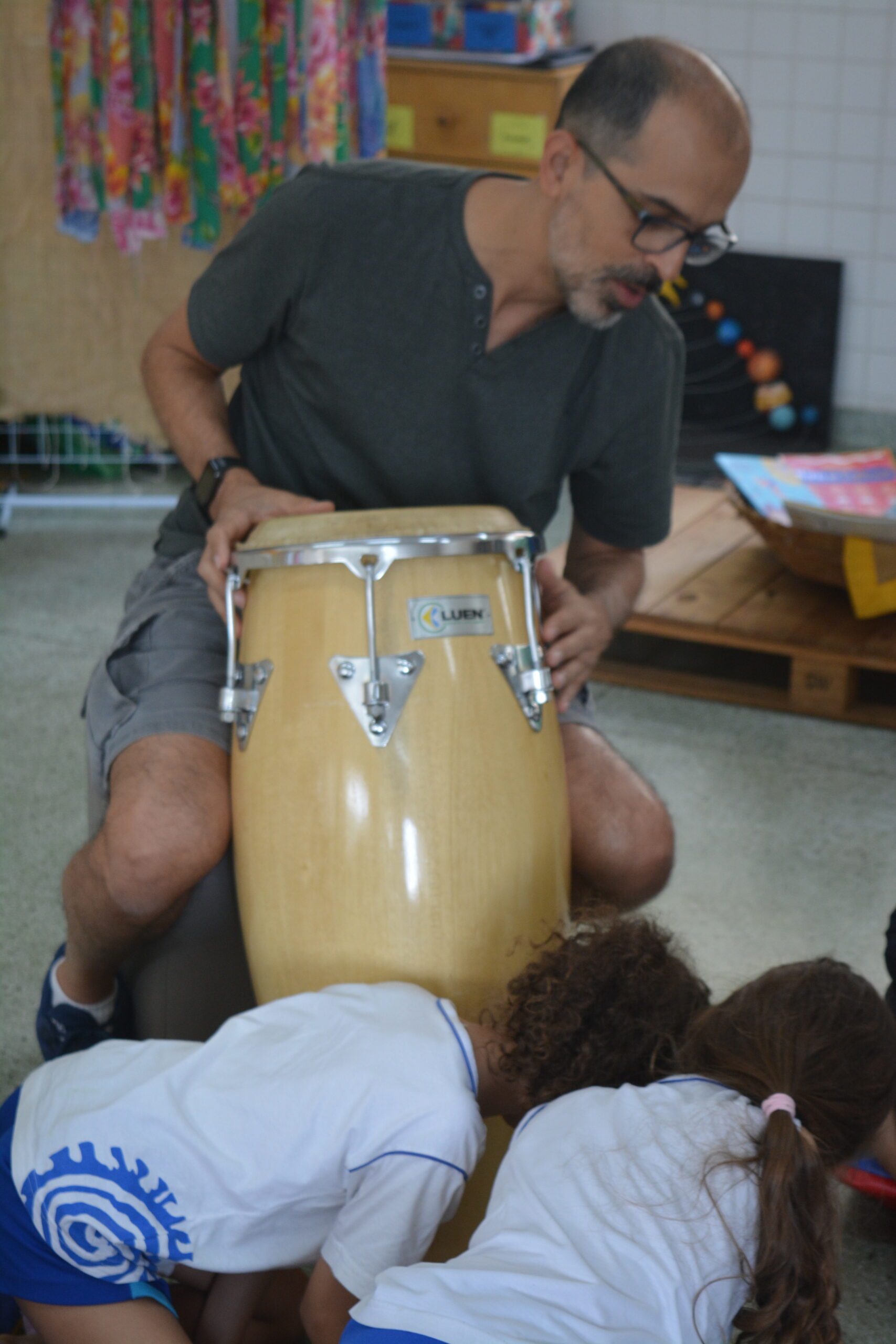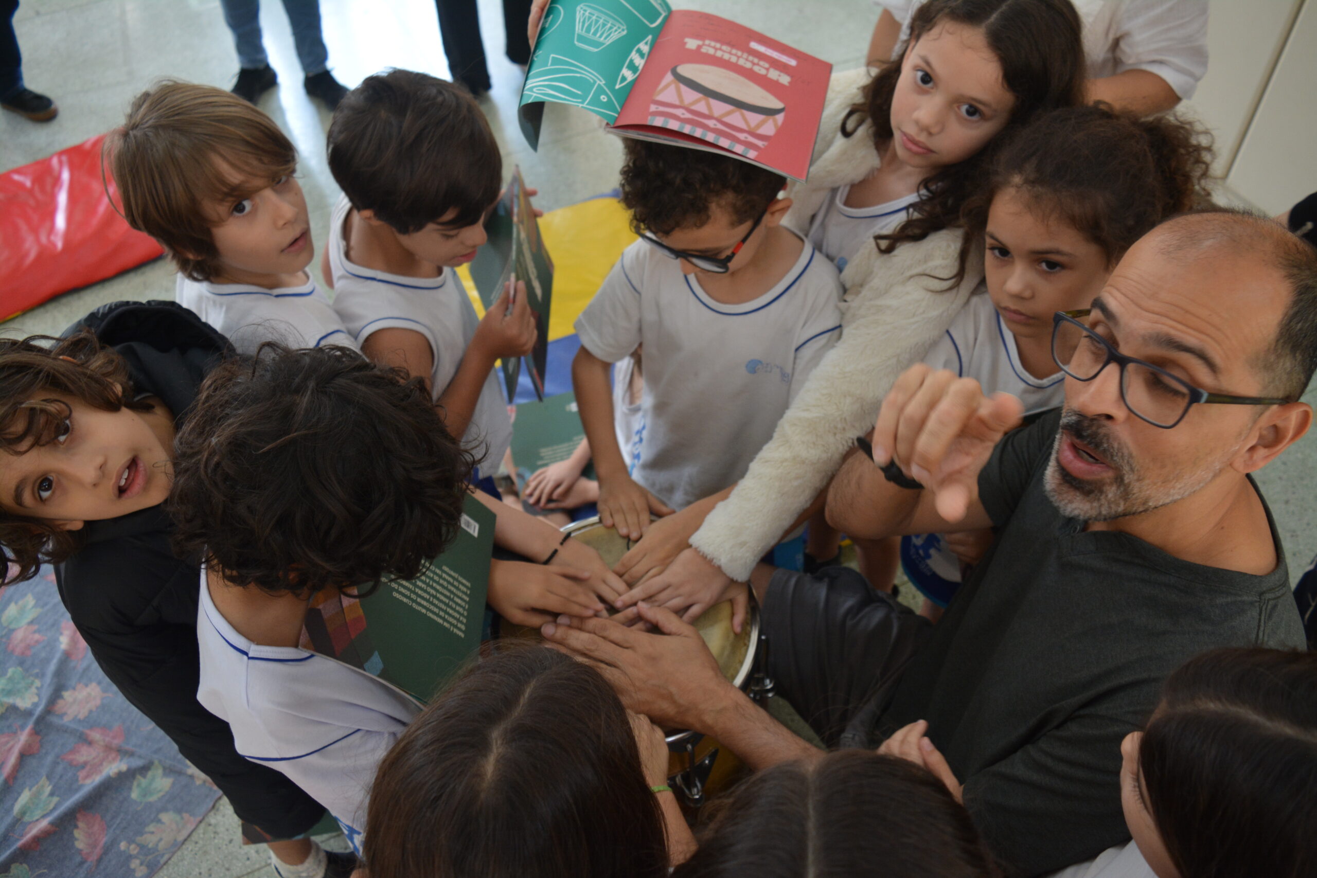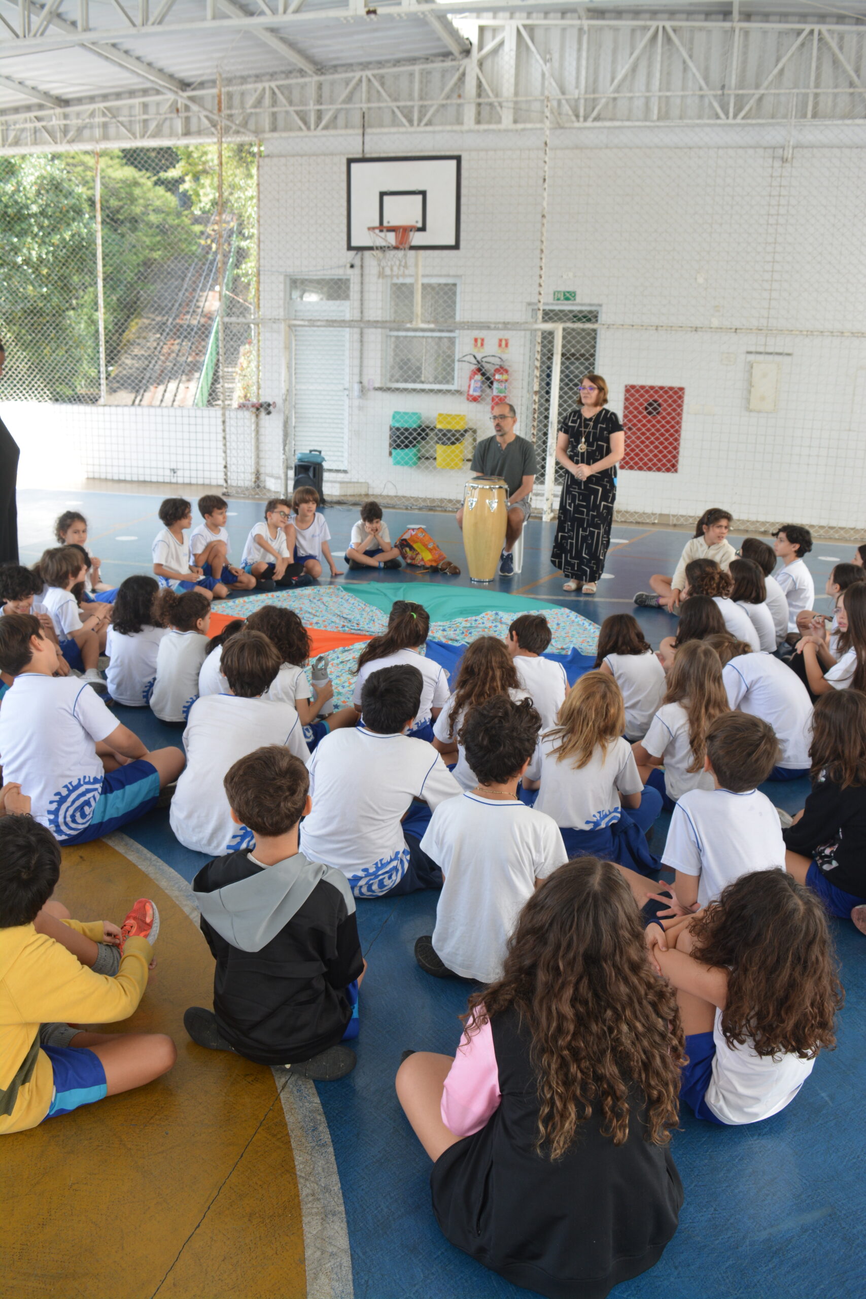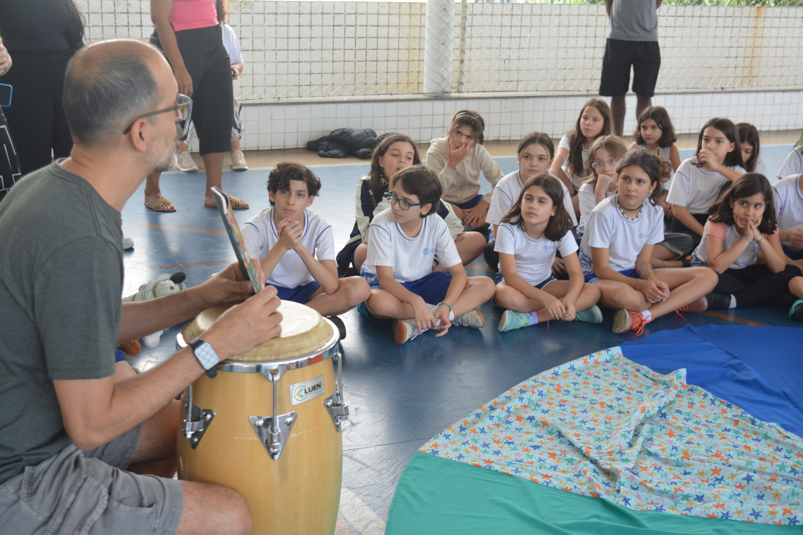 O primeiro momento foi um bate-papo onde as crianças, curiosas, fizeram perguntas para conhecê-lo melhor. Depois, Edu trouxe muita música ao som do atabaque. No segundo momento, convidamos as outras turmas do 1º ao 5º ano do Ensino Fundamental para se unir a nós e Edu fez a contação da história.