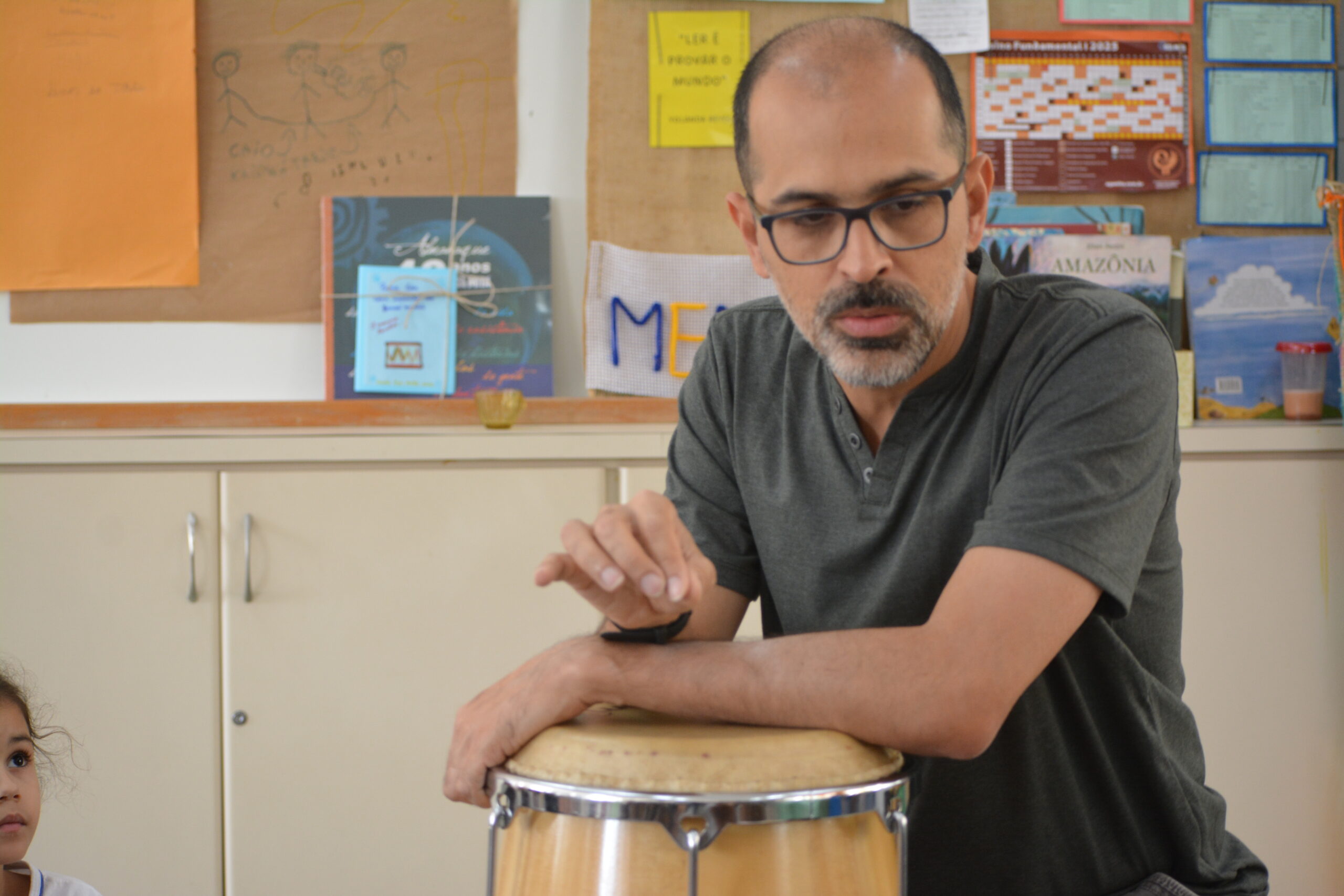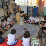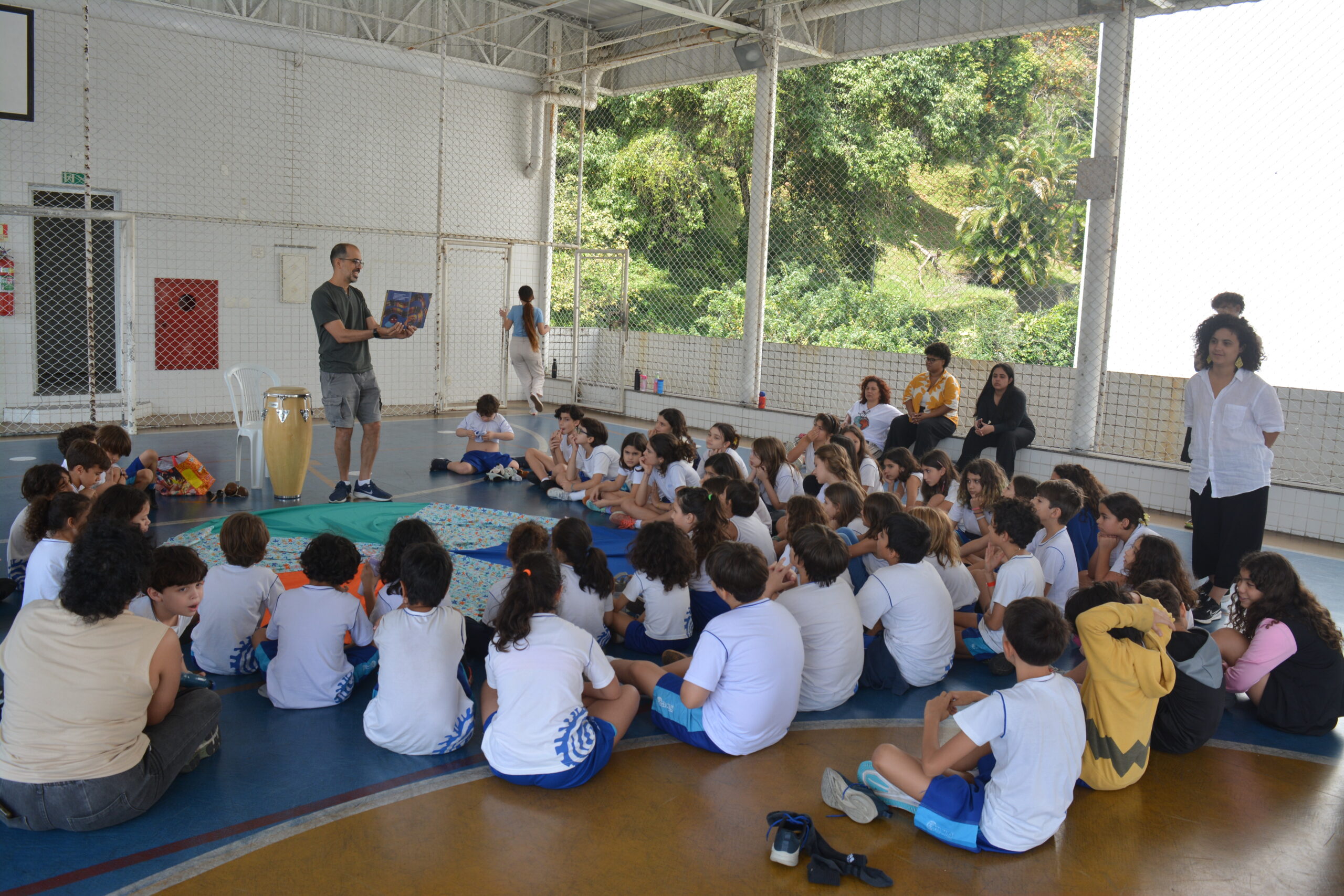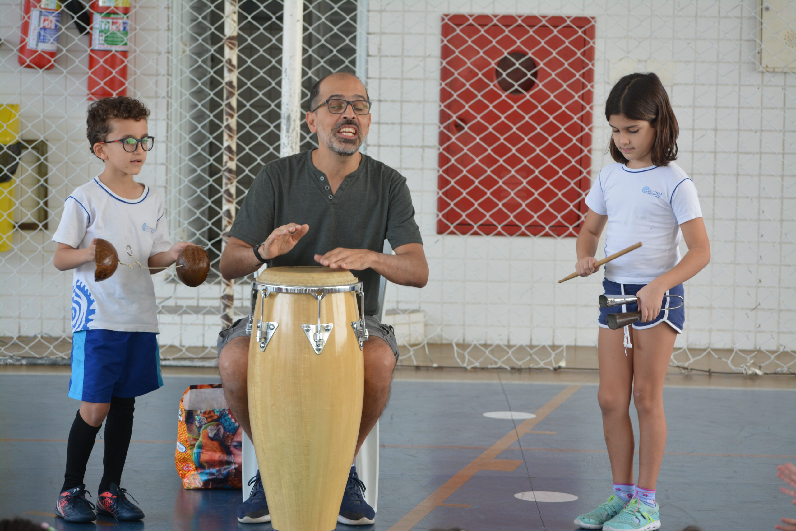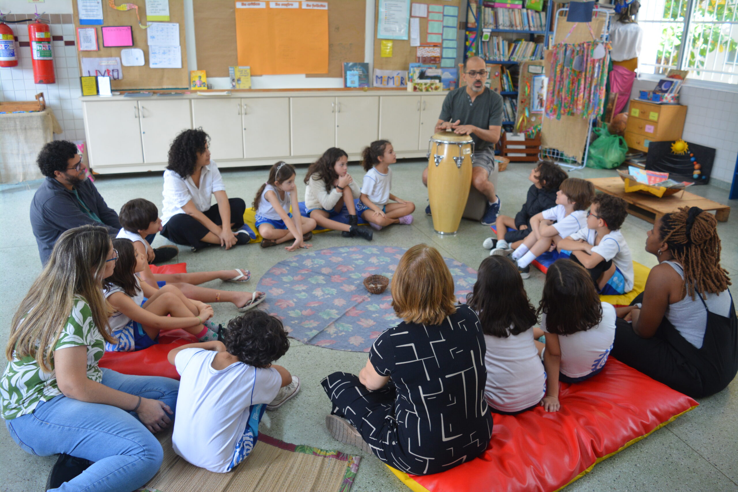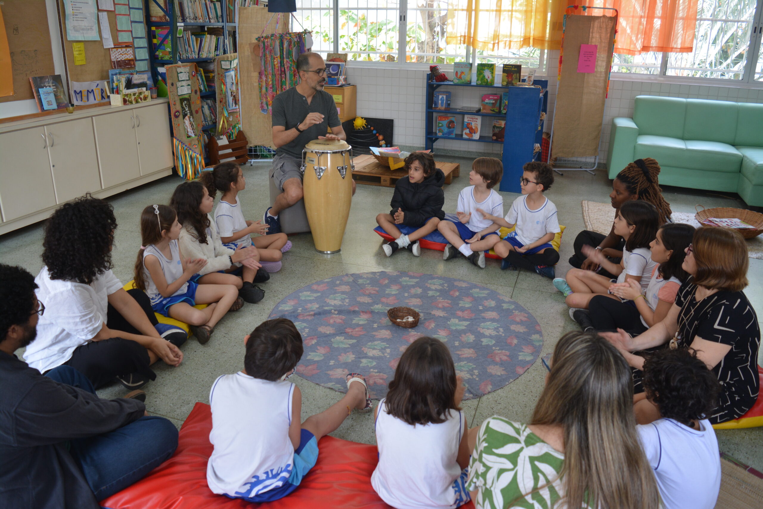 O primeiro momento foi um bate-papo onde as crianças, curiosas, fizeram perguntas para conhecê-lo melhor. Depois, Edu trouxe muita música ao som do atabaque. No segundo momento, convidamos as outras turmas do 1º ao 5º ano do Ensino Fundamental para se unir a nós e Edu fez a contação da história.