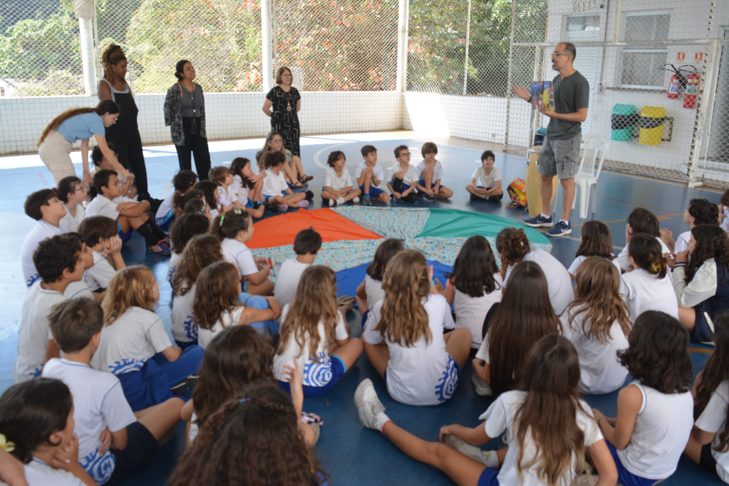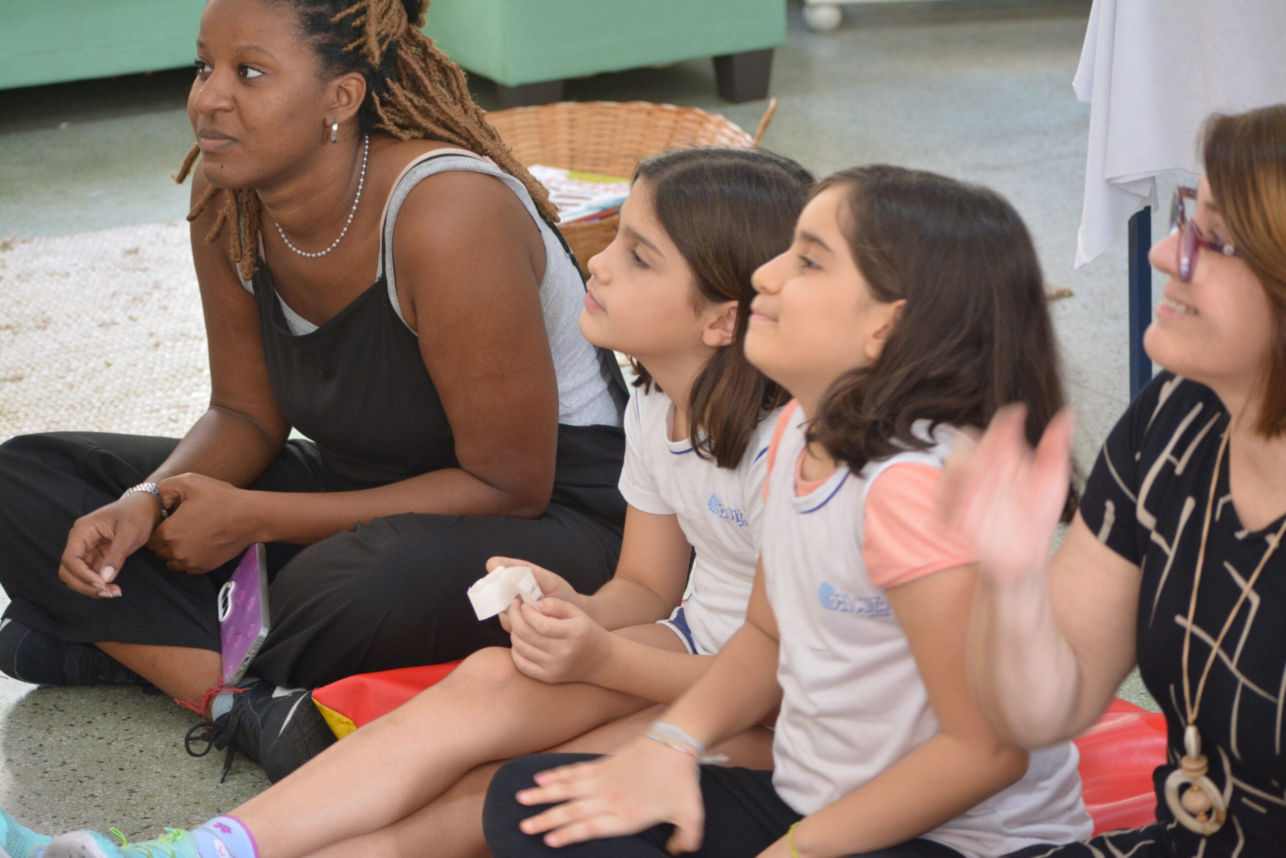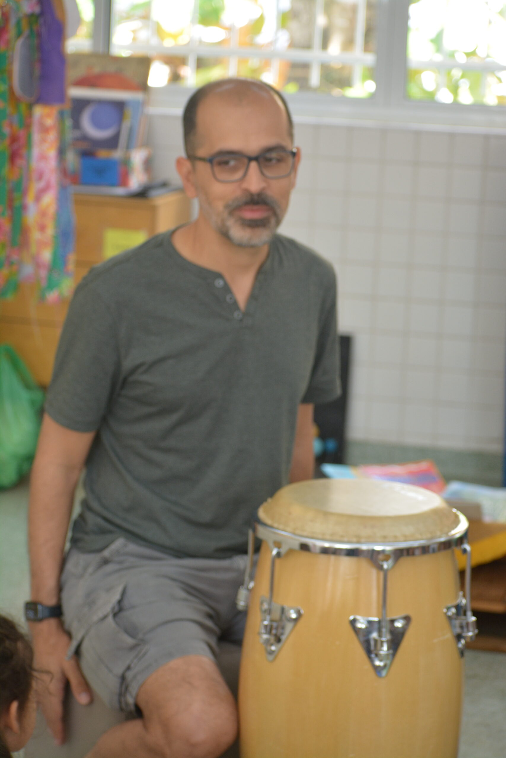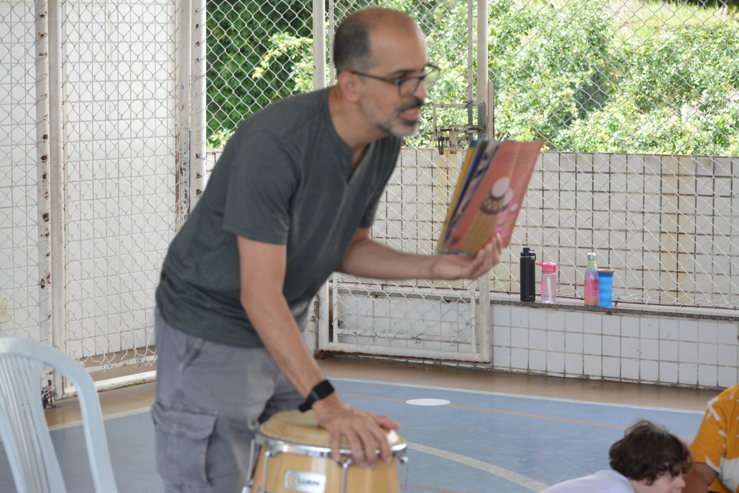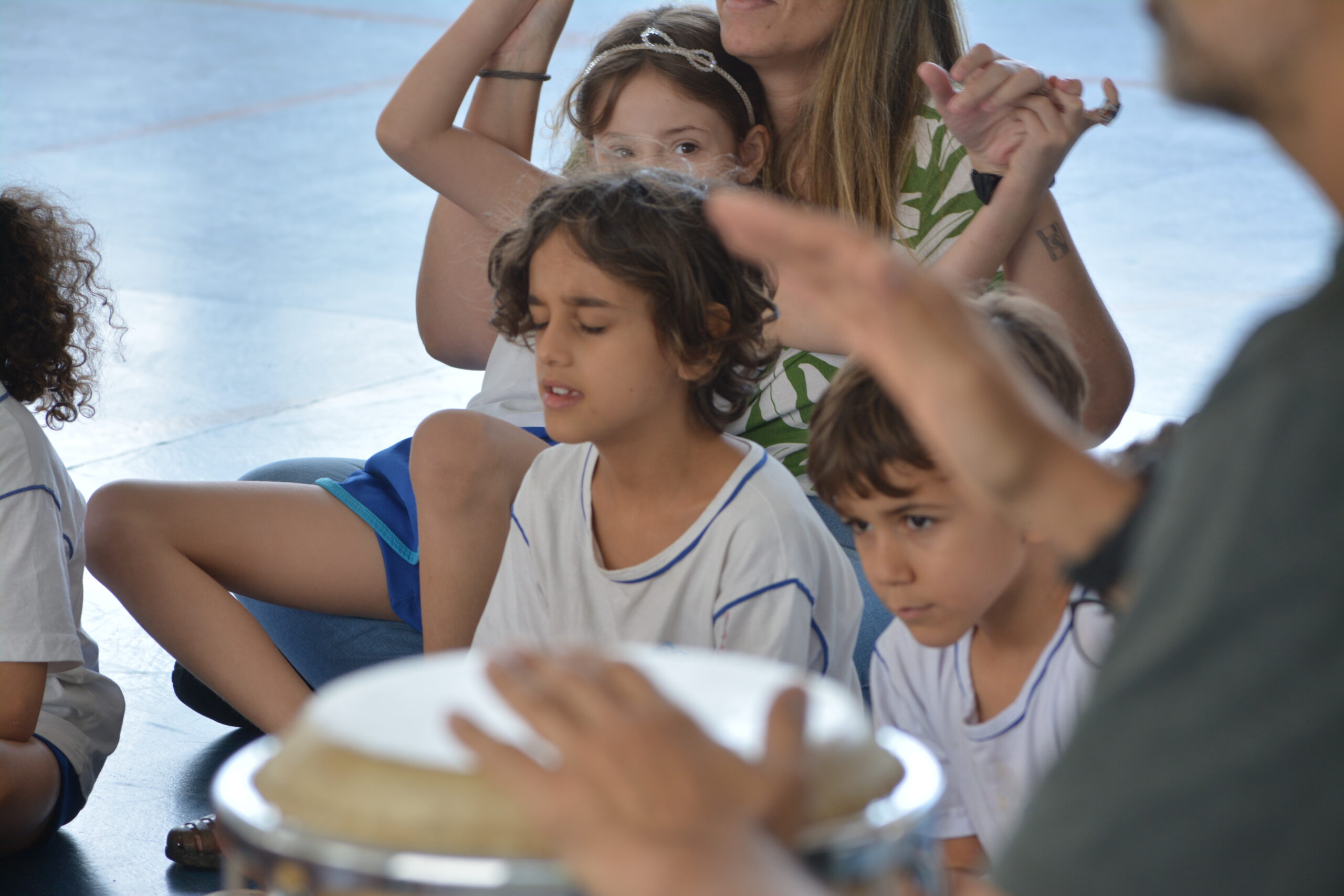 O primeiro momento foi um bate-papo onde as crianças, curiosas, fizeram perguntas para conhecê-lo melhor. Depois, Edu trouxe muita música ao som do atabaque. No segundo momento, convidamos as outras turmas do 1º ao 5º ano do Ensino Fundamental para se unir a nós e Edu fez a contação da história.