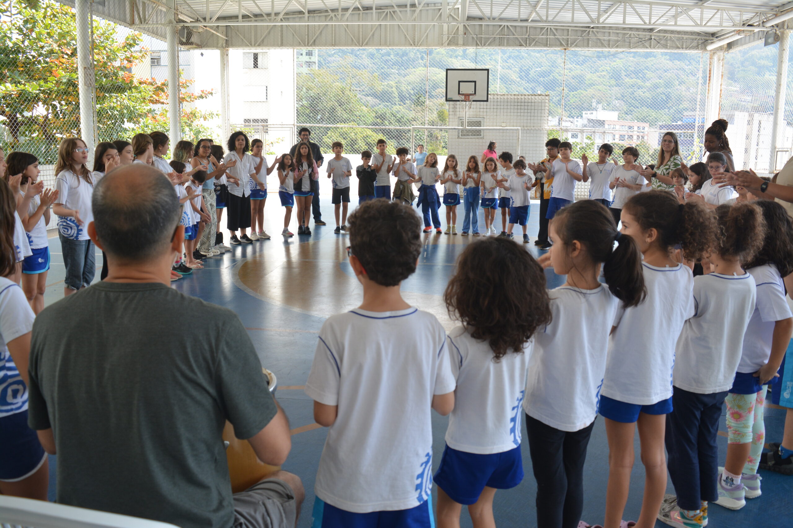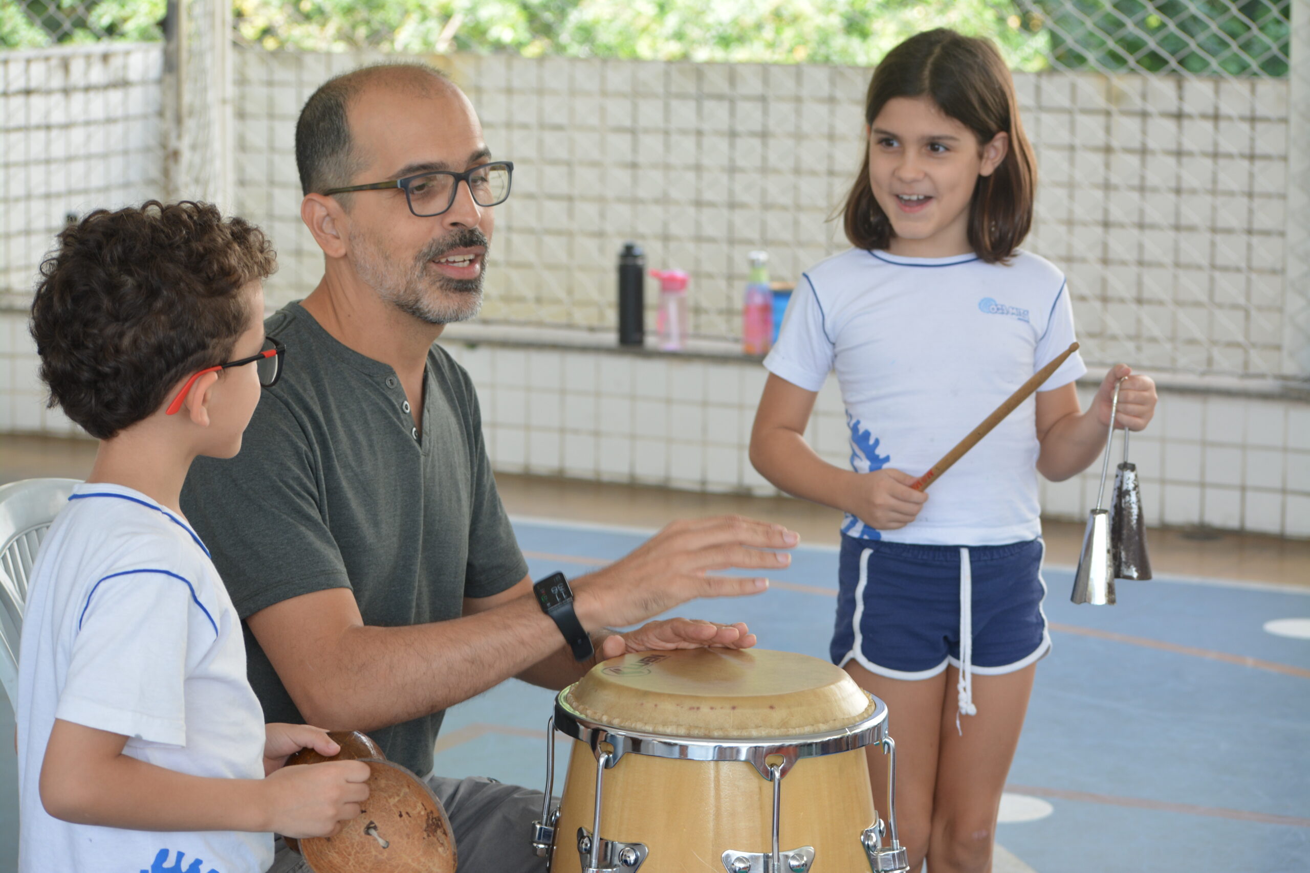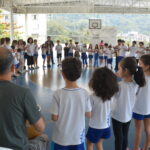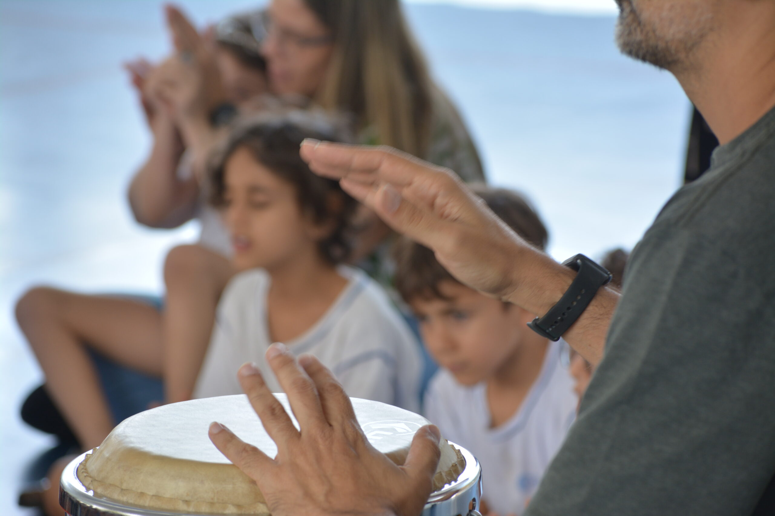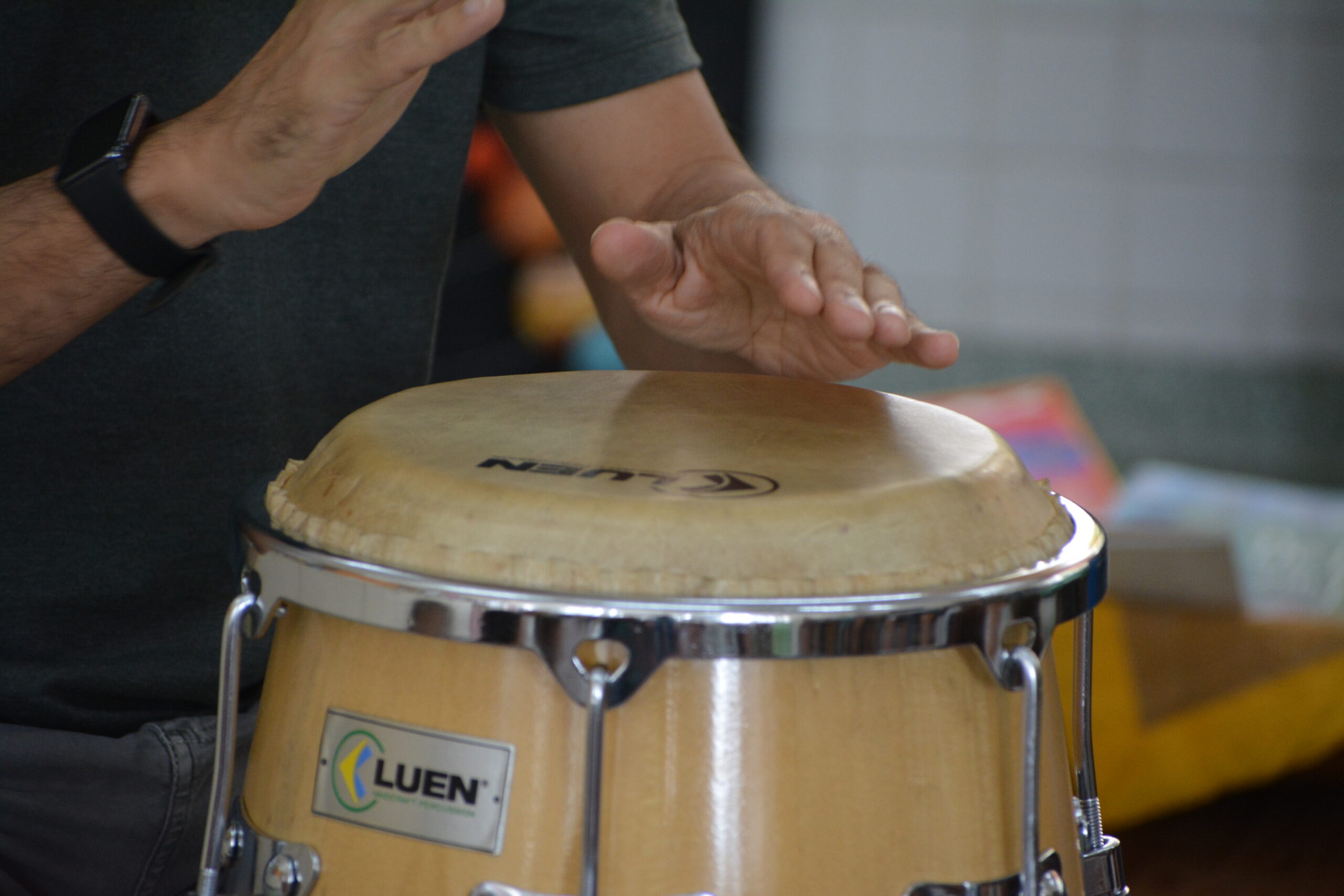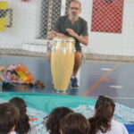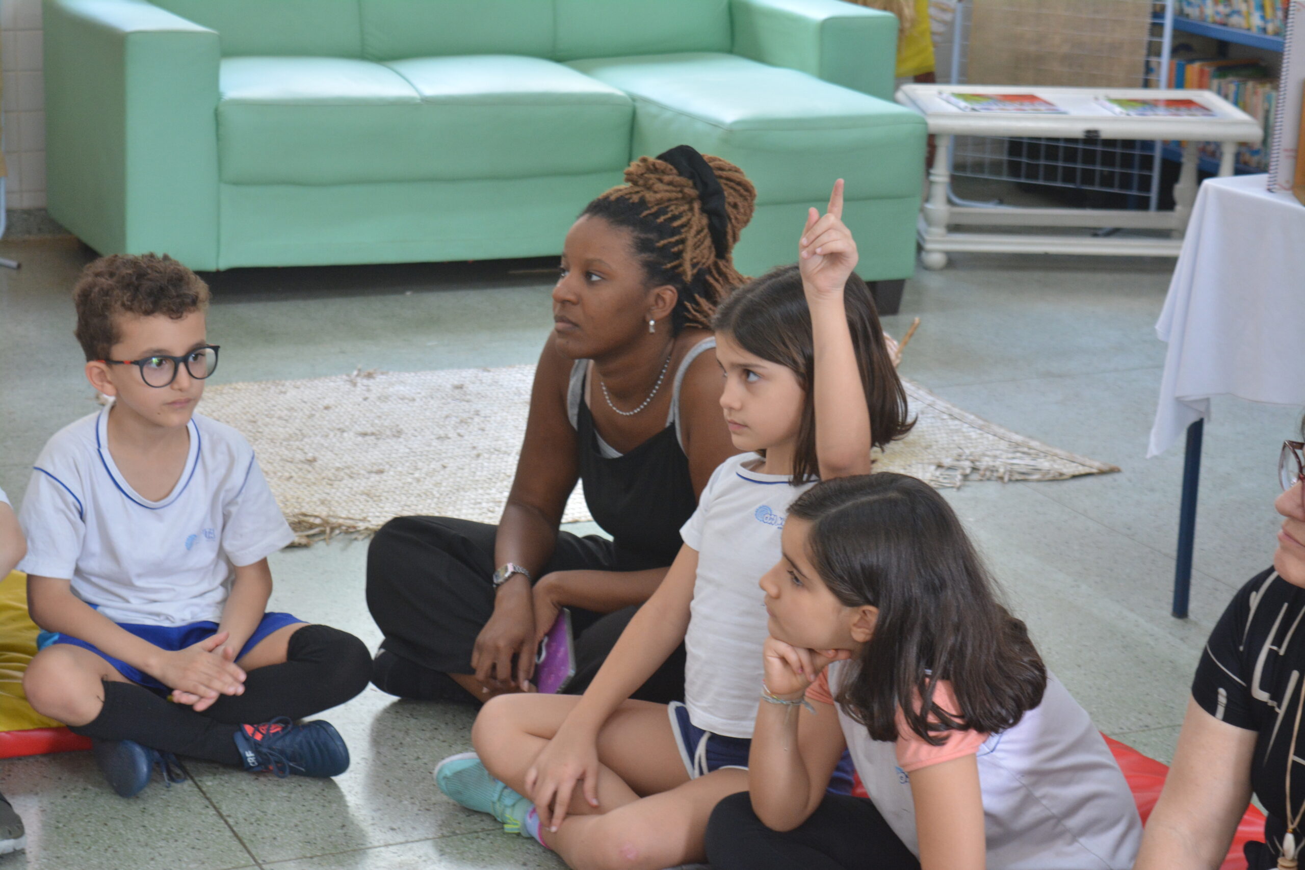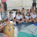 O primeiro momento foi um bate-papo onde as crianças, curiosas, fizeram perguntas para conhecê-lo melhor. Depois, Edu trouxe muita música ao som do atabaque. No segundo momento, convidamos as outras turmas do 1º ao 5º ano do Ensino Fundamental para se unir a nós e Edu fez a contação da história.