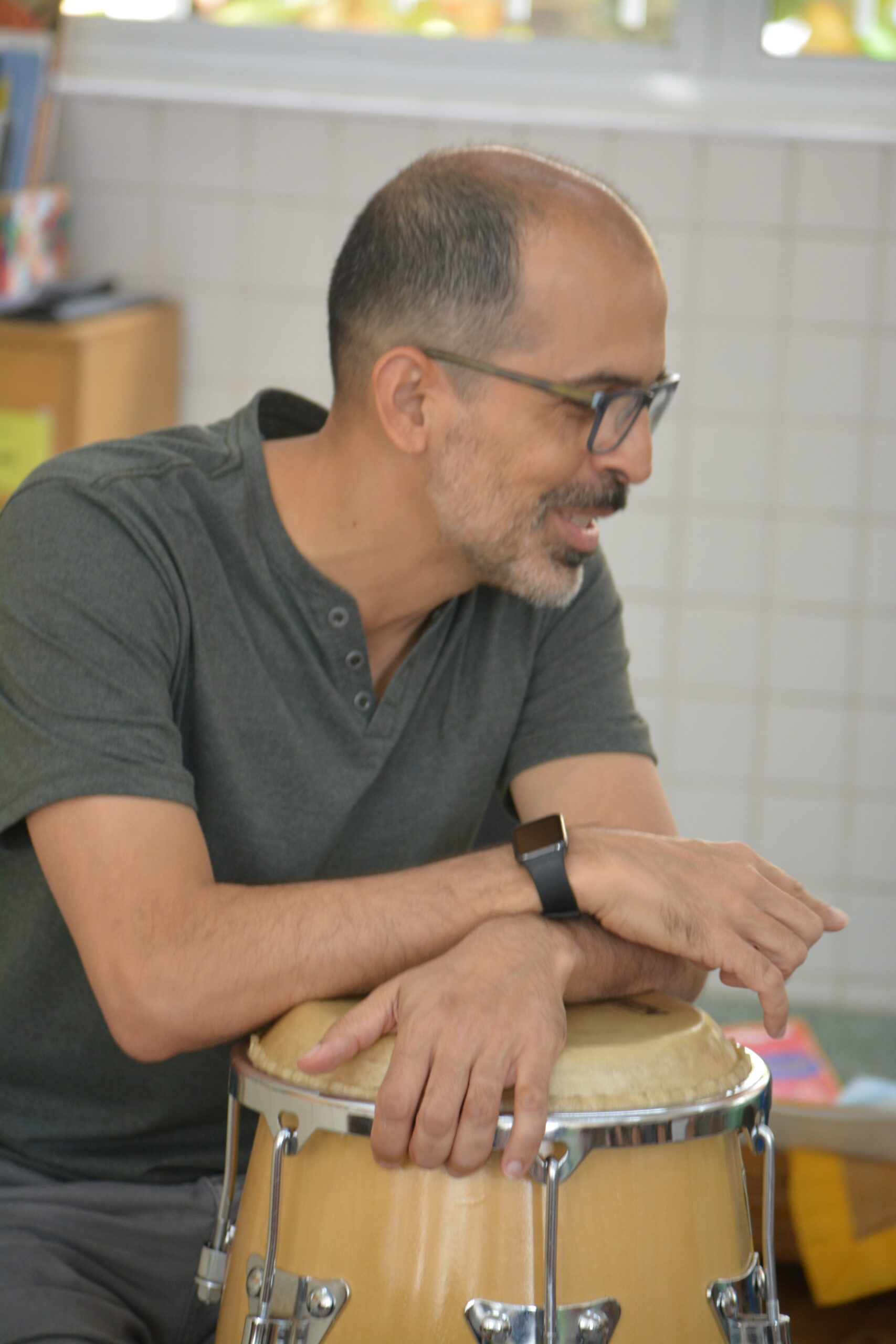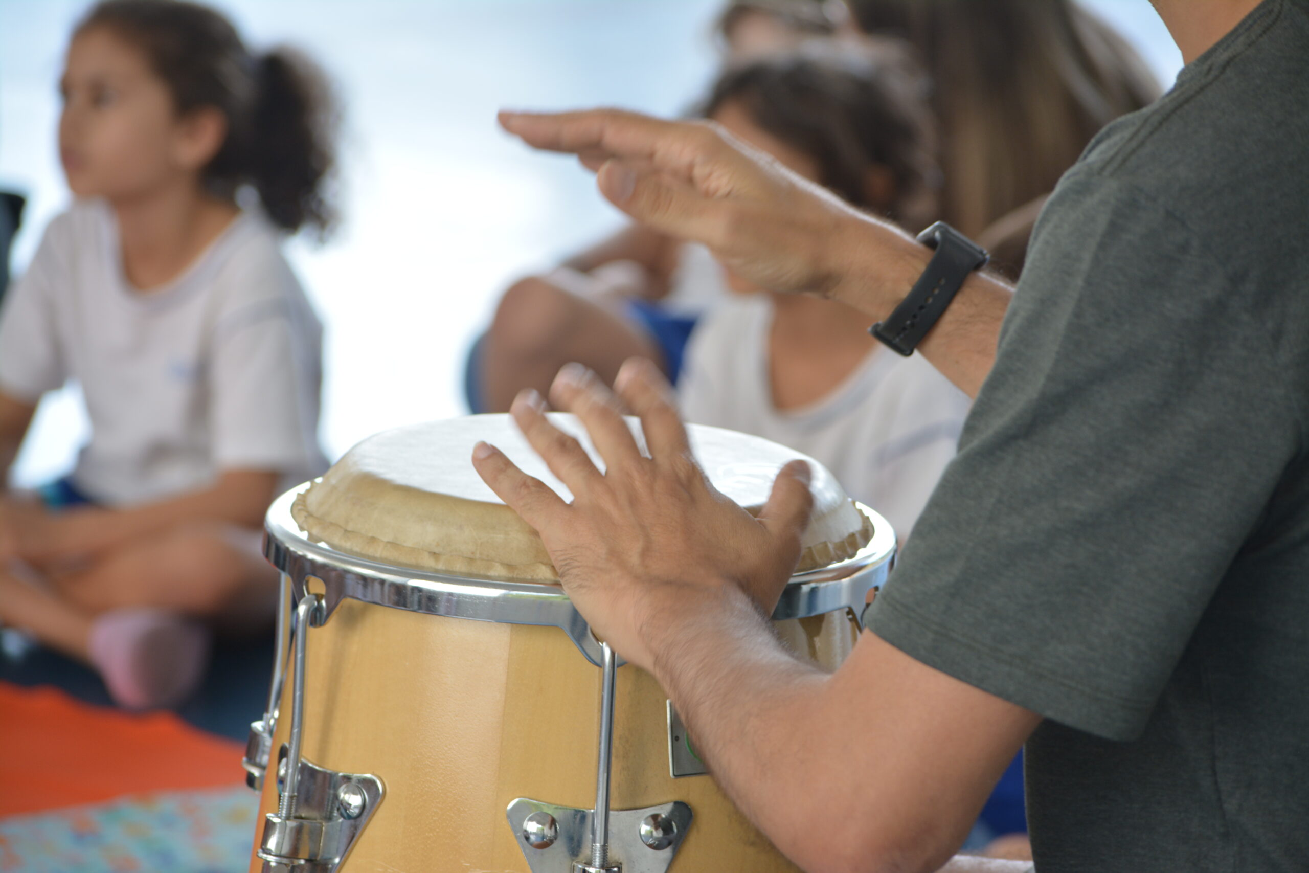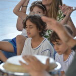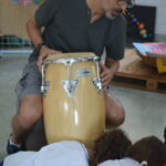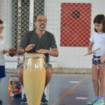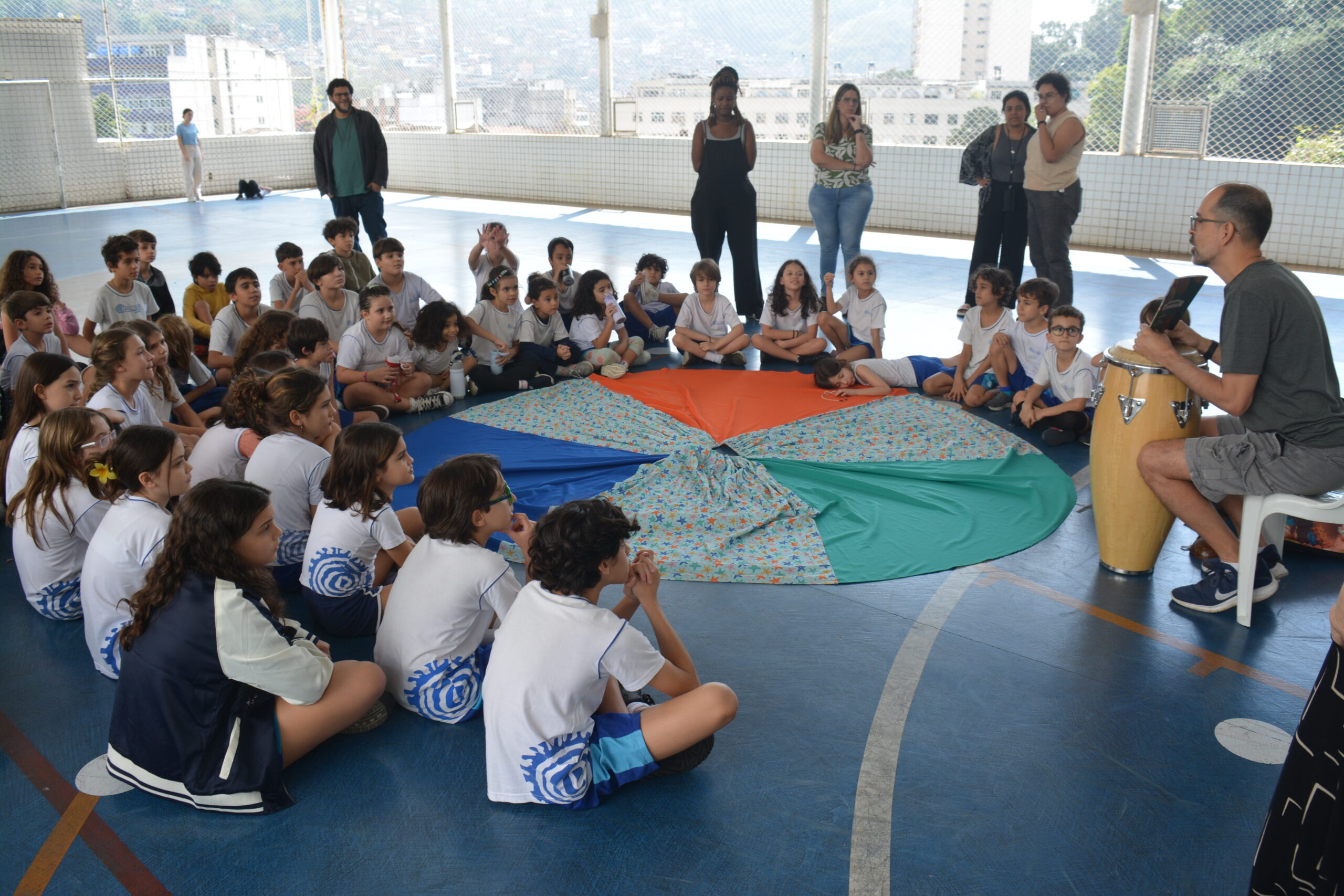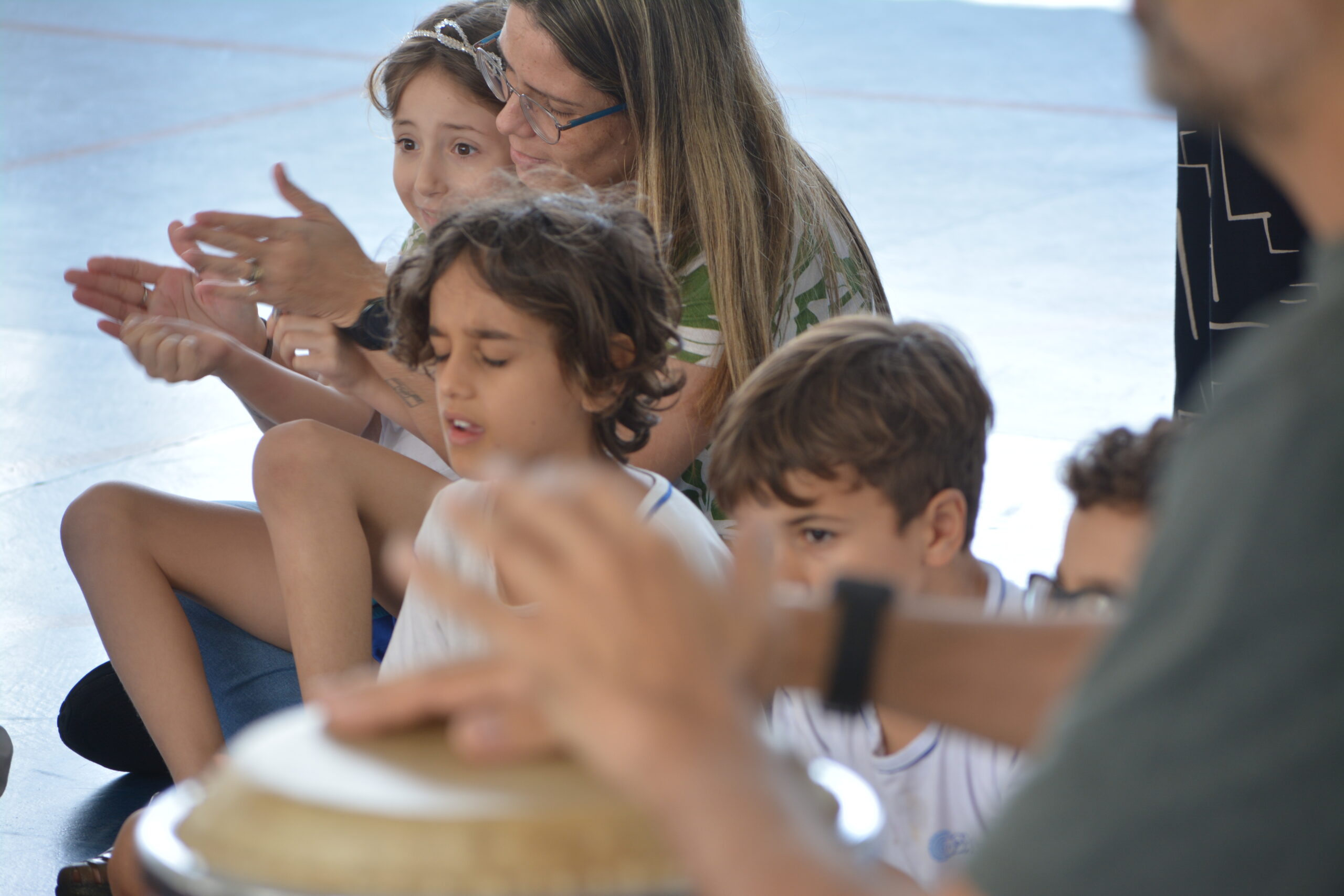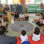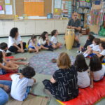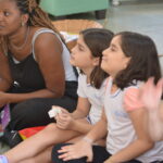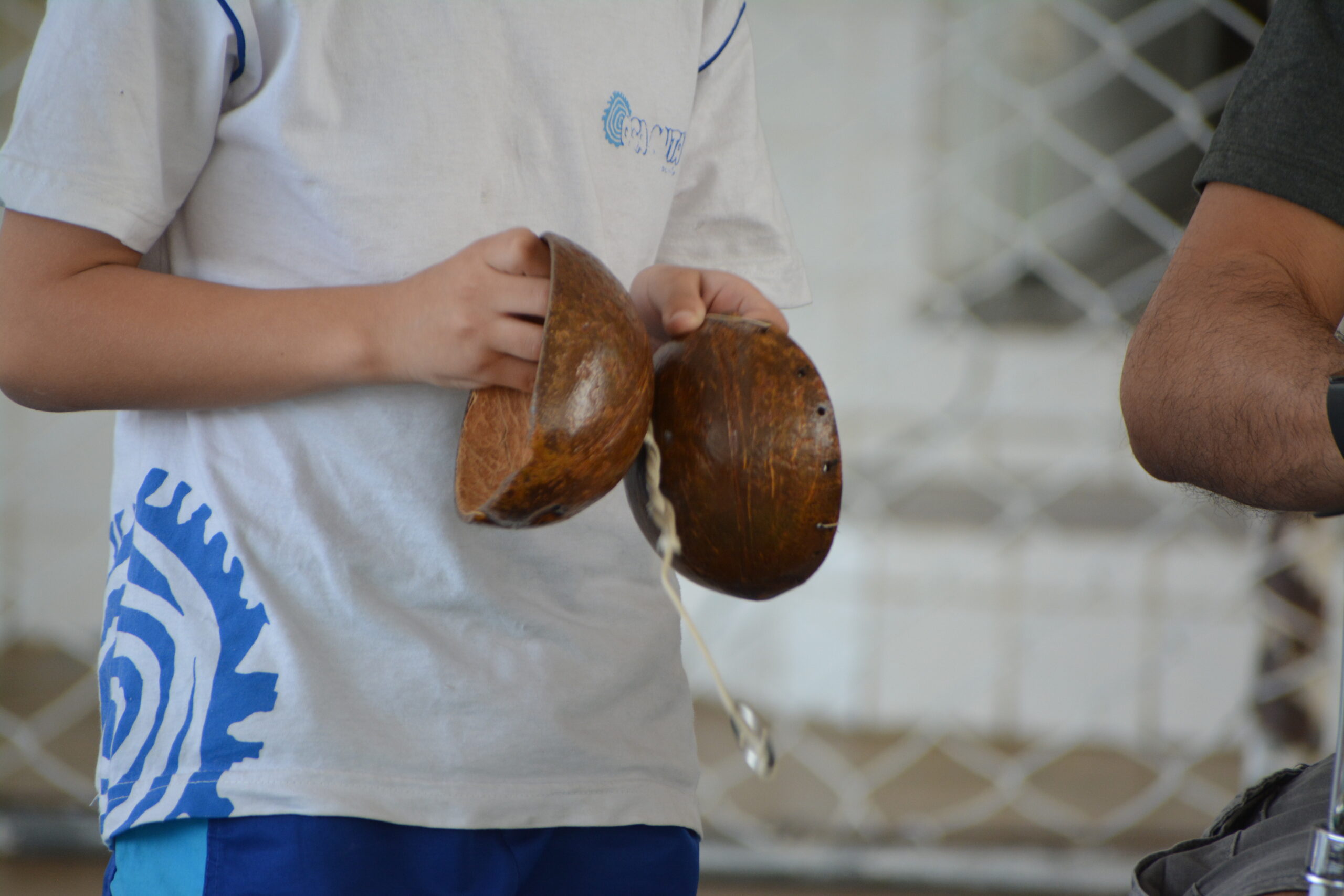 O primeiro momento foi um bate-papo onde as crianças, curiosas, fizeram perguntas para conhecê-lo melhor. Depois, Edu trouxe muita música ao som do atabaque. No segundo momento, convidamos as outras turmas do 1º ao 5º ano do Ensino Fundamental para se unir a nós e Edu fez a contação da história.