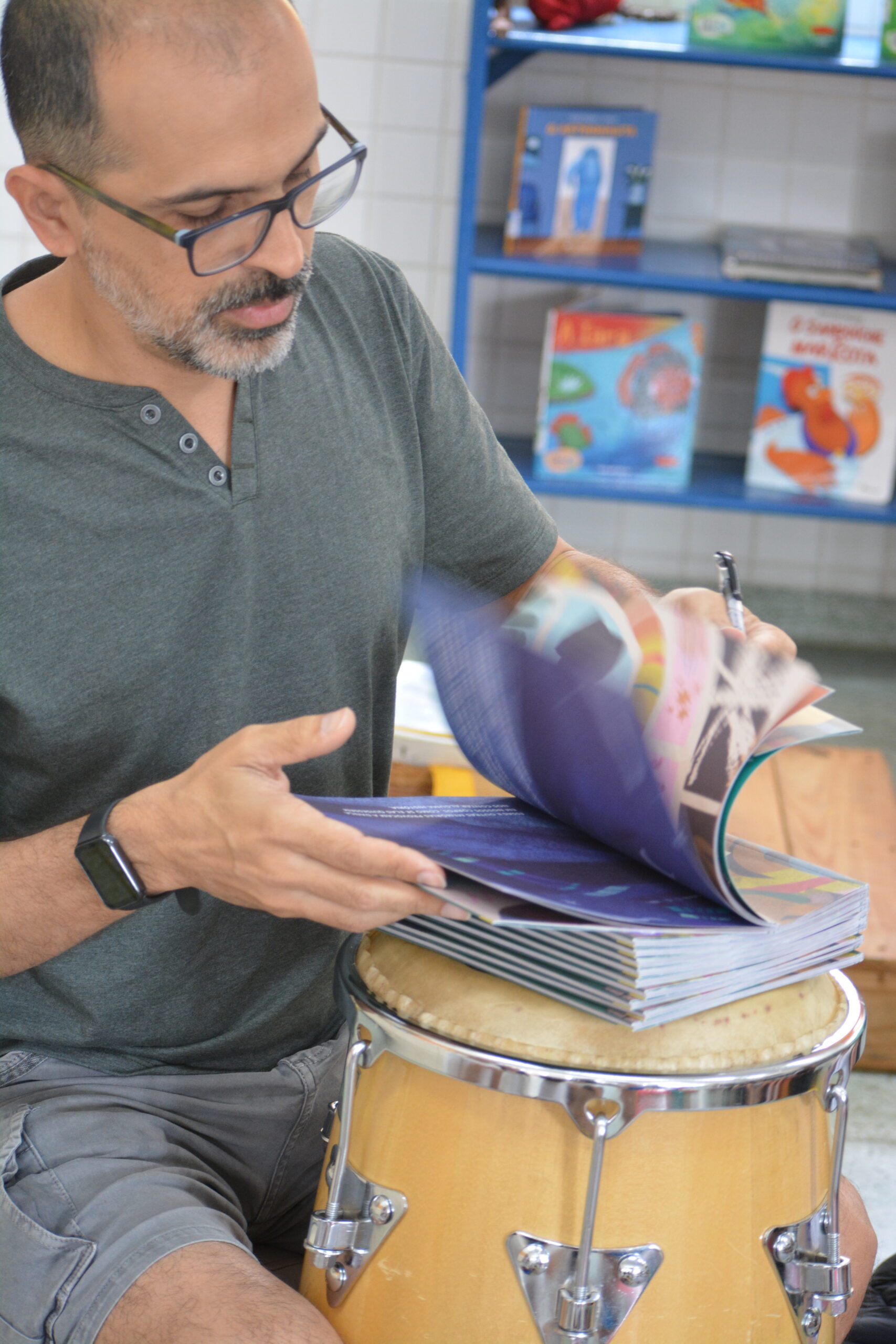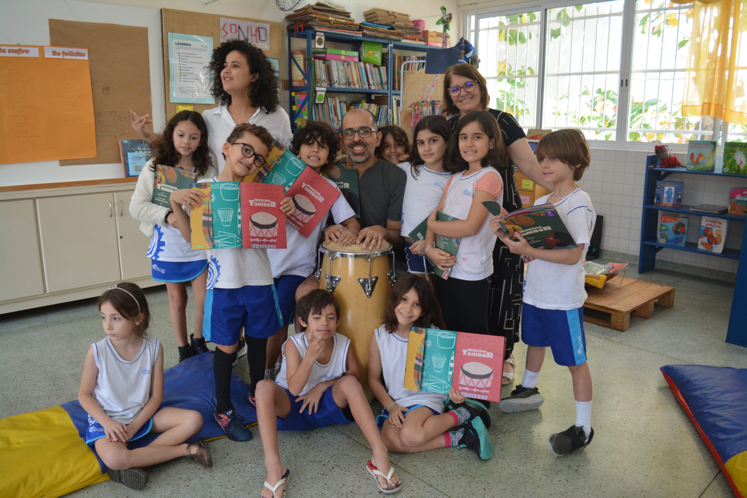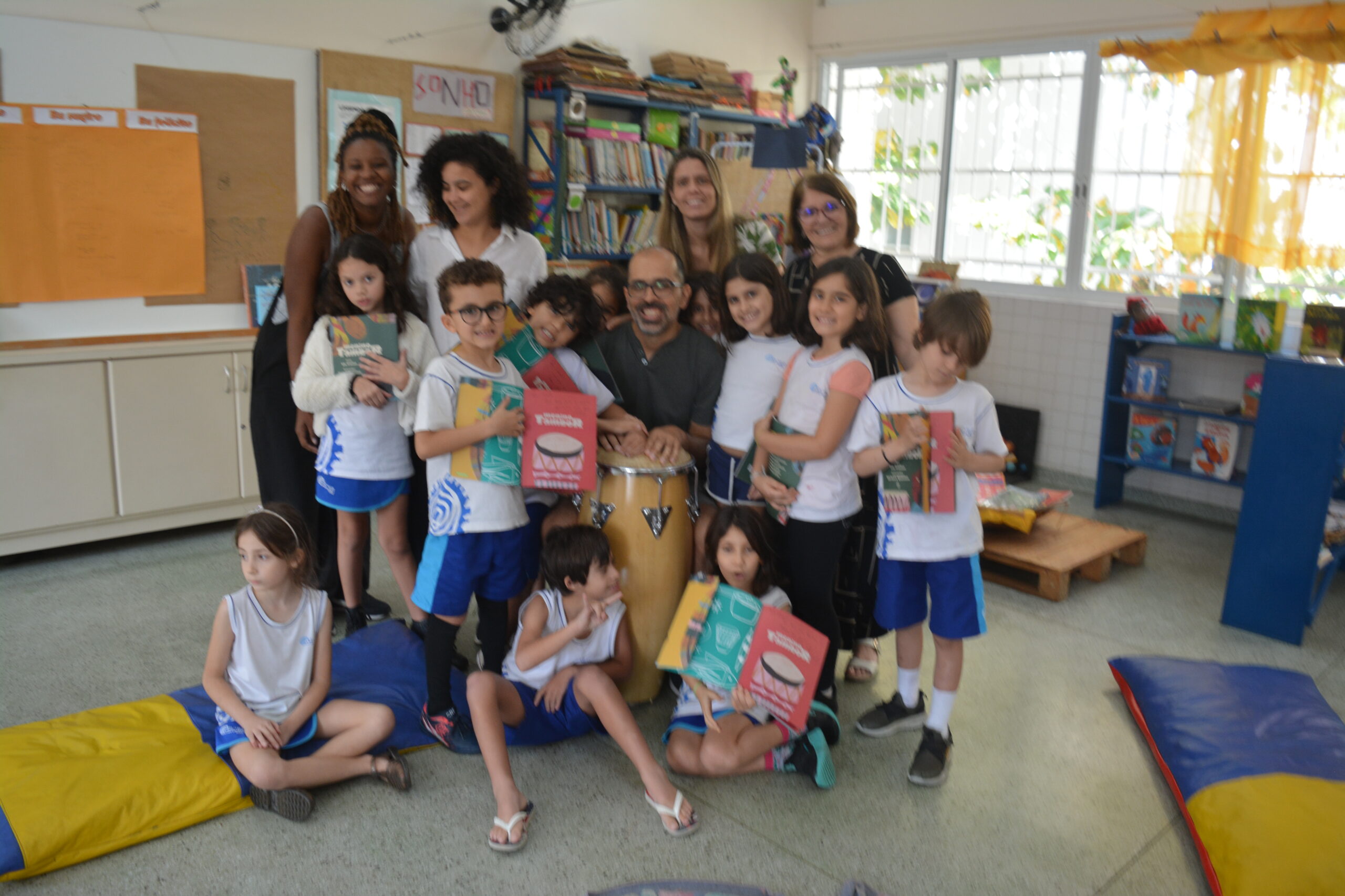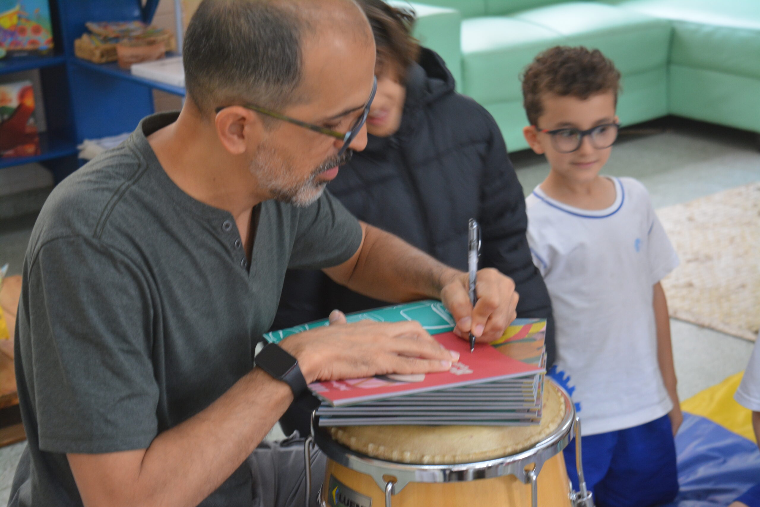 A partir da leitura do livro “Menino Tambor“, escolhido para costurar os estudos relacionados à cultura africana nas turmas do 2º ano do Ensino Fundamental, recebemos a visita do autor dessa história, Edu Prestes.