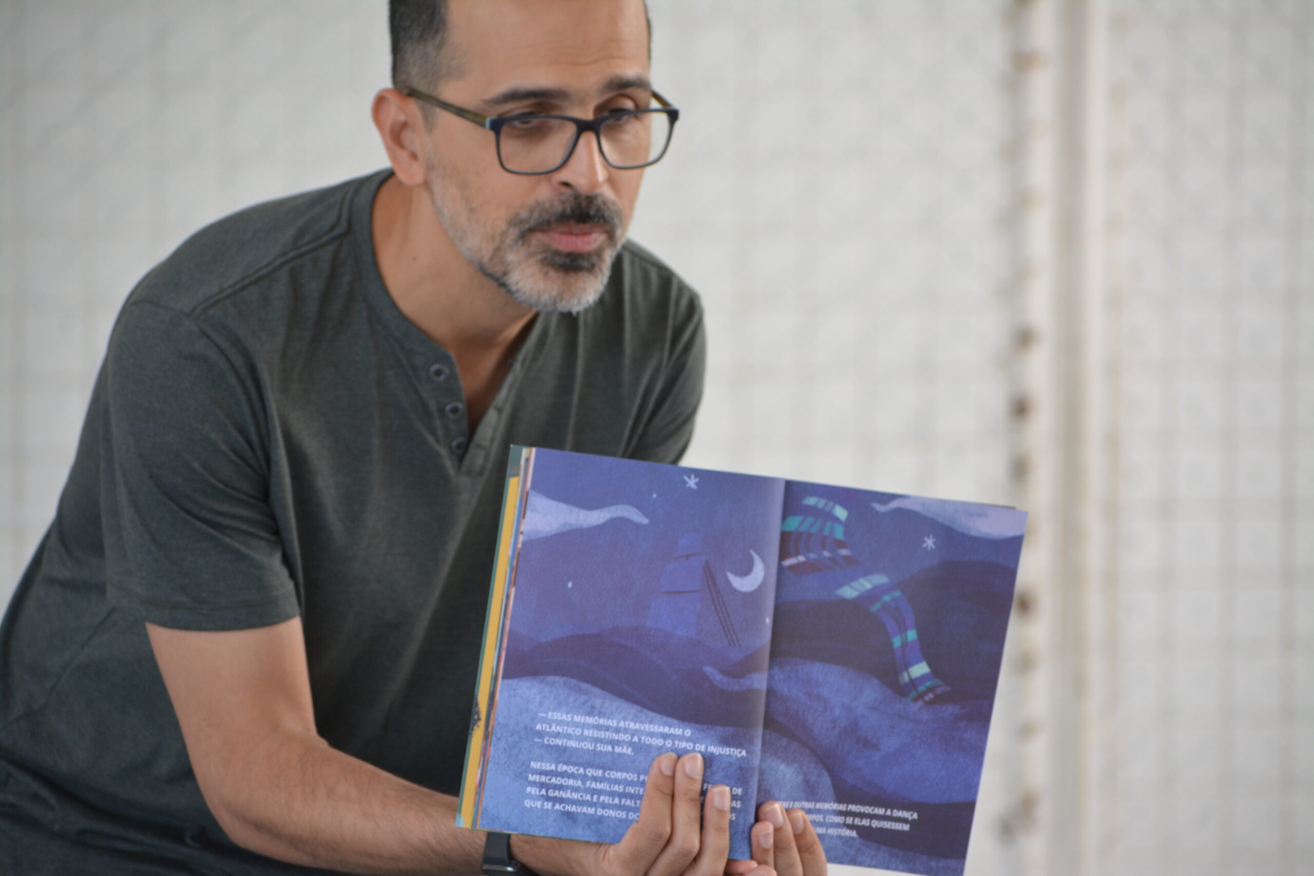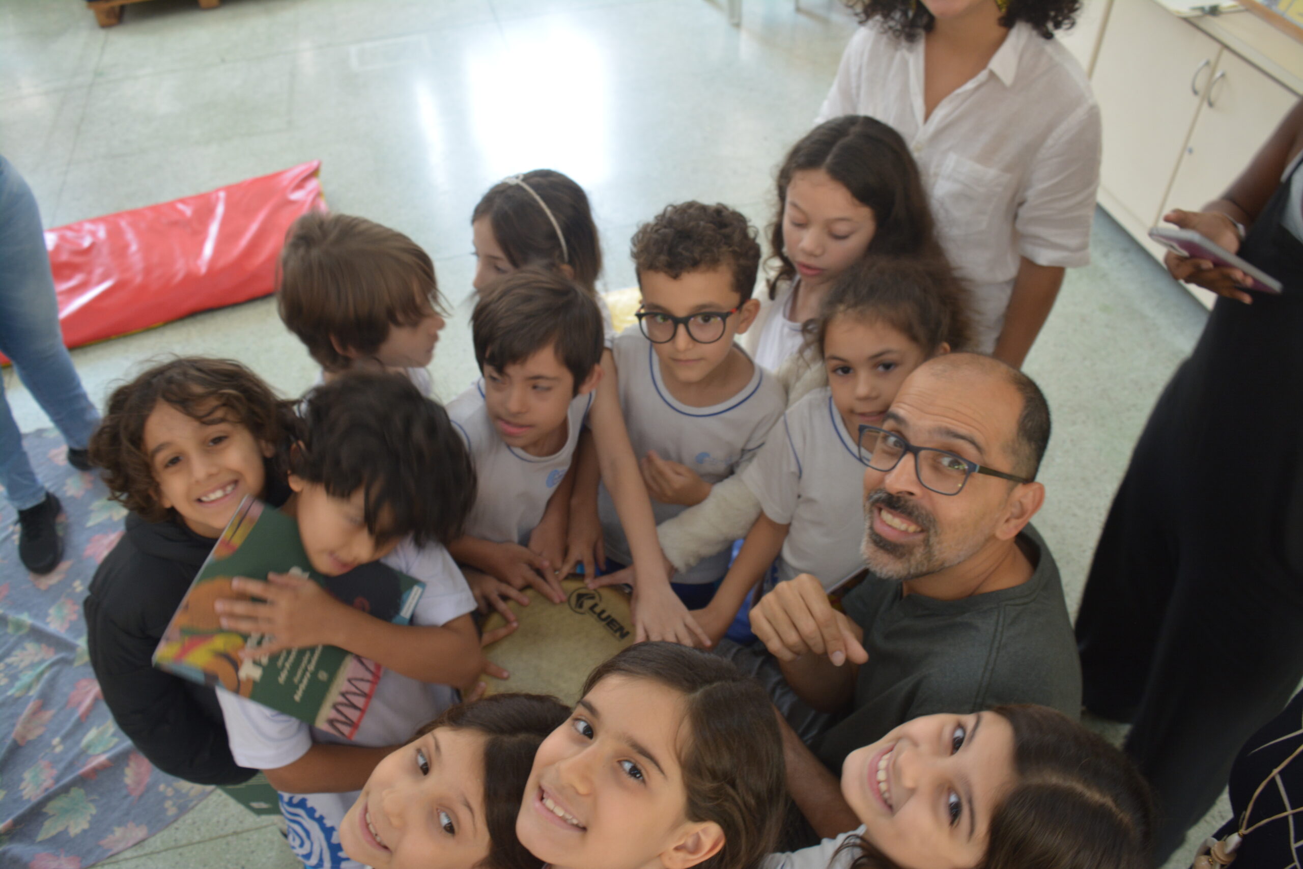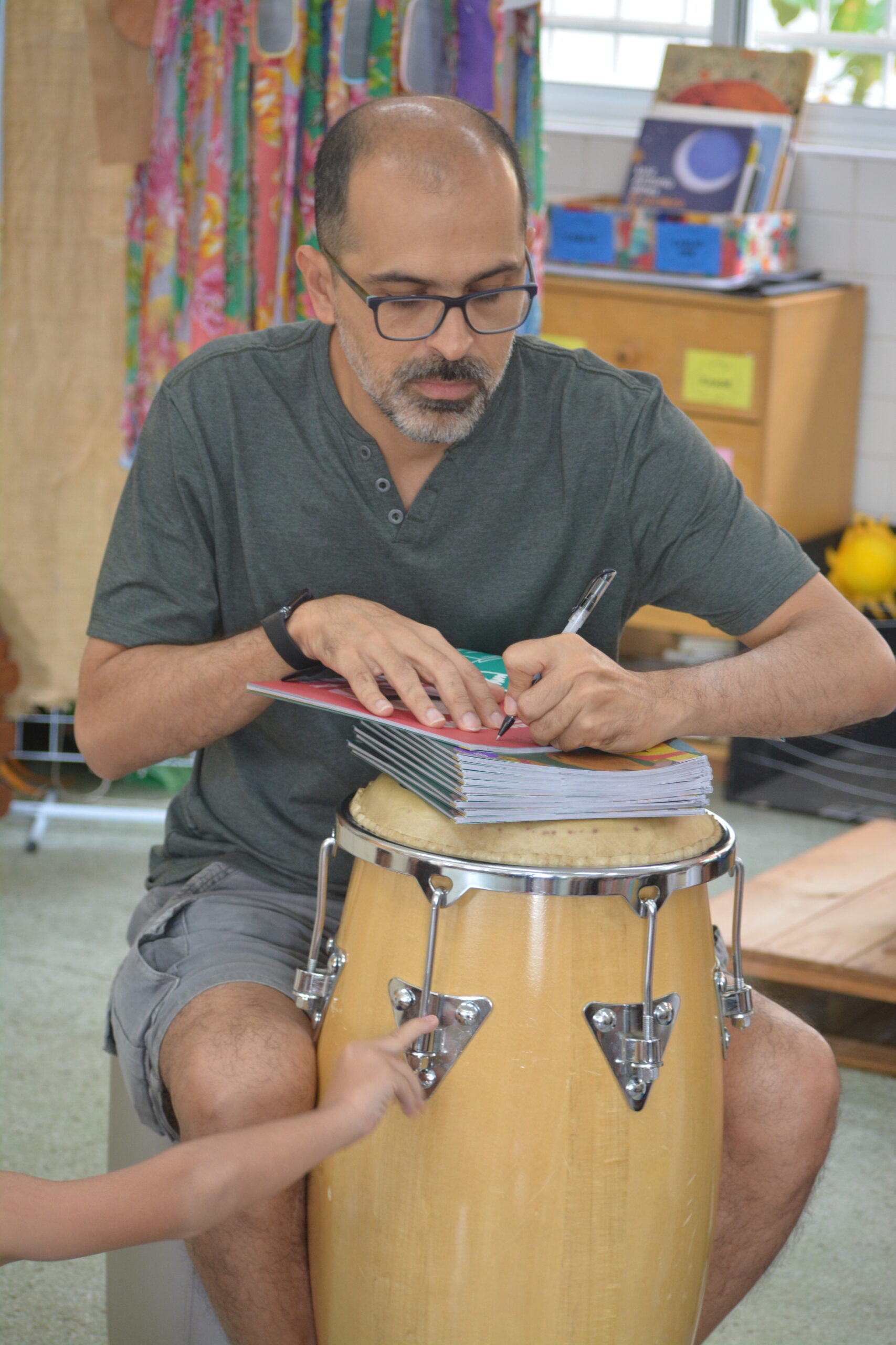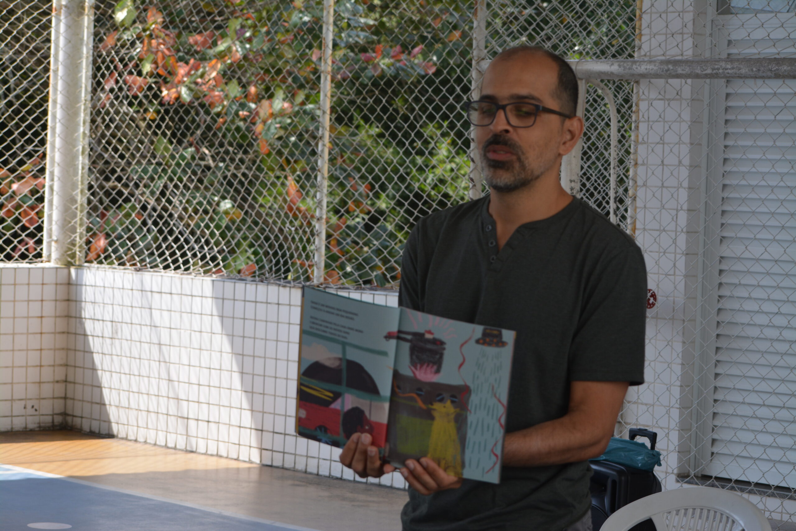 A partir da leitura do livro “Menino Tambor“, escolhido para costurar os estudos relacionados à cultura africana nas turmas do 2º ano do Ensino Fundamental, recebemos a visita do autor dessa história, Edu Prestes.